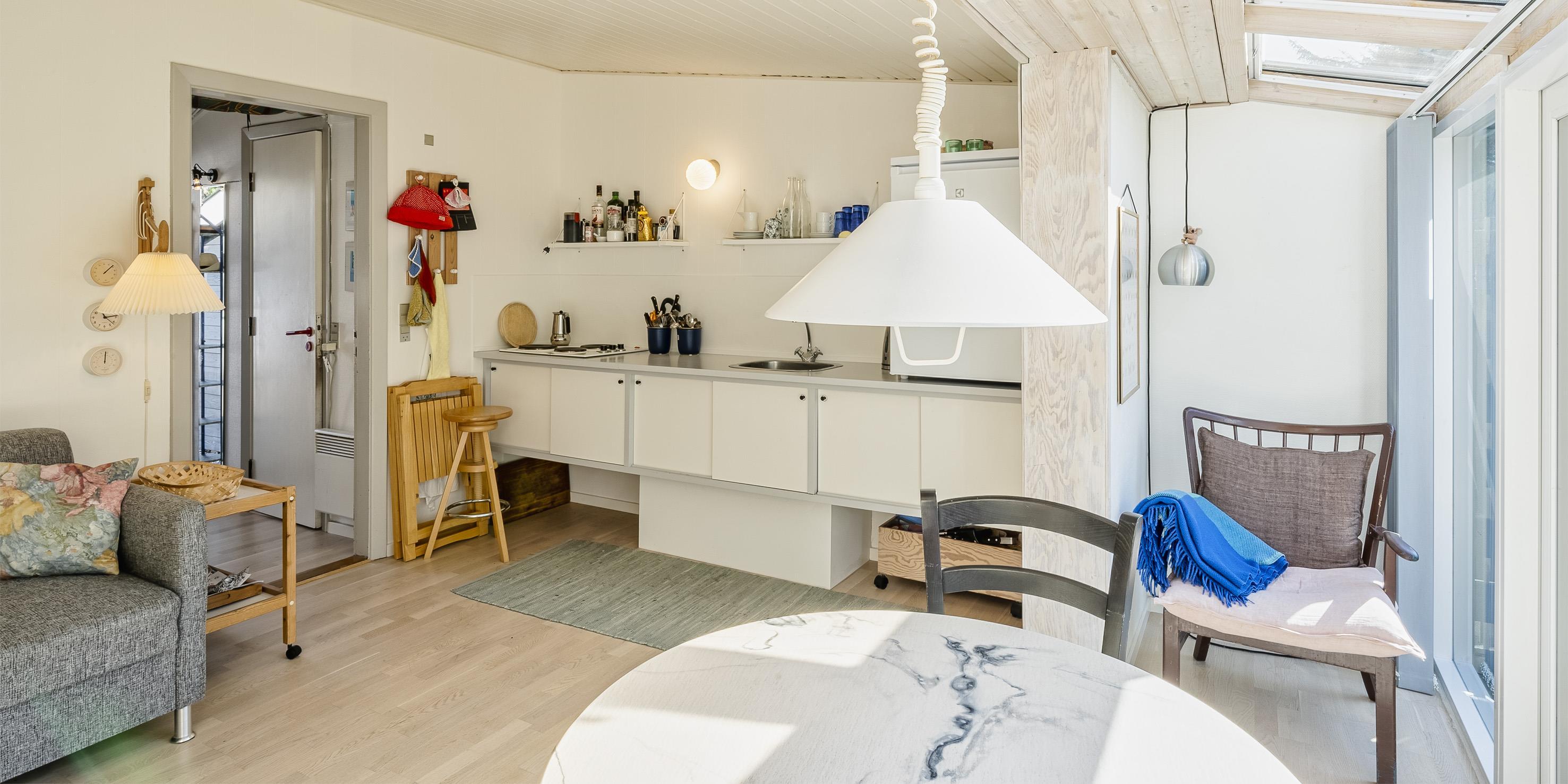 Lejligheden er 32 m2 og fremstår lyst. Indeholder.: Entre/indgang. Åbent opholdsrum med stue, køkken og spiseplads. Køkken med køleskab og mini-ovn. Dejlig spiseplads med udsigt til terrassen samt udgang til en rigtig hyggelig lille solrig terrasse (mod syd) med gas-grill (sommer). Stue med sovesofa og trådløs internet. Der er ingen fjernsyn i lejligheden. Soveværelset er i åben forbindelse med gangen, DS. Badeværelset er med bruser, håndvask og toilet. Rygning og husdyr er ikke tilladt. Der er mulighed for at benytte swimmingpoolen ved Familie Camping for et symbolsk beløb. Byggeår 1961. Hyggelige fællesområder med bænke og bålplads. 1 parkeringsplads udenfor rækkehuset.
