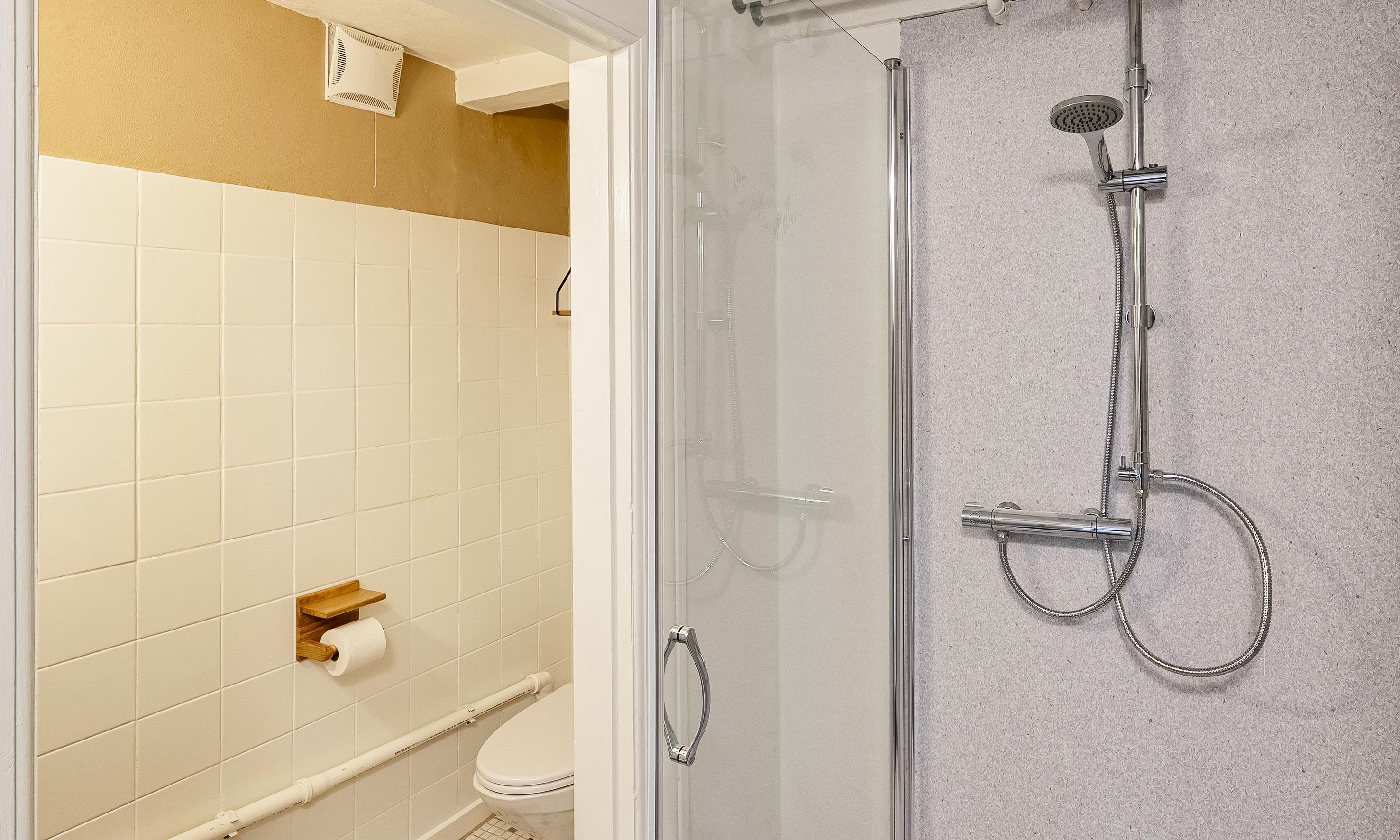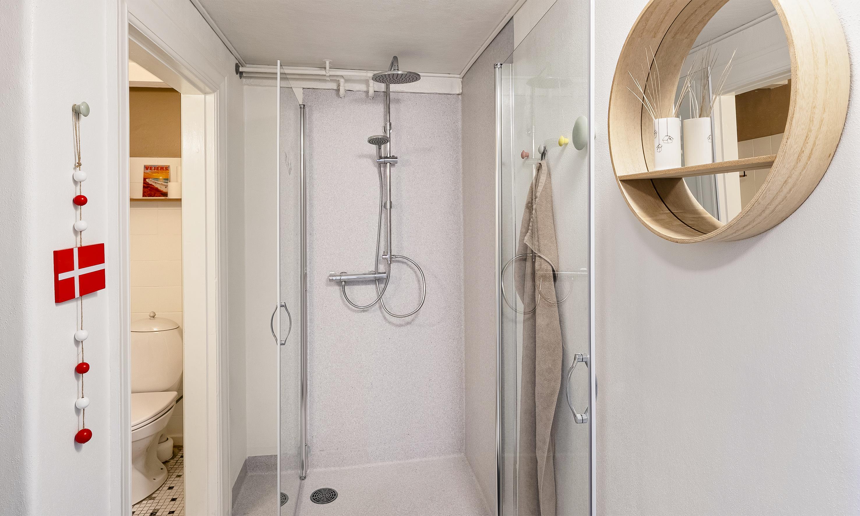 Bad med toilet, bruser og vask