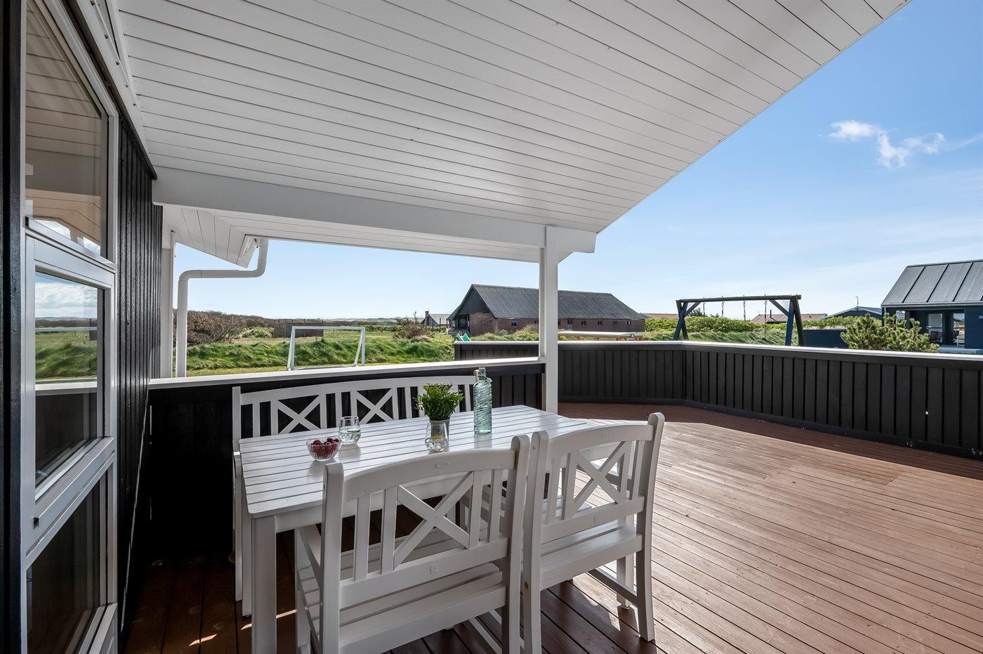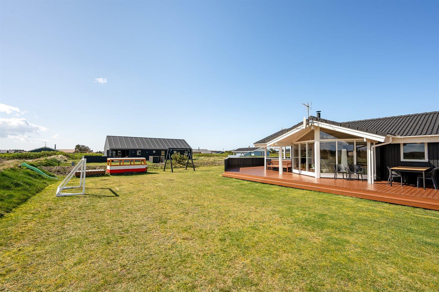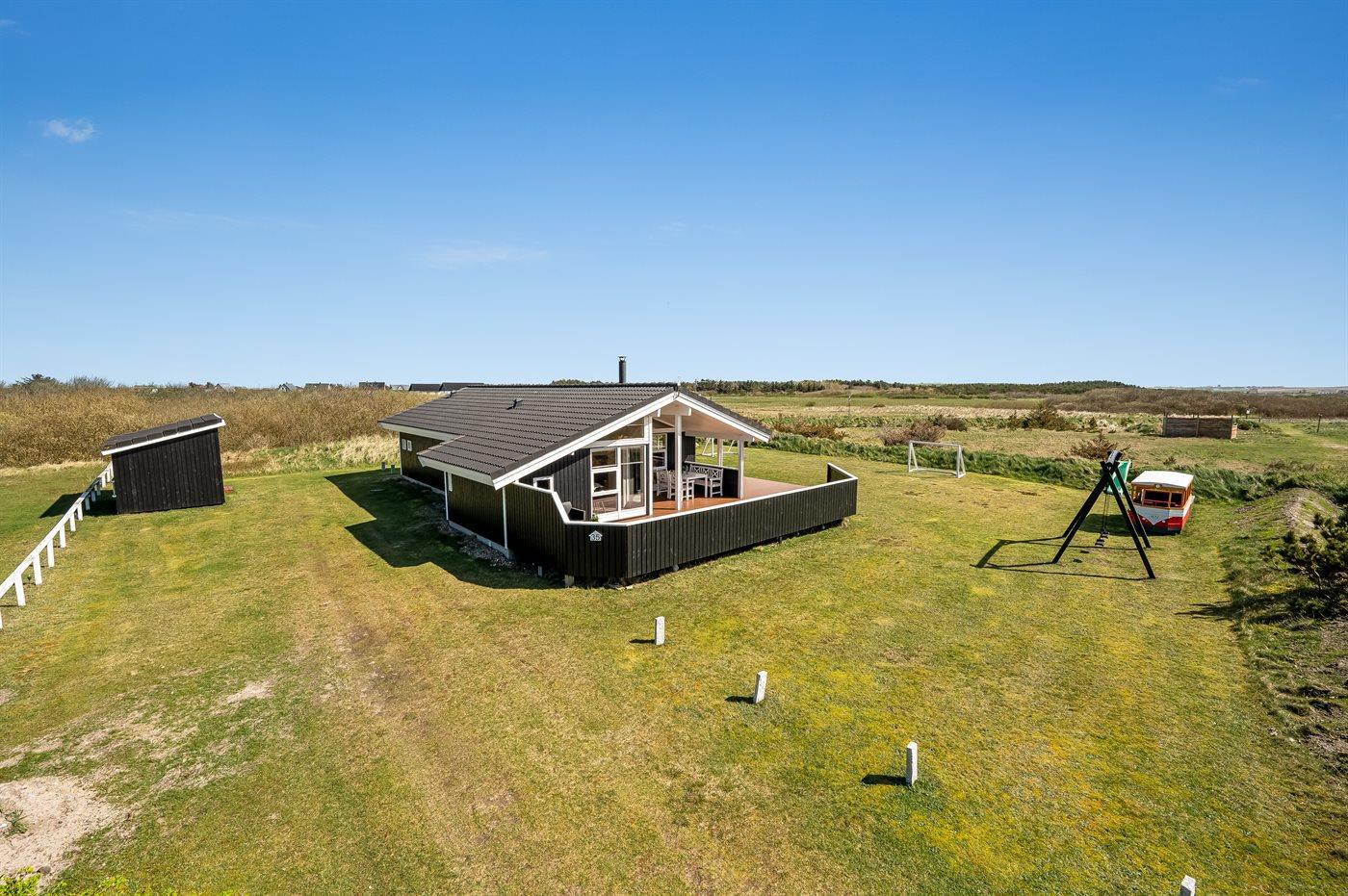 Ferieboligen er beliggende på en 1200 m² stor klitgrund. Der er 650 m til havet. Nærmeste forretning er beliggende i en afstand af 300 m. Til ferieboligen hører åbent terrasseareal. Desuden er der overdækket terrasse. Gynge. Sandkasse. Legehus. Fodboldmål. Bålsted. Der er installeret stik til opladning af elbil. Type 2 stik. Parkering ved ferieboligen.