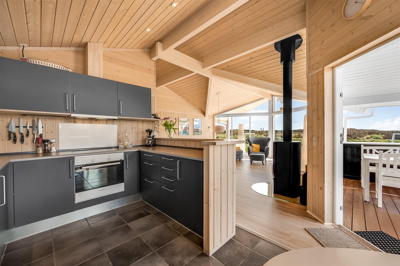 Køkkenet er udstyret med 1 køleskab. Der er 4 keramiske kogeplader, varmluftovn, mikrobølgeovn samt opvaskemaskine.