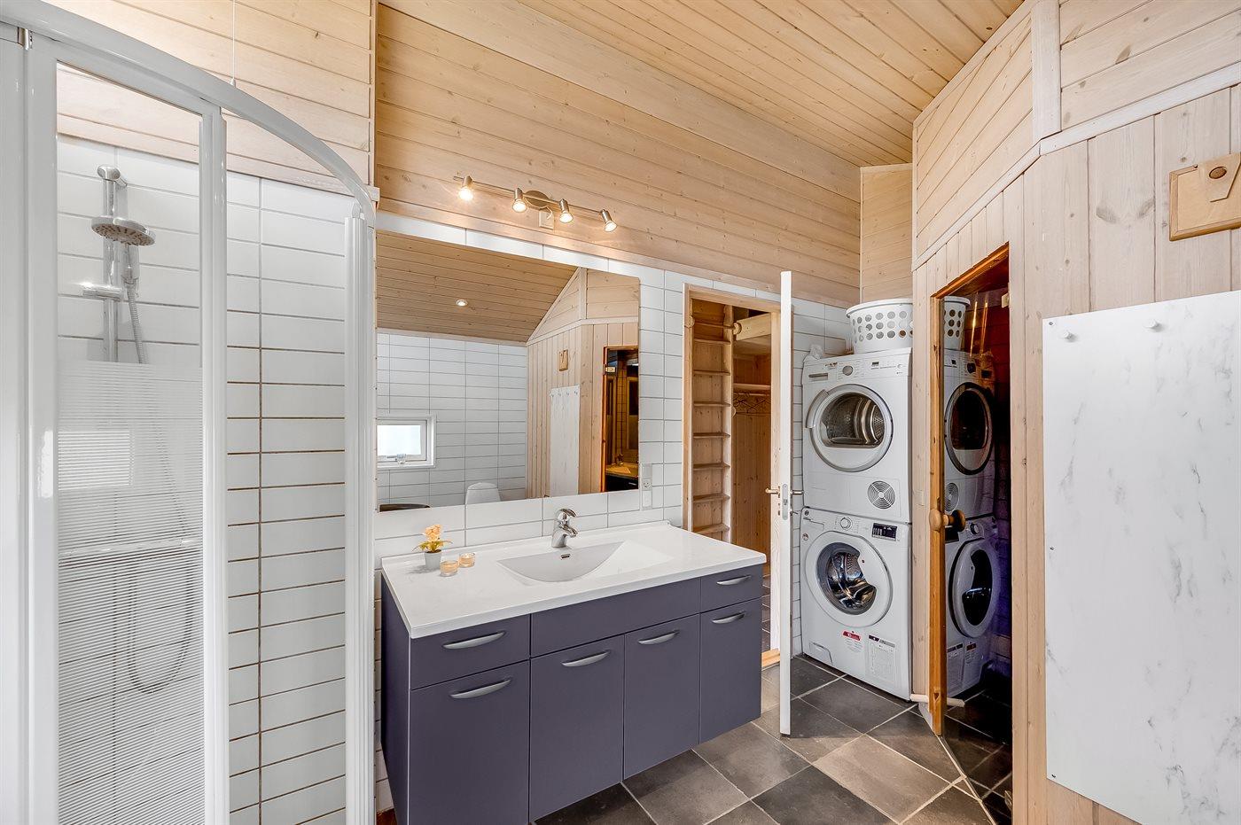 Der er 1 badeværelse med bruseniche og 2 toiletter, heraf 1 gæstetoilet. Der er gulvvarme på 2 badeværelser. I saunaen er der mulighed for afslapning.