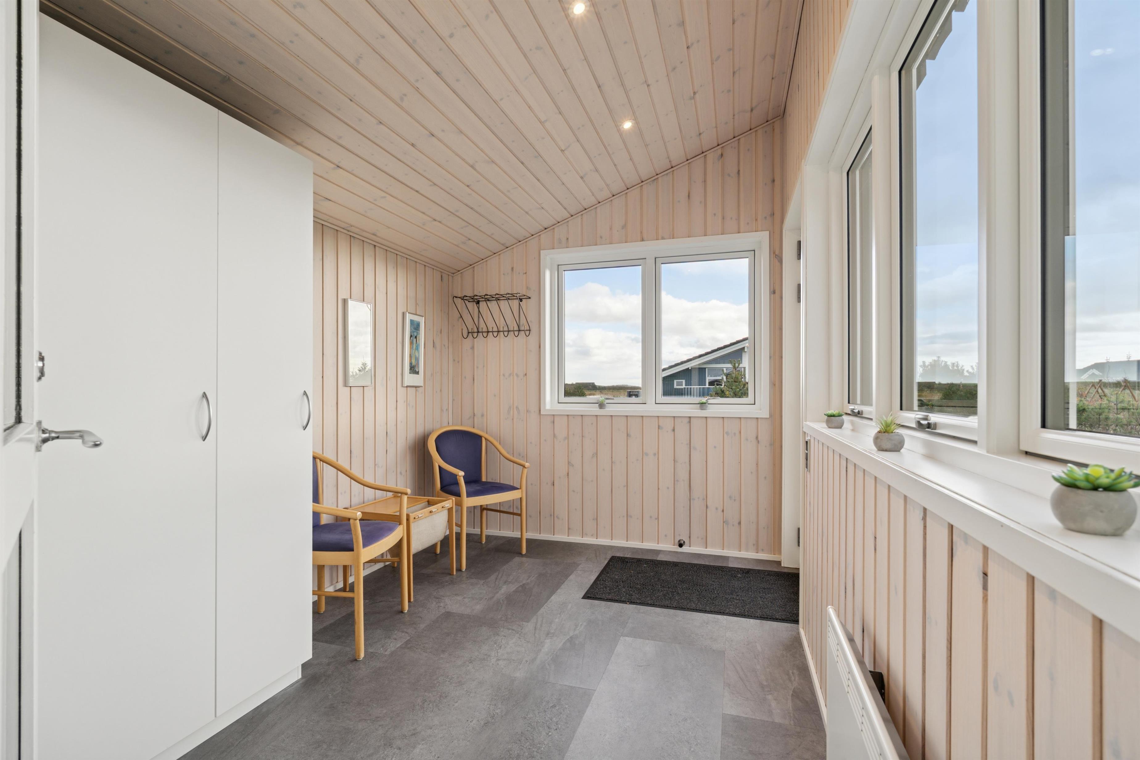 Det rummelige badeværelse er indrettet med bruser, toilet og håndvask og byder desuden på spa, sauna og gulvvarme, så I kan forkæle jer selv efter en dag ved stranden eller på vandretur. Der er også vaskemaskine til rådighed.