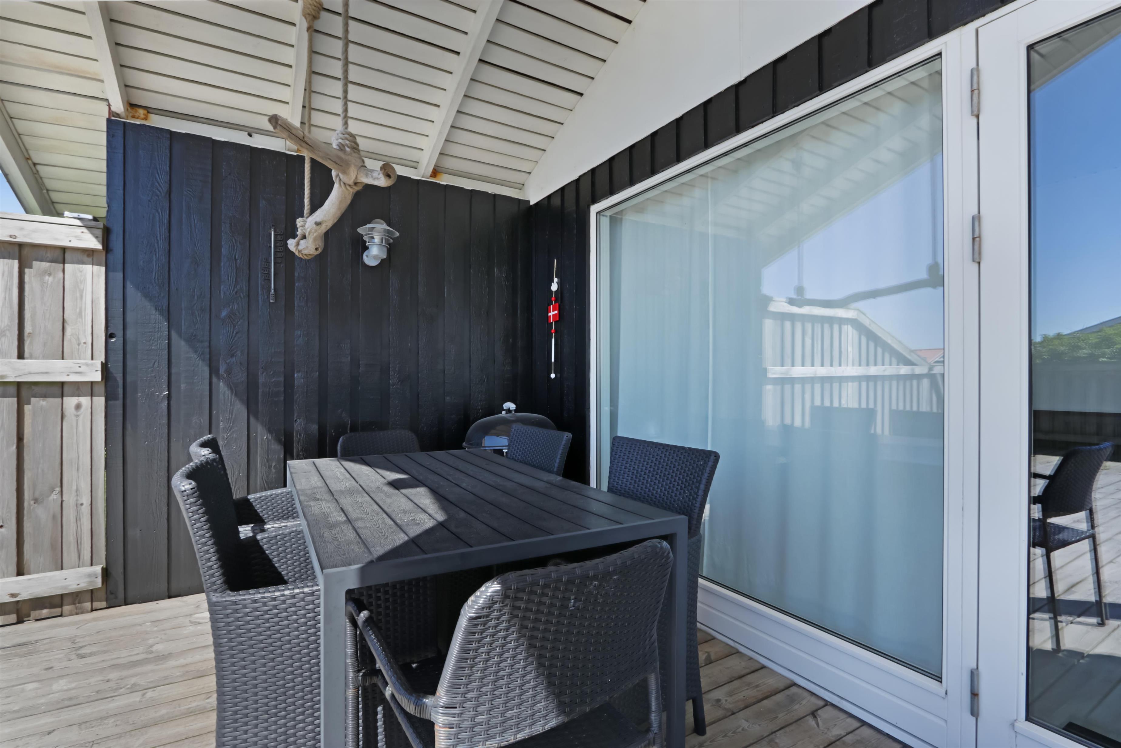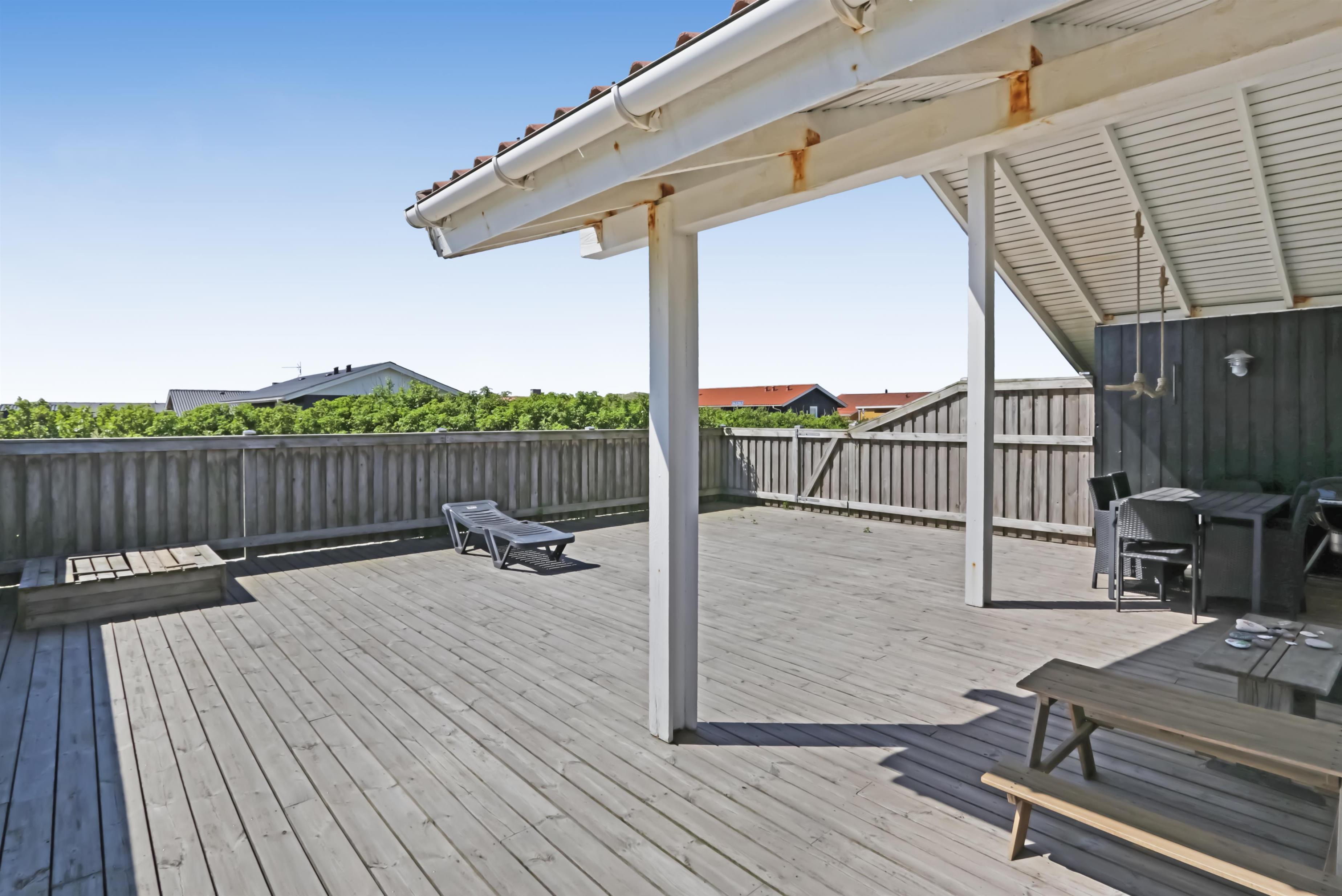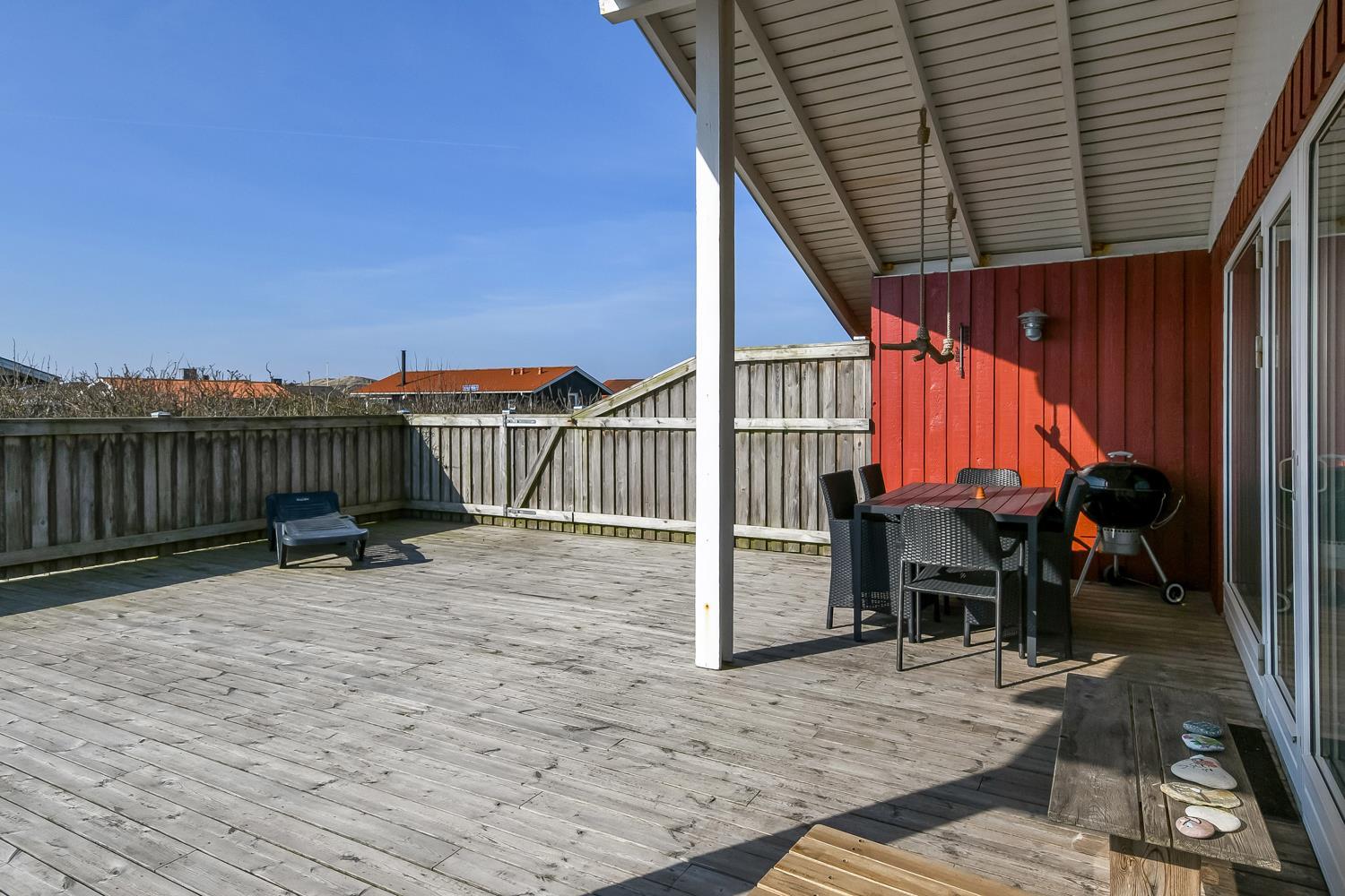 Udgang til flot, stor og delvis overdækket træterrasse med havemøbler, solvogne og grill. Velholdt, indhegnet grund med gynger og sandkasse samt mange muligheder for udendørs aktivitet. Et flot feriehus med god plads og en fantastisk velplejet grund. Medbringes børn og husdyr, er det optimalt, at de kan løbe rundt på den indhegnede gund. Tæt ved restaurant, indkøb samt Vesterhavet. Området er karakteriseret med ekseptionel natur, som udover det brusende Vesterhav også byder på barske klitter og smukke lyngarealer.