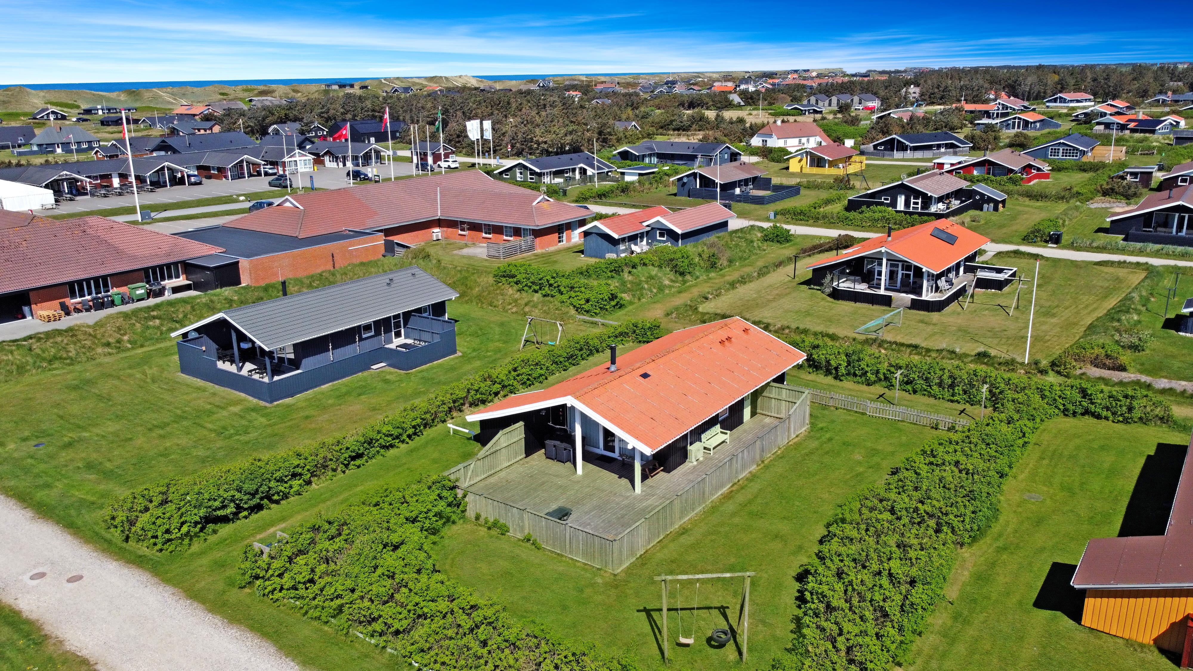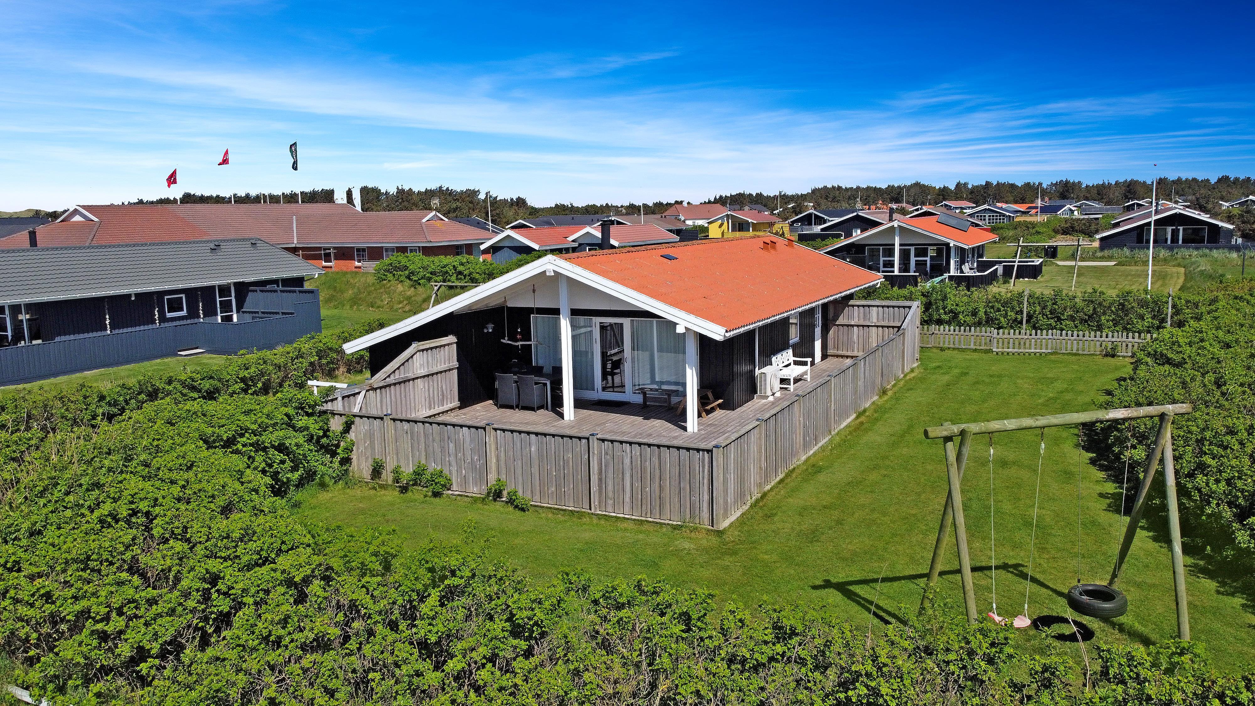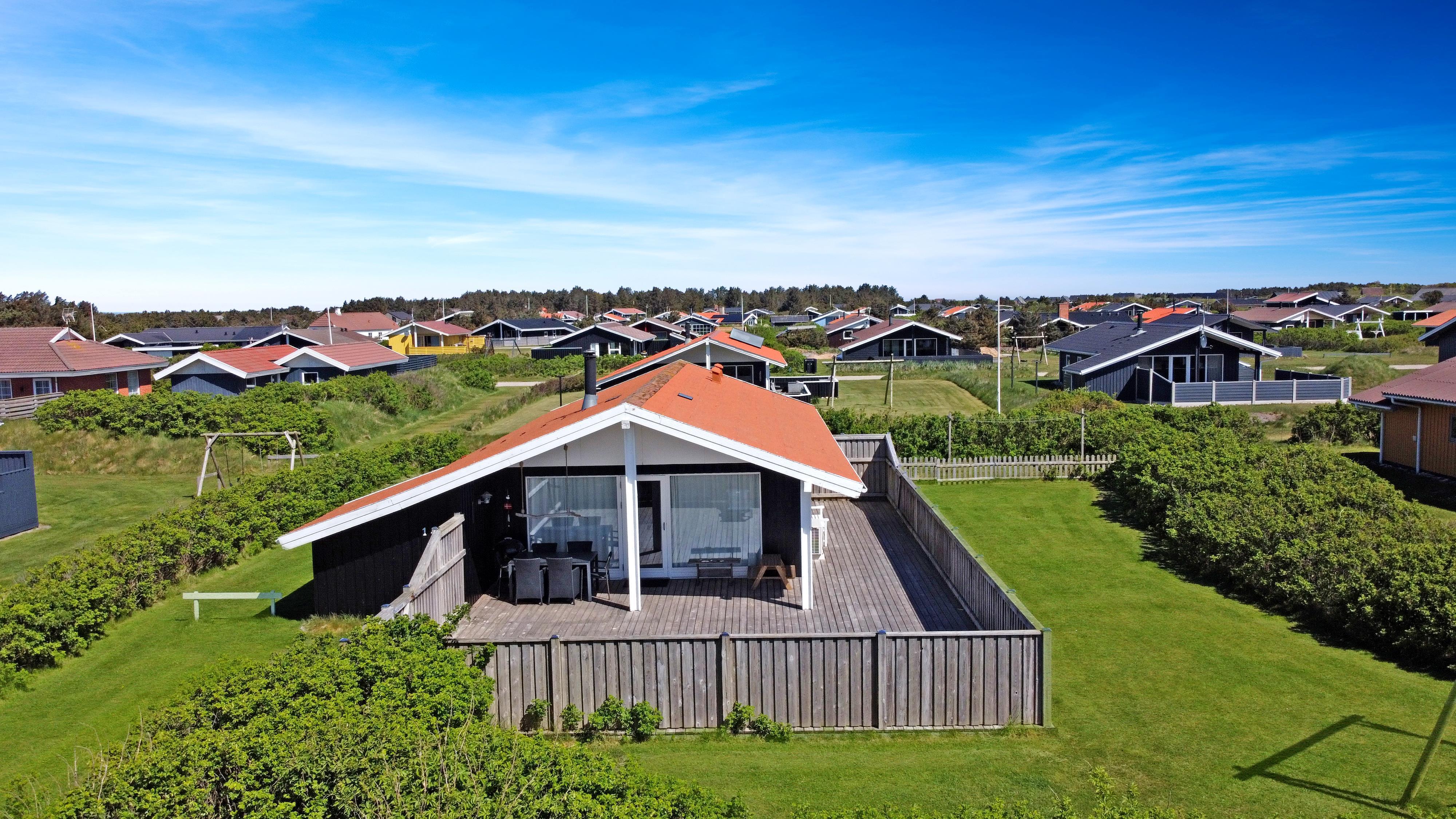 Udgang til flot, stor og delvis overdækket træterrasse med havemøbler, solvogne og grill. Velholdt, indhegnet grund med gynger og sandkasse samt mange muligheder for udendørs aktivitet. Et flot feriehus med god plads og en fantastisk velplejet grund. Medbringes børn og husdyr, er det optimalt, at de kan løbe rundt på den indhegnede gund. Tæt ved restaurant, indkøb samt Vesterhavet. Området er karakteriseret med ekseptionel natur, som udover det brusende Vesterhav også byder på barske klitter og smukke lyngarealer.