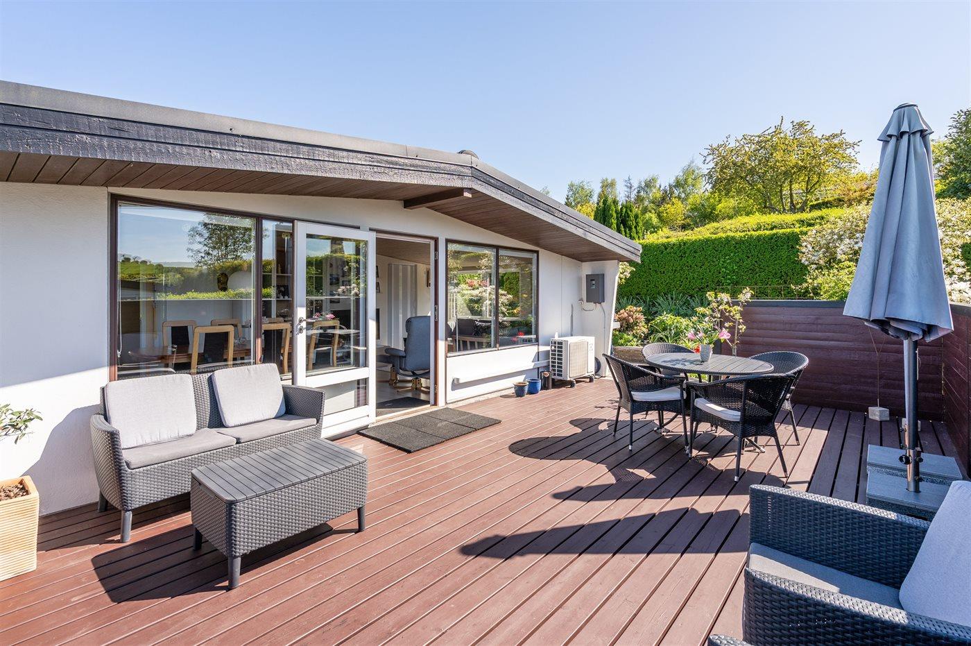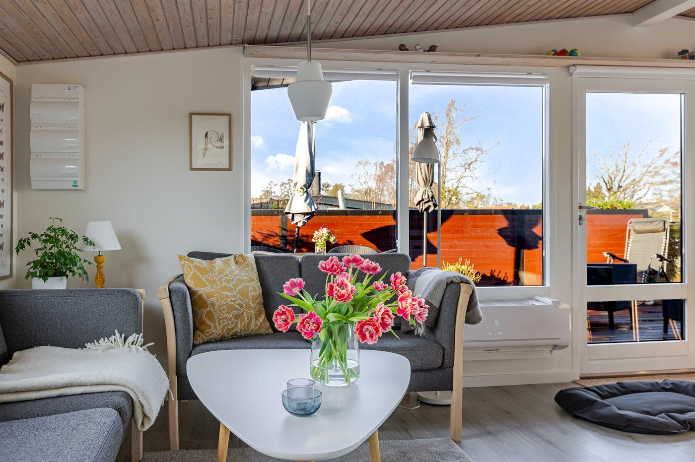 Den store terrasse udenfor flyder naturligt sammen med stuen og fungerer som en udendørs forlængelse af opholdsrummet – perfekt til afslapning hele dagen. Rundt om huset findes flere terrasser, så der er altid et sted at nyde en god bog, en kop kaffe eller solens varme stråler.