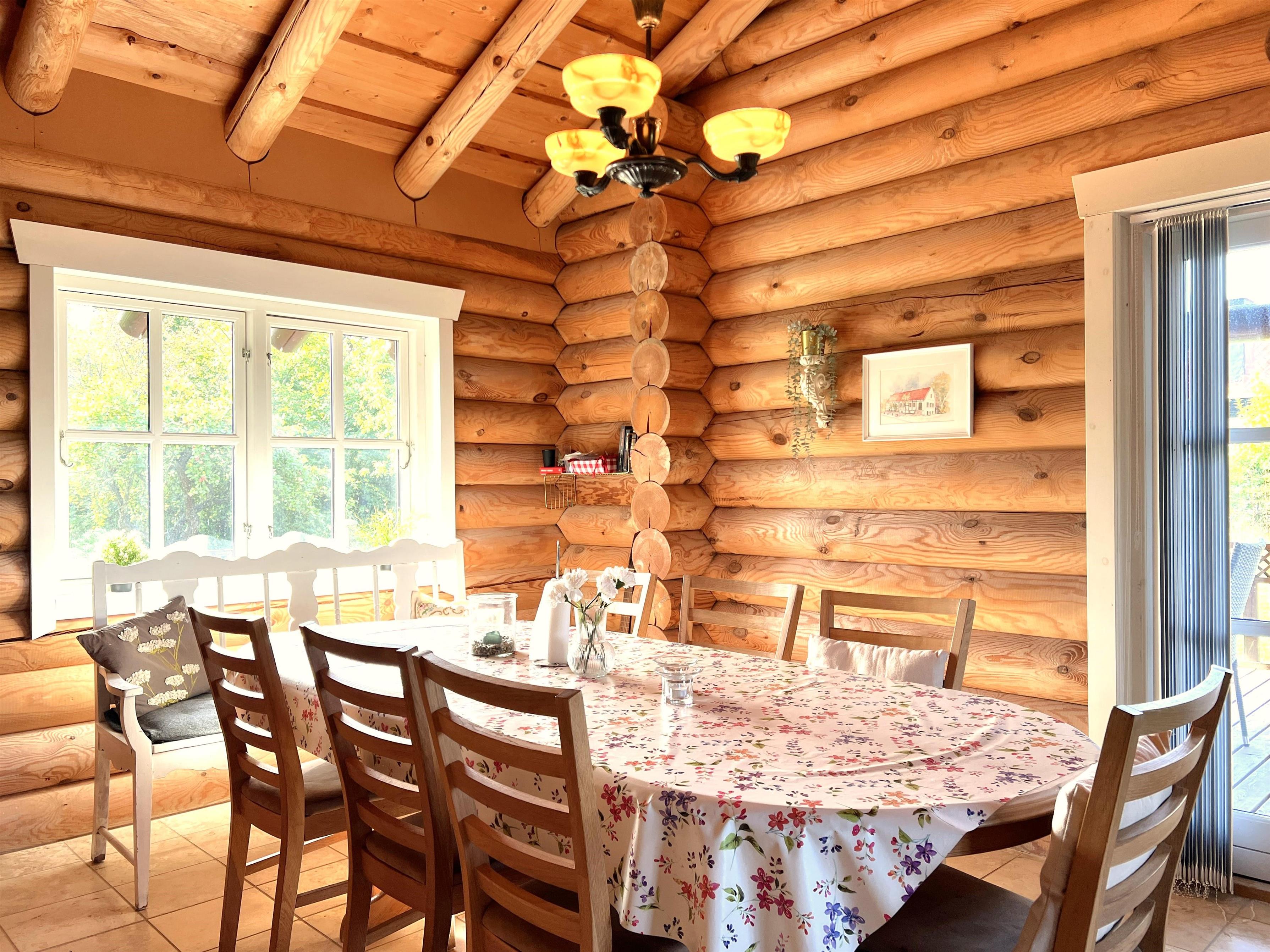 Et rigtigt flot, rummeligt bjælkehus med stor overdækket terrasse og smuk indhegnet have.