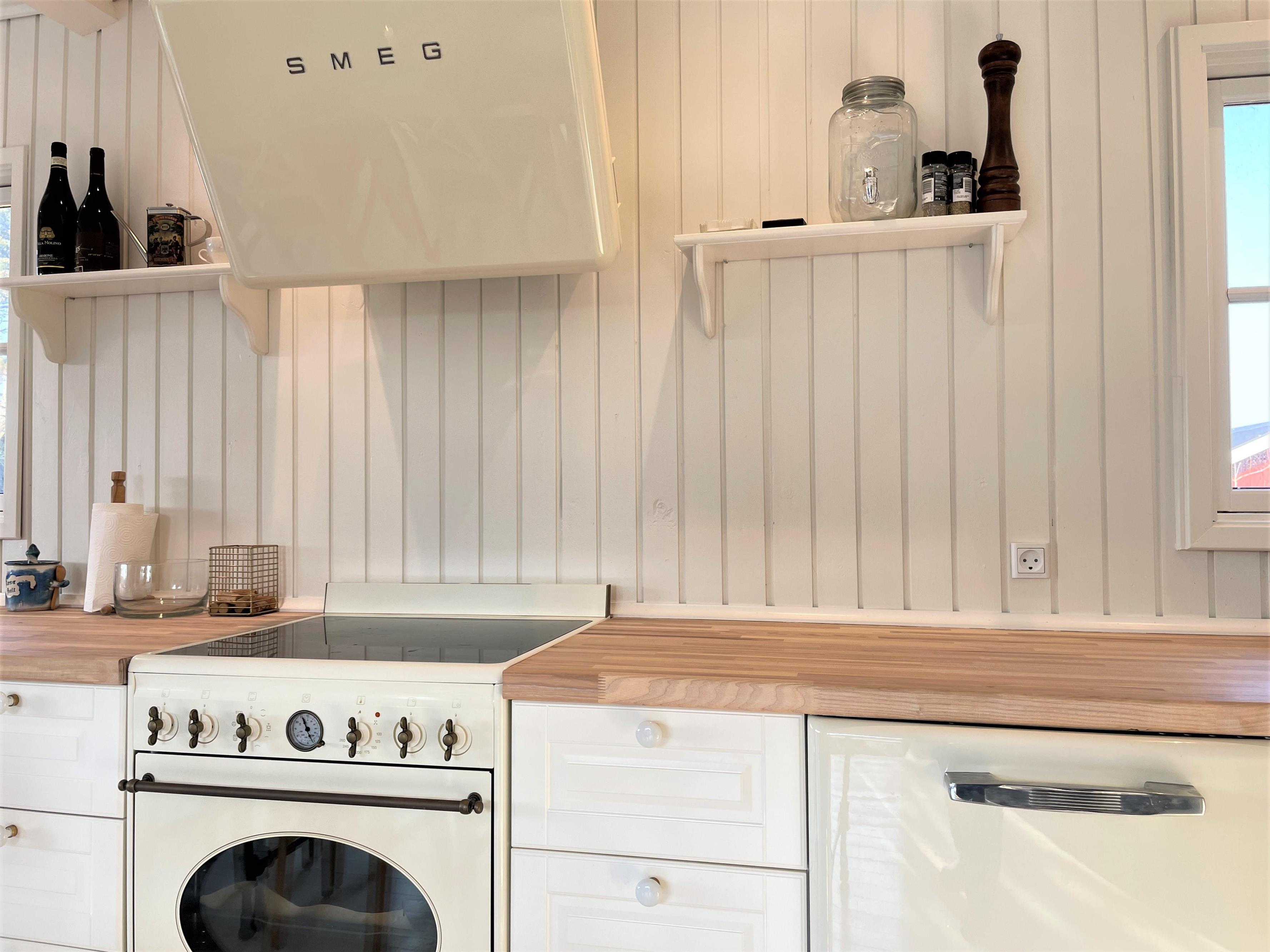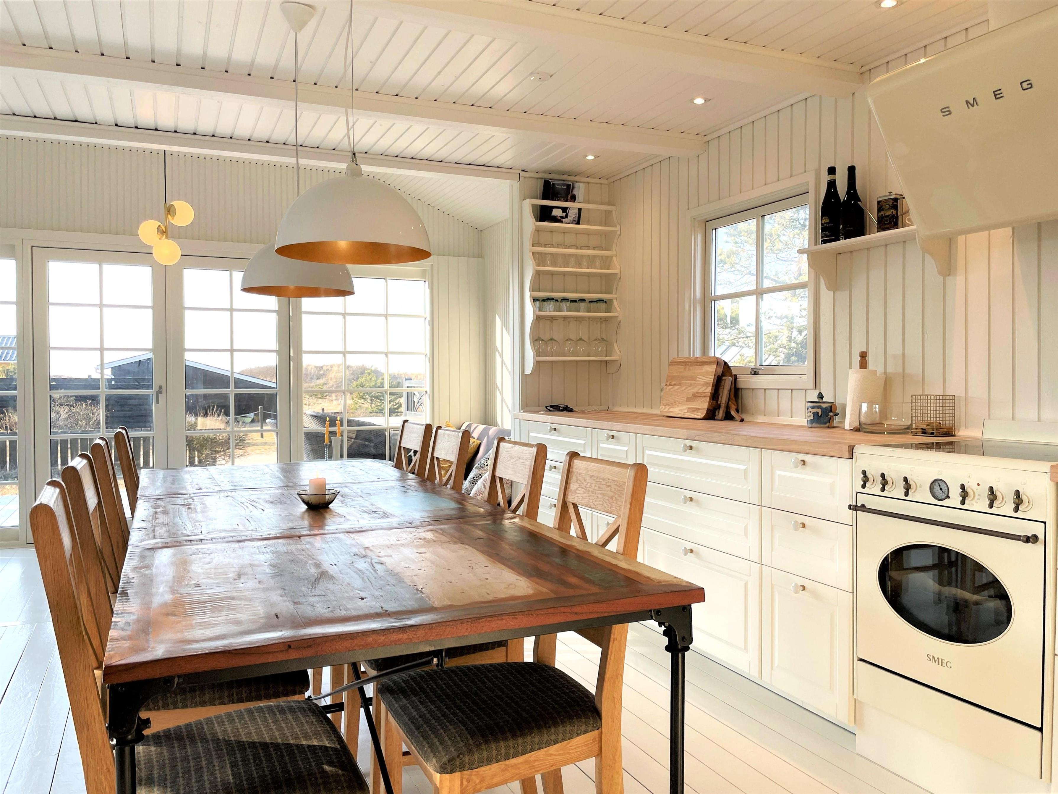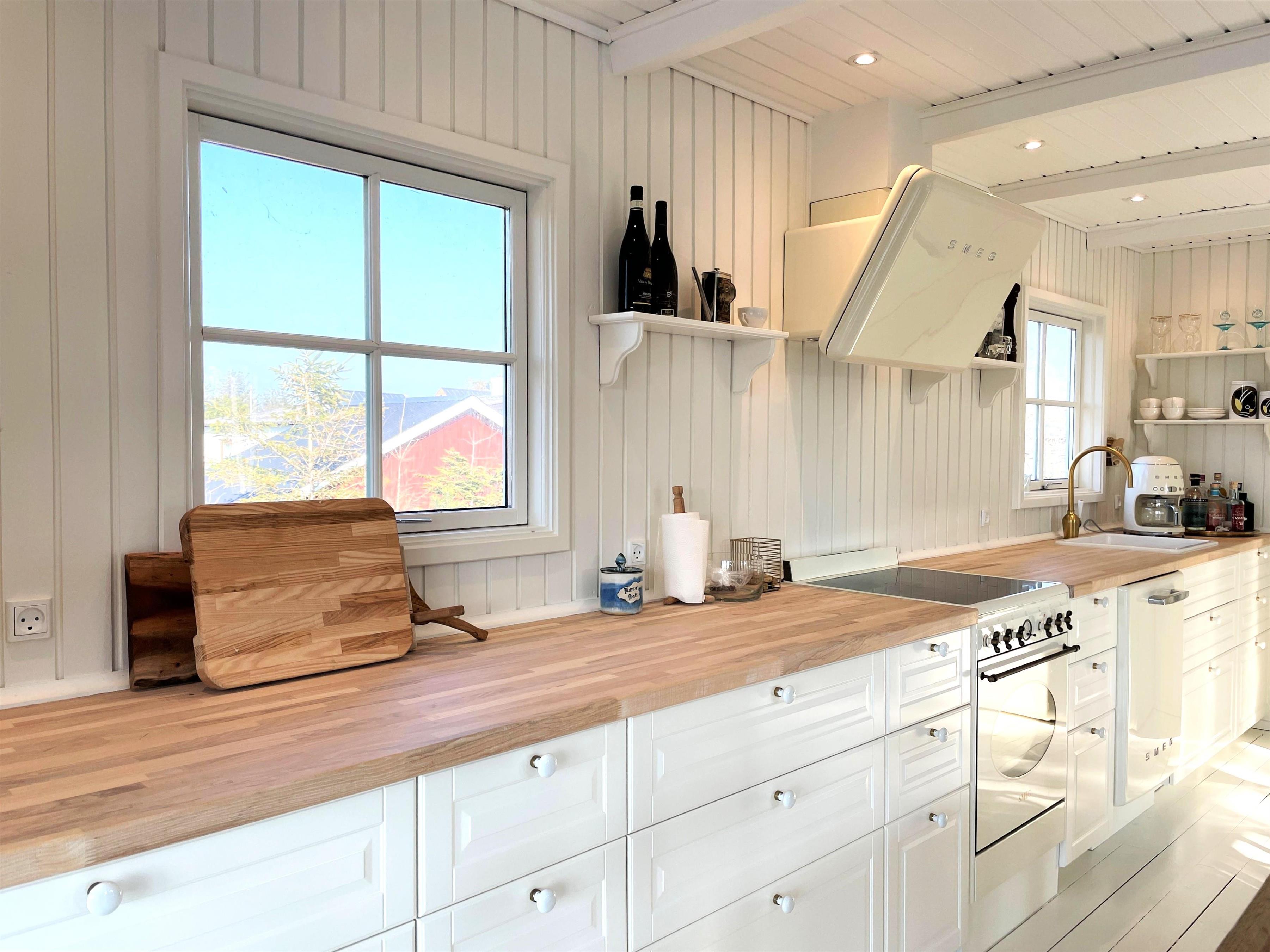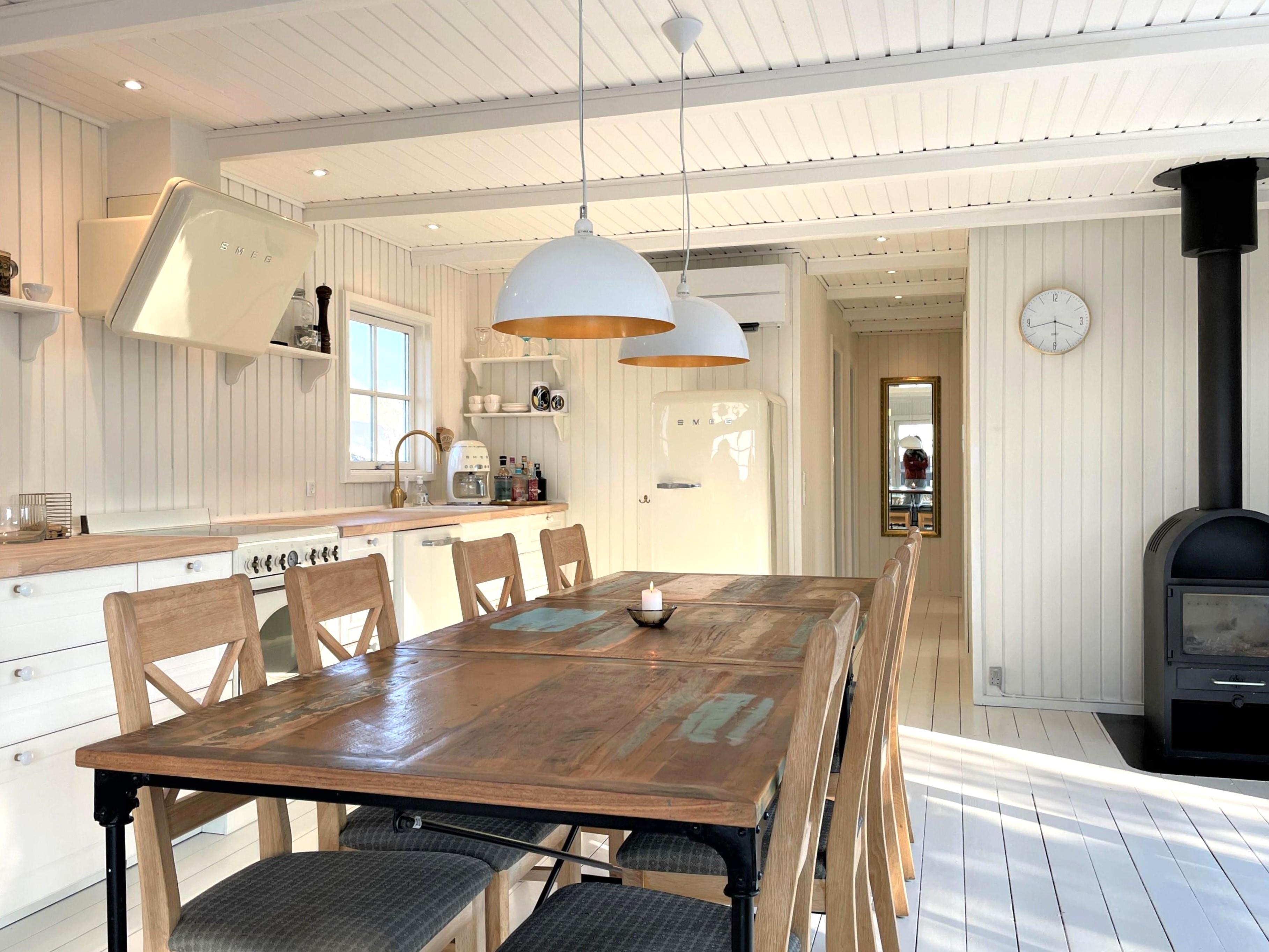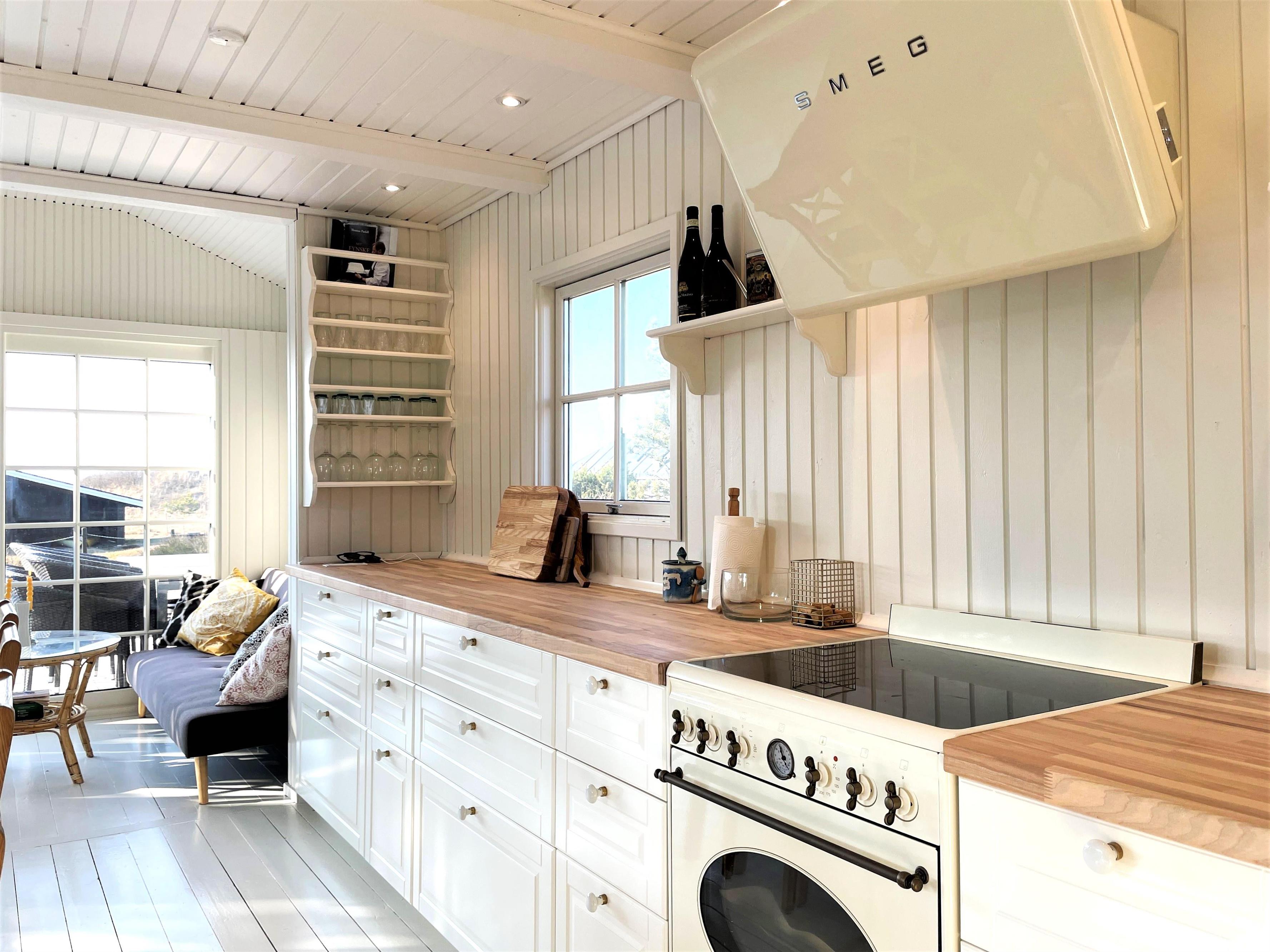 Huset er smagfuldt indrettet og med respekt for at bevare den hyggelige sommerhusstil. Lyst, lækkert køkken-alrum med moderne køkken, som er forsynet med hårde hvidevarer fra kvalitetsproducenten, SMEG. Flot, stort spisebord midt i rummet, som giver mulighed for at invitere gæster samt hyggelig sofaafdeling ud mod vandet. De store dobbeltdøre sikrer et flot lysindfald i hele rummet, og der er let adgang til den store træterrasse, hvor havemøbler og solstole findes. Huset har desuden tre soveværelser, et med dobbeltseng, et med to enkeltsenge samt et med køjeseng, der måler 190 cm. Nyt, moderne badeværelse med gulvvarme.