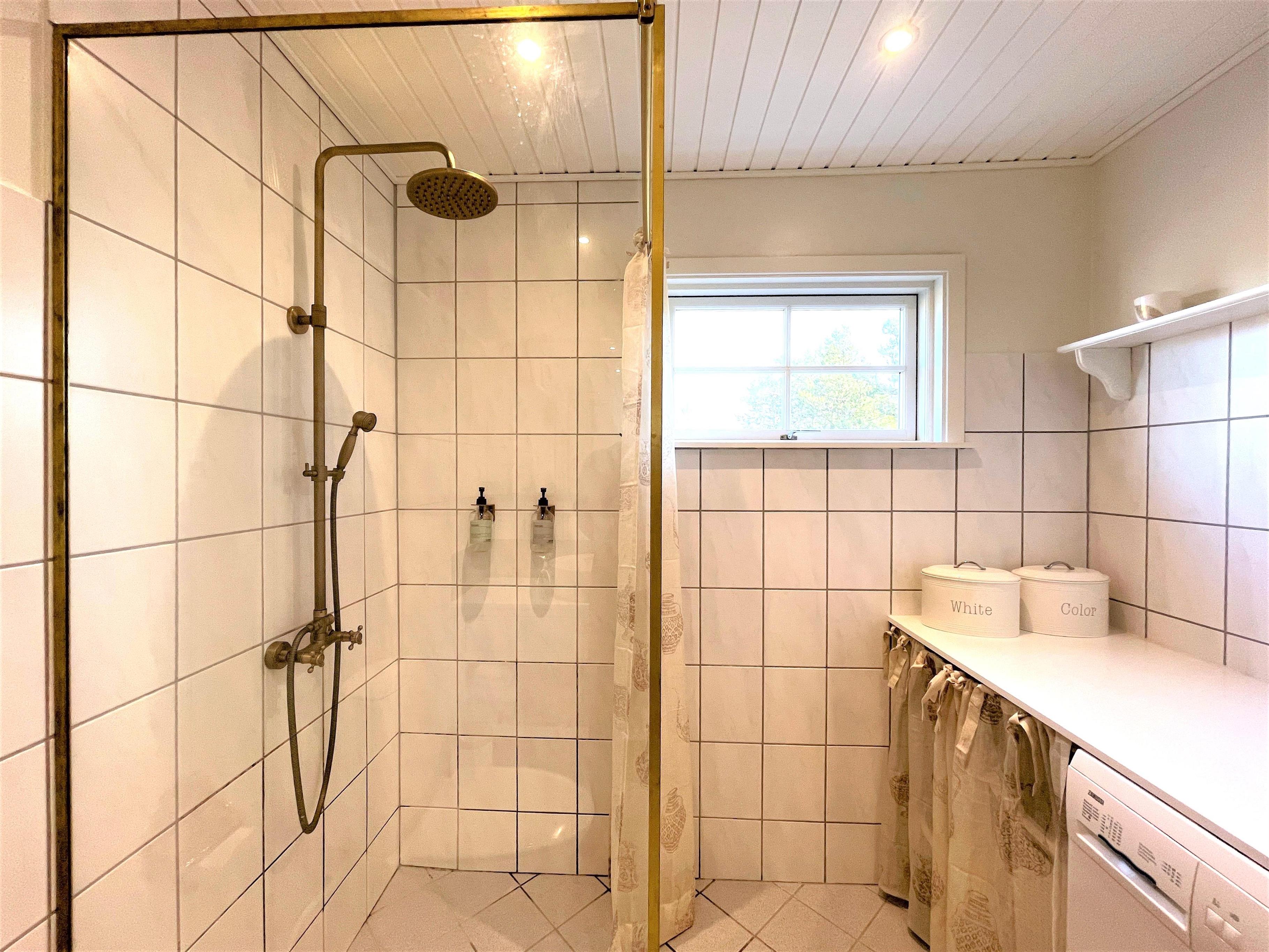 På husets træterrasse er der udtræk, der skaber ekstra læ, og man kan også benytte husets gasgrill. Udendørsbruser til at skylle sig, efter dagens strandtur.