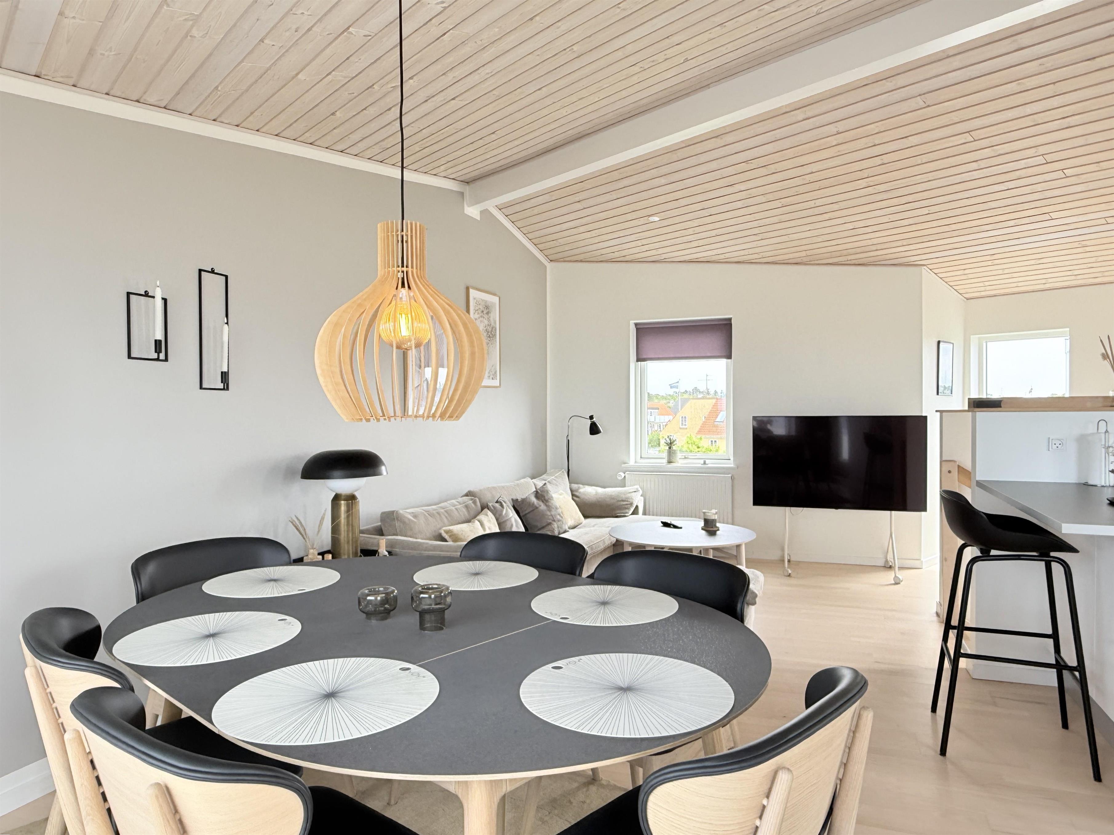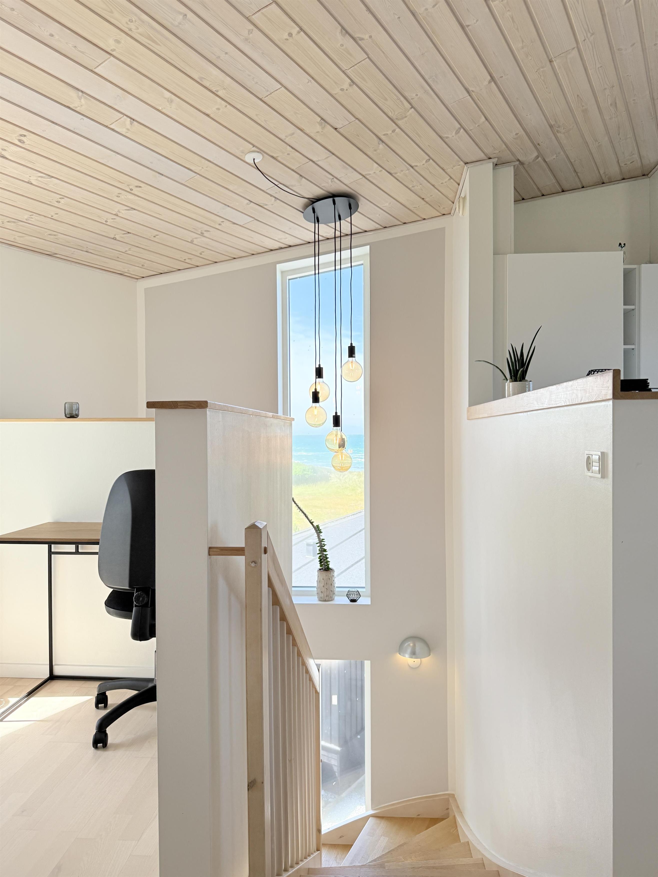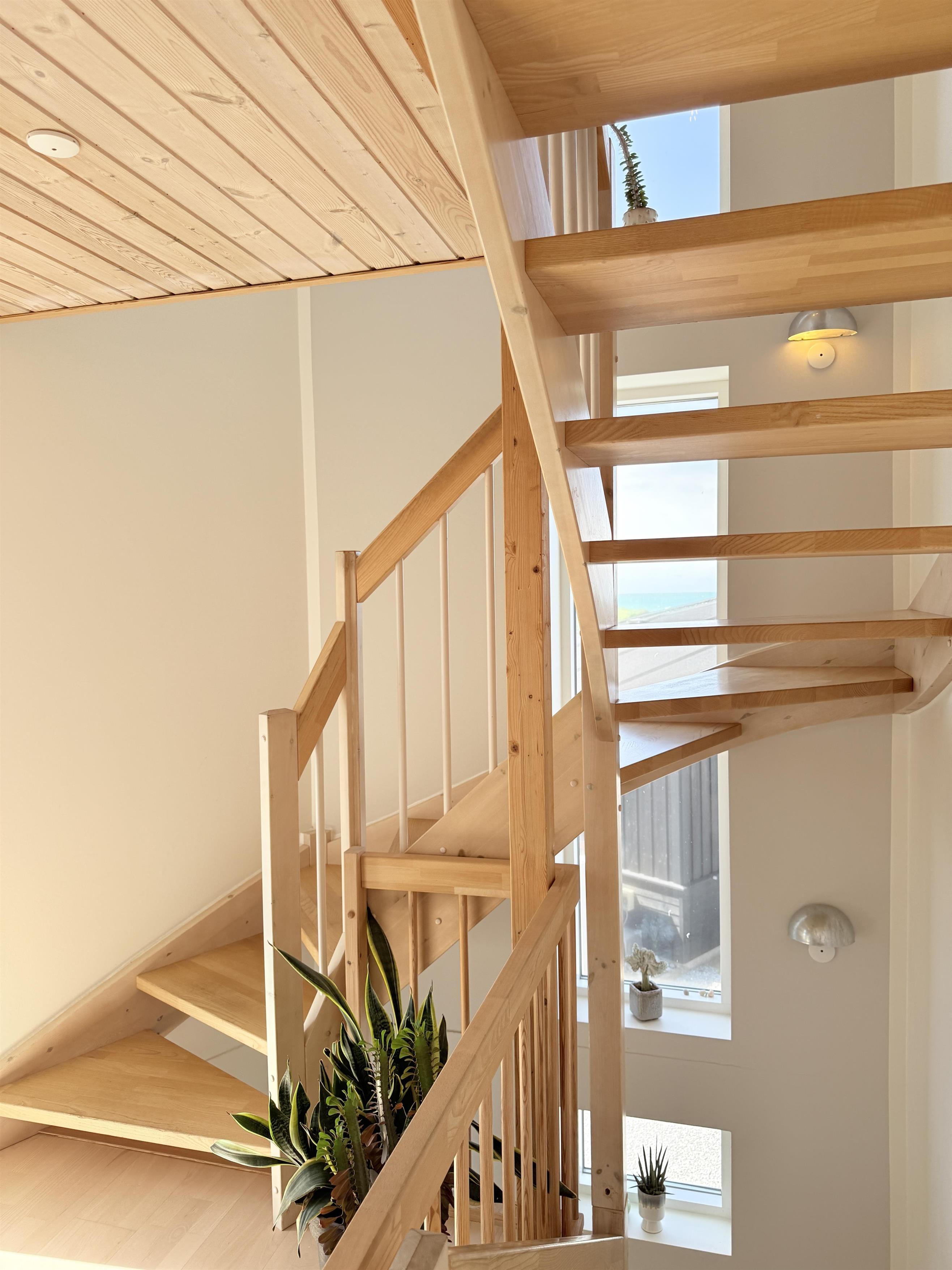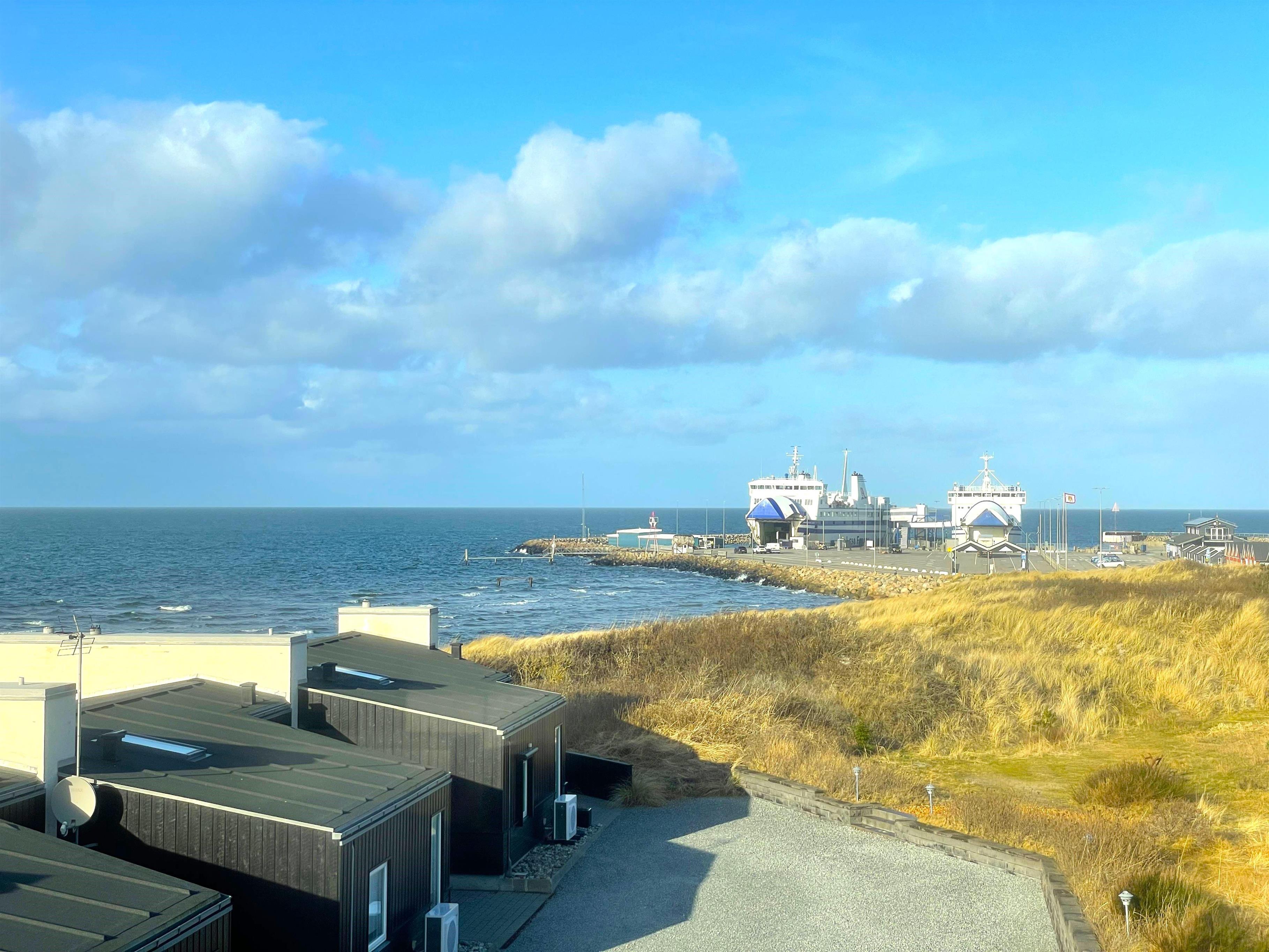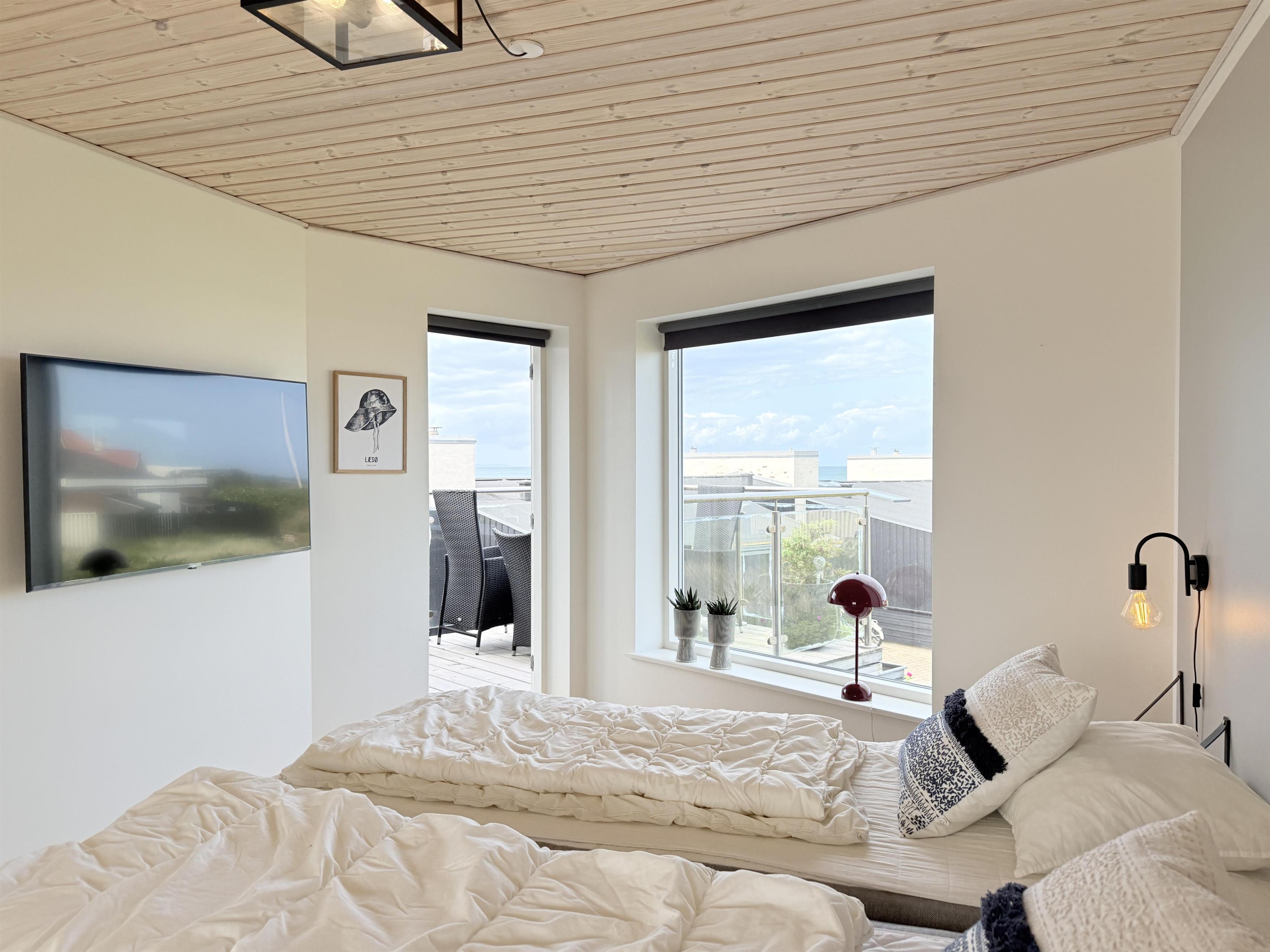 Dette fantastiske udsigtshus, Solhuset, fordelt på tre etager ved en af Læsøs bedste badestrande skaber rammerne for den allerbedste ferie på Læsø. Flotte lysindfald og blåt vand næsten uanset hvor I huset, man befinder sig. Fra Solhuset har man naturen, stranden og det hyggelige havnemiljø i Vesterø lige udenfor vinduet. Selve huset er yderst smagfuldt indrettet. I stueetagen findes to badeværelser, et toilet samt et toilet + brus, 2 soveværelser med dobbeltseng og Smart TV og udgang til lille terrasse med udebruser midt i marehalmen og klitroserne. På 1 sal ligger endnu et flot soveværelse med dobbeltseng (elevationssenge), smart TV samt toilet + brus + spa og hele to altaner, en på hver side af bygningen. Den ene altan vender mod Kongestranden, og den anden mod færgehavnen og stranden. Begge altaner er udstyret med behagelige møbler. På øverste etage findes et stort, flot køkken/alrum med fantastisk lysindfald og panoramahavudsigt. Lækkert sofaområde og smart TV. Udgang til husets tredje altan med behagelige møbler, der skaber rammerne for de dejligste timer i skæret af solnedgangen over Kattegat. Et yderst komfortabelt og moderne udstyret hus med en af Læsøs absolut bedste beliggenheder.