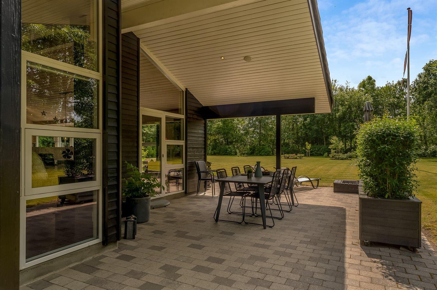 Terrasser på 3 af husets sider med mange læmuligheder (såvel åbent som overdækket terrasseareal) med havemøbler. Der findes en stor integreret carport med direkte indgang til entréen.