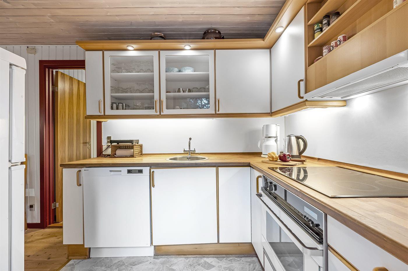 Køkkenet er udstyret med 1 køleskab. Der er 4 keramiske kogeplader, varmluftovn, mikrobølgeovn samt opvaskemaskine.