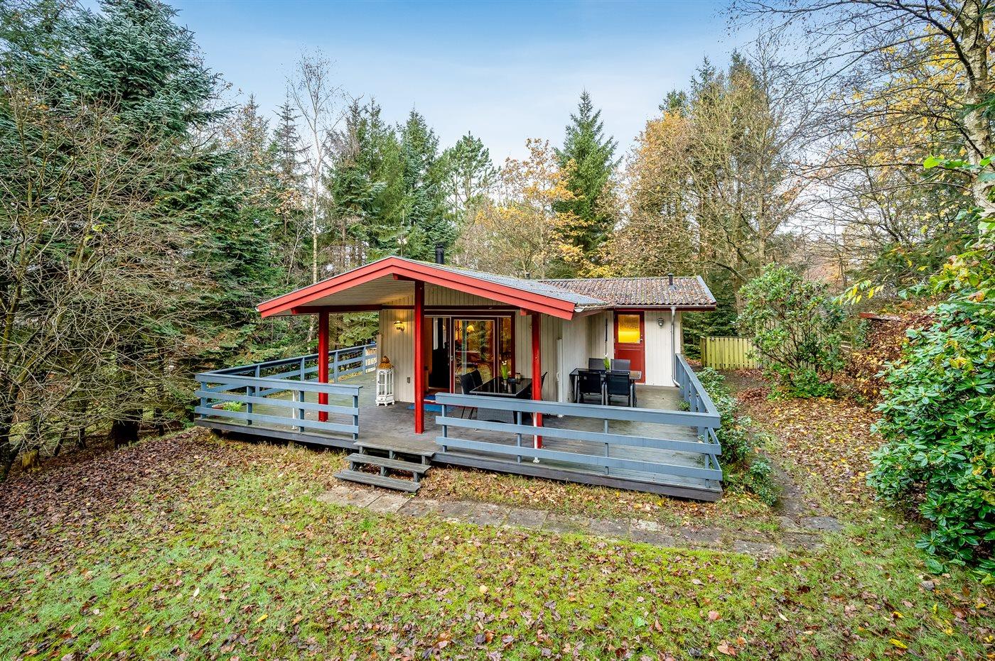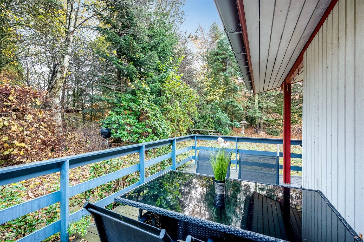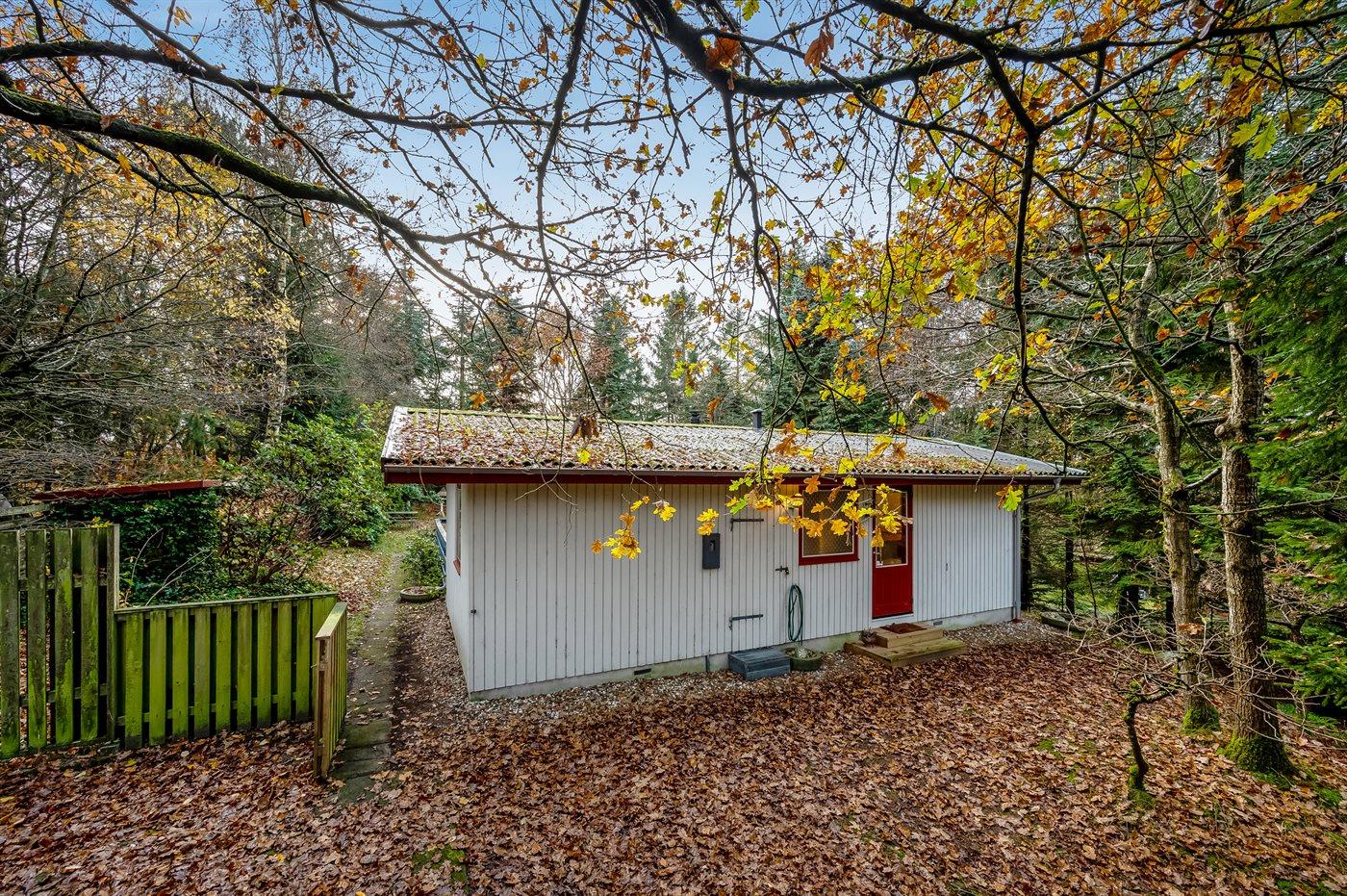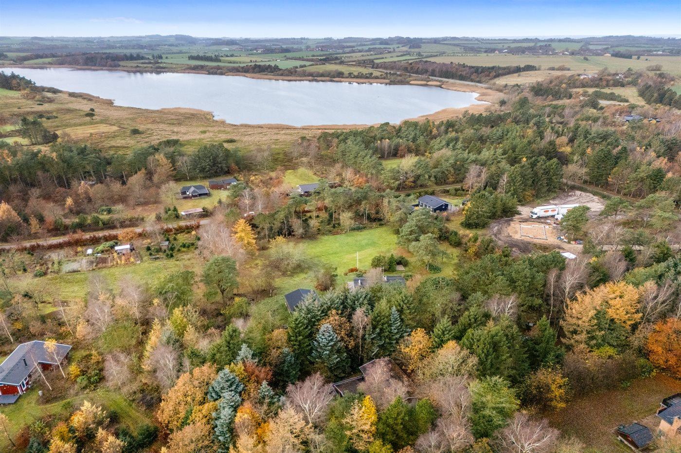 Ferieboligen er beliggende på en 5514 m² stor grund i skov/plantage. Grunden er indhegnet. Der er 600 m til fjorden. Der er en sø i en afstand af 300 m. Nærmeste forretning er beliggende i en afstand af 5000 m. Til ferieboligen hører åbent terrasseareal. Desuden er der overdækket terrasse. Parkering ved ferieboligen.