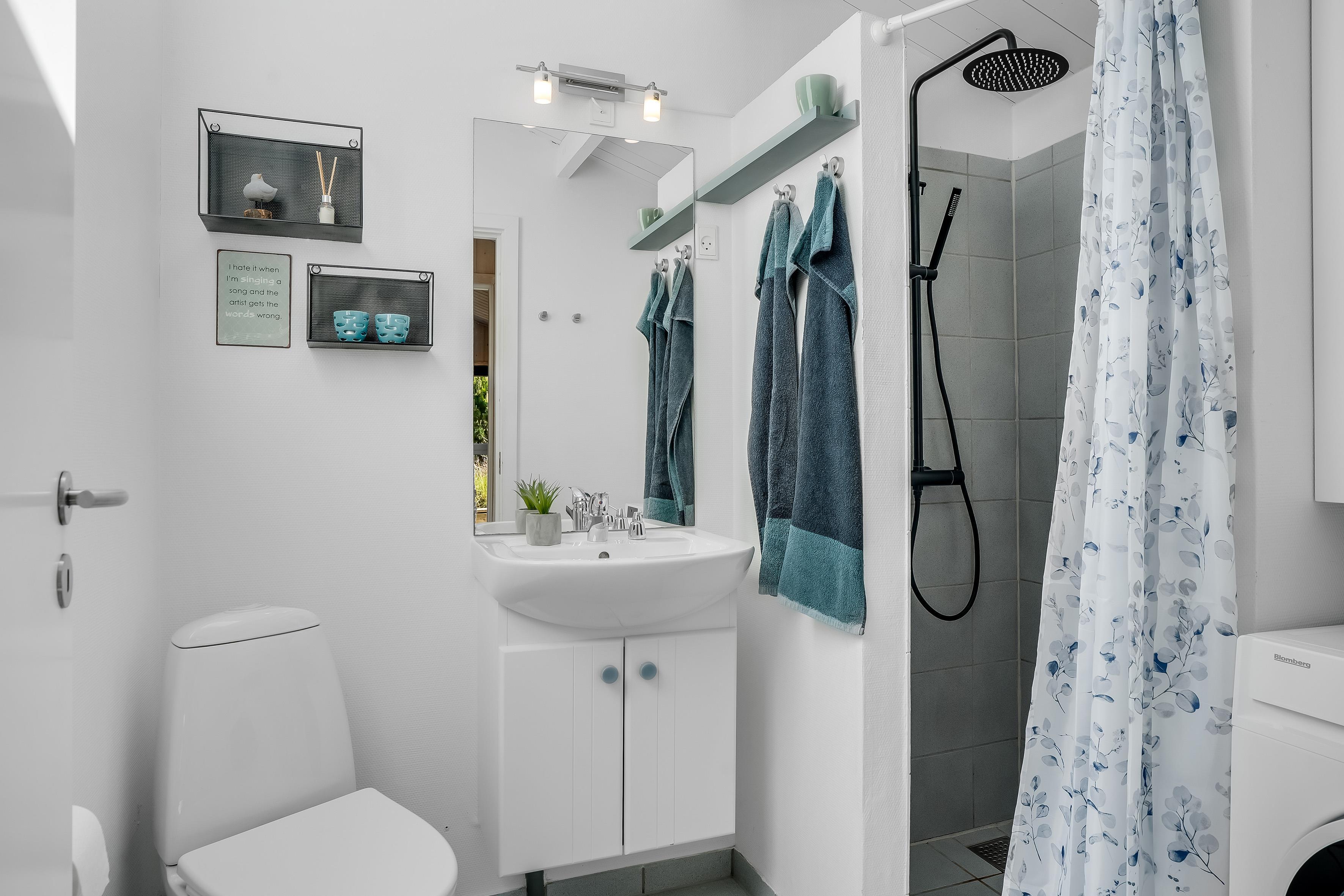Huset har tre soveværelser, hvoraf to er udstyret med dobbeltsenge og det tredje med to enkeltsenge, hvilket giver plads til alle. Der er også en barneseng og barnestol til de mindste, så hele familien kan føle sig velkommen. Badeværelset er moderne og komfortabelt med gulvvarme, bruser og toilet, hvilket sikrer en behagelig oplevelse.