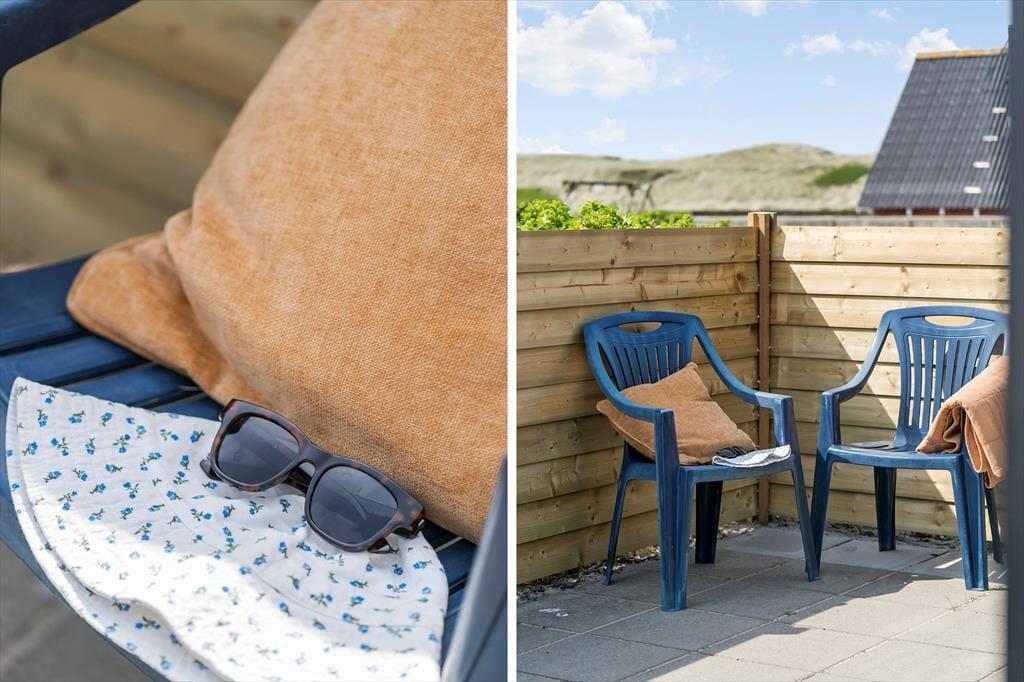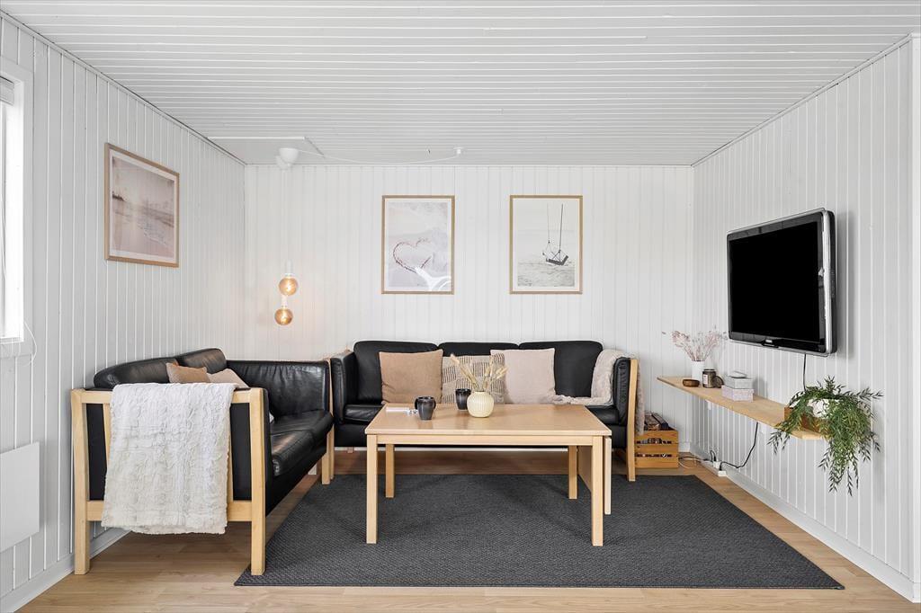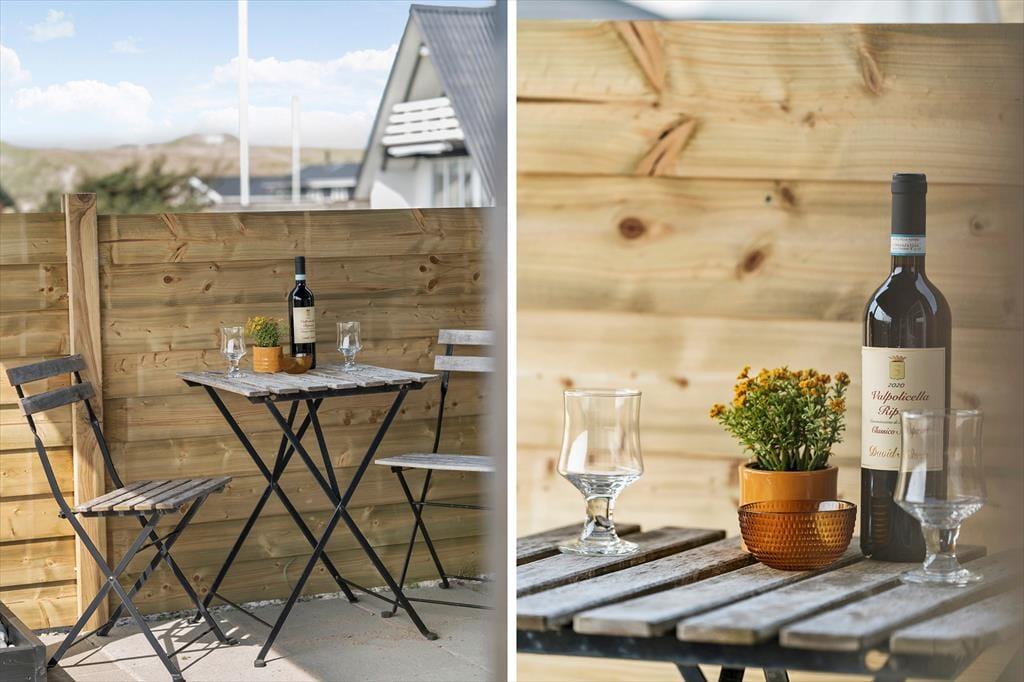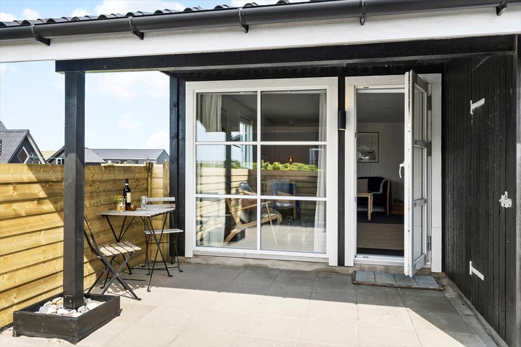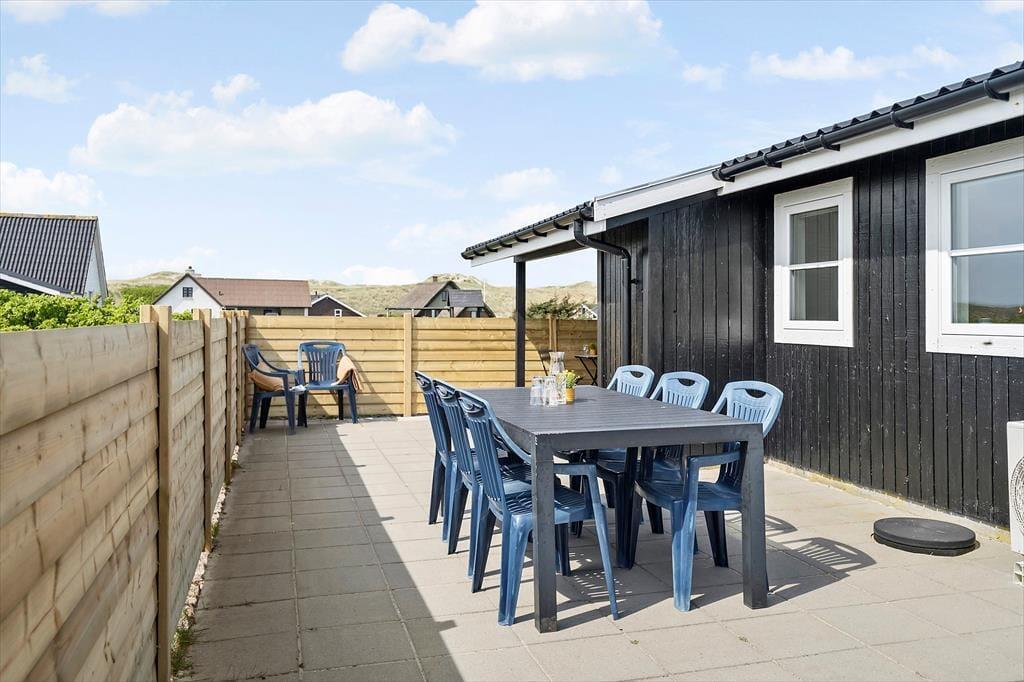 Sommerhuset byder på et dejligt uderum, hvor den sydvendte terrasse bliver det oplagte sted at nyde sol og feriestemning. Terrassen er helt aflukket med et lyst træhegn, hvilket skaber trygge rammer – både for børnene og familiens hund. Her kan du slappe af i liggestolen med en god bog, dække op til frokost i solen eller tænde op i grillen til en sommeraften under åben himmel. Haven omkring huset giver også plads til boldspil og leg, mens de voksne nyder roen med fuglekvidder og duften af hav i luften. Her er det nemt at finde sig til rette, læne sig tilbage og nyde livet i det tempo, der passer dig bedst.