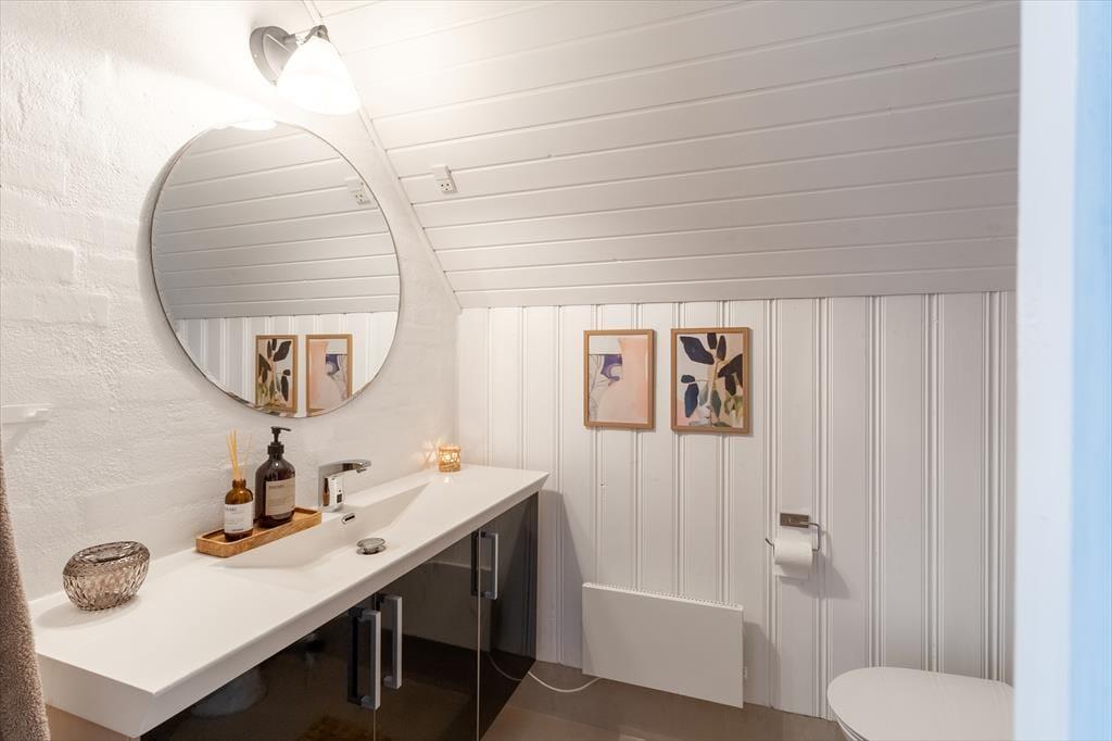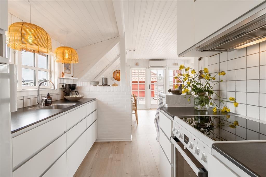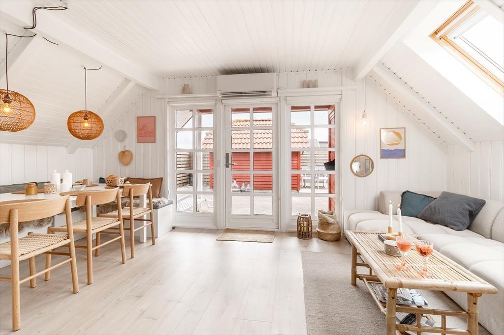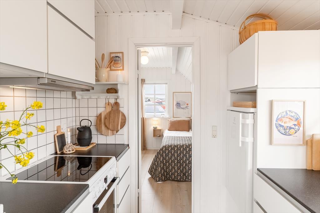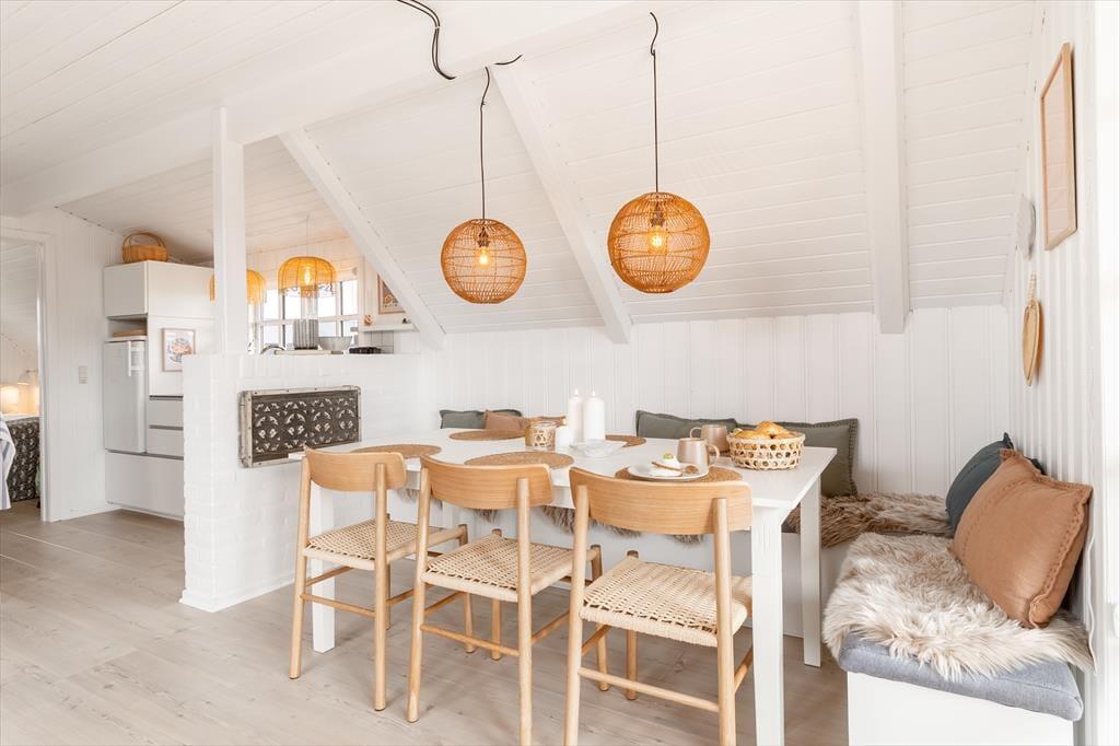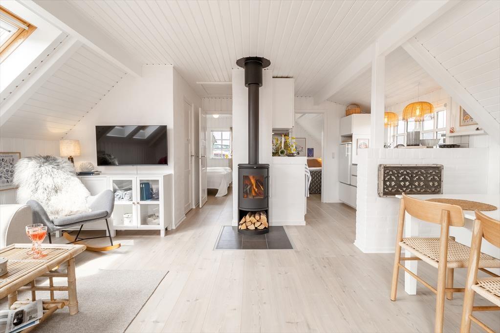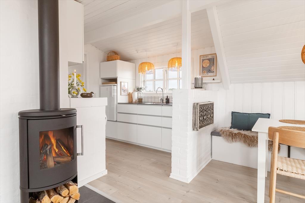 Indenfor byder sommerhuset på en lys og hyggelig indretning, hvor der hurtigt spreder sig en afslappet feriestemning. Brændeovnen i stuen sørger for varme og ekstra hygge på de køligere dage, og i de bløde møbler kan du slå dig ned med en god bog eller spille et brætspil i familiens selskab. Stuen og køkkenet er samlet i ét åbent rum, hvilket skaber et naturligt samlingspunkt, hvor feriedagene let glider over i lange samtaler og grin. Der er god plads til seks personer, fordelt på to værelser i huset og et ekstra anneks – ideelt til både familier og par, der rejser sammen. Indretningen er enkel, nordisk og hjemlig, og vinduerne giver et smukt lysindfald, så du hele tiden bliver mindet om, hvor tæt du er på naturen og havet.