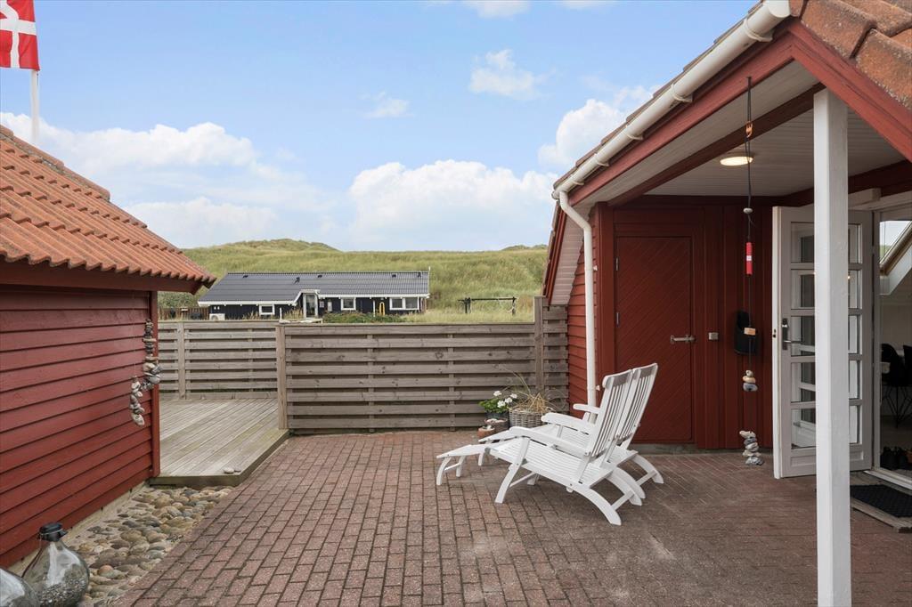 Terrassen er et af husets helt store plusser. Den er lukket og går næsten hele vejen rundt om huset, så du altid kan finde en solplet – uanset tidspunktet på dagen. Her er der plads til både afslapning og leg, og terrassen fungerer nærmest som en ekstra stue i sommerhalvåret. Start dagen med morgenkaffe og udsigt til klitterne, eller nyd en stille stund i liggestolen, mens du lytter til havets brusen i baggrunden. Når aftenen falder på, er det oplagt at tænde op i grillen og samle familien til en hyggelig middag under åben himmel. Den lukkede terrasse er samtidig en tryg ramme for både børn og hunde, som kan færdes frit uden at I skal bekymre jer om at holde øje hele tiden.