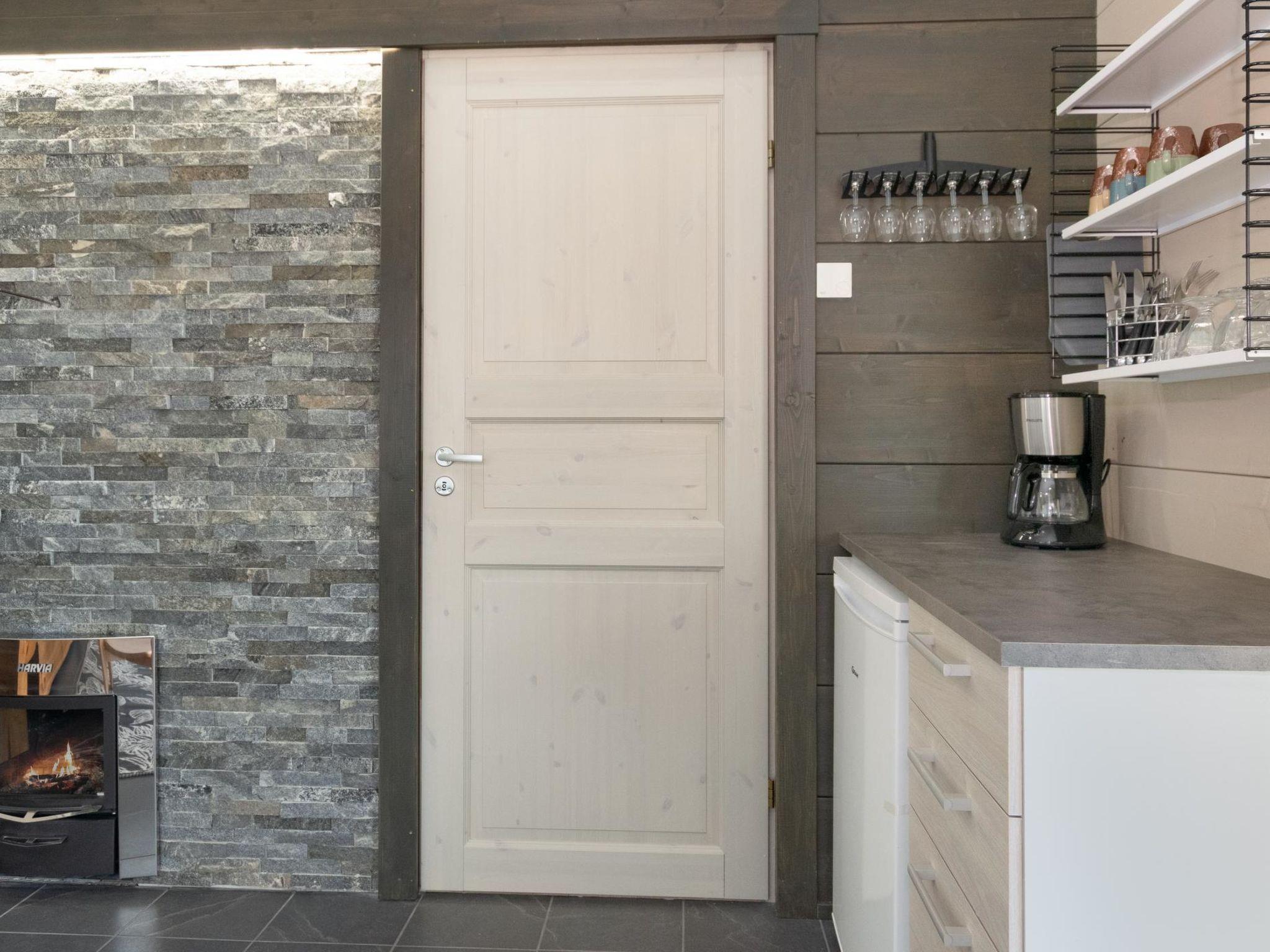 The cabin has two bedrooms. One bedroom features a double bed (160×200 cm), and the other has two single beds (90×200 cm each). In addition, there is a sofa bed (140×200 cm) for two in the lakeside sauna building. The lakeside sauna includes its own WC and shower, and it is heated year-round.