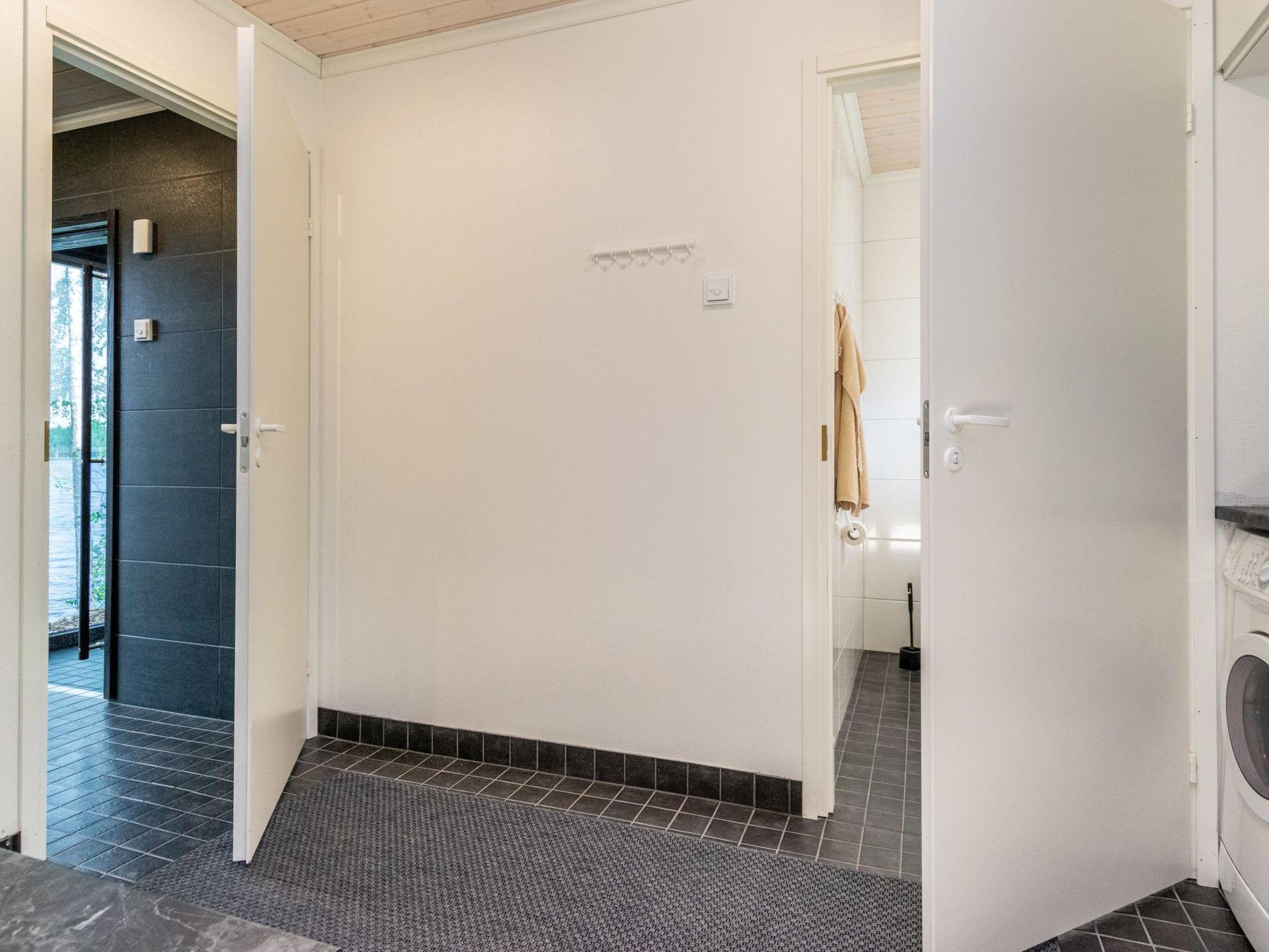 Modern villa with large landscape windows in sauna and living room, unobstructed view of lake Saimaa opens from the windows. There is a space for a larger group to stay and take a sauna. In addition to normal continously heated wood-burning sauna stove, an exceptionally large heat storing sauna stove (one time heated) in large, more than 15-square-meter saun. Due to 2000 kg total weight, this sauna stove offers almost endless steam to the sauna.