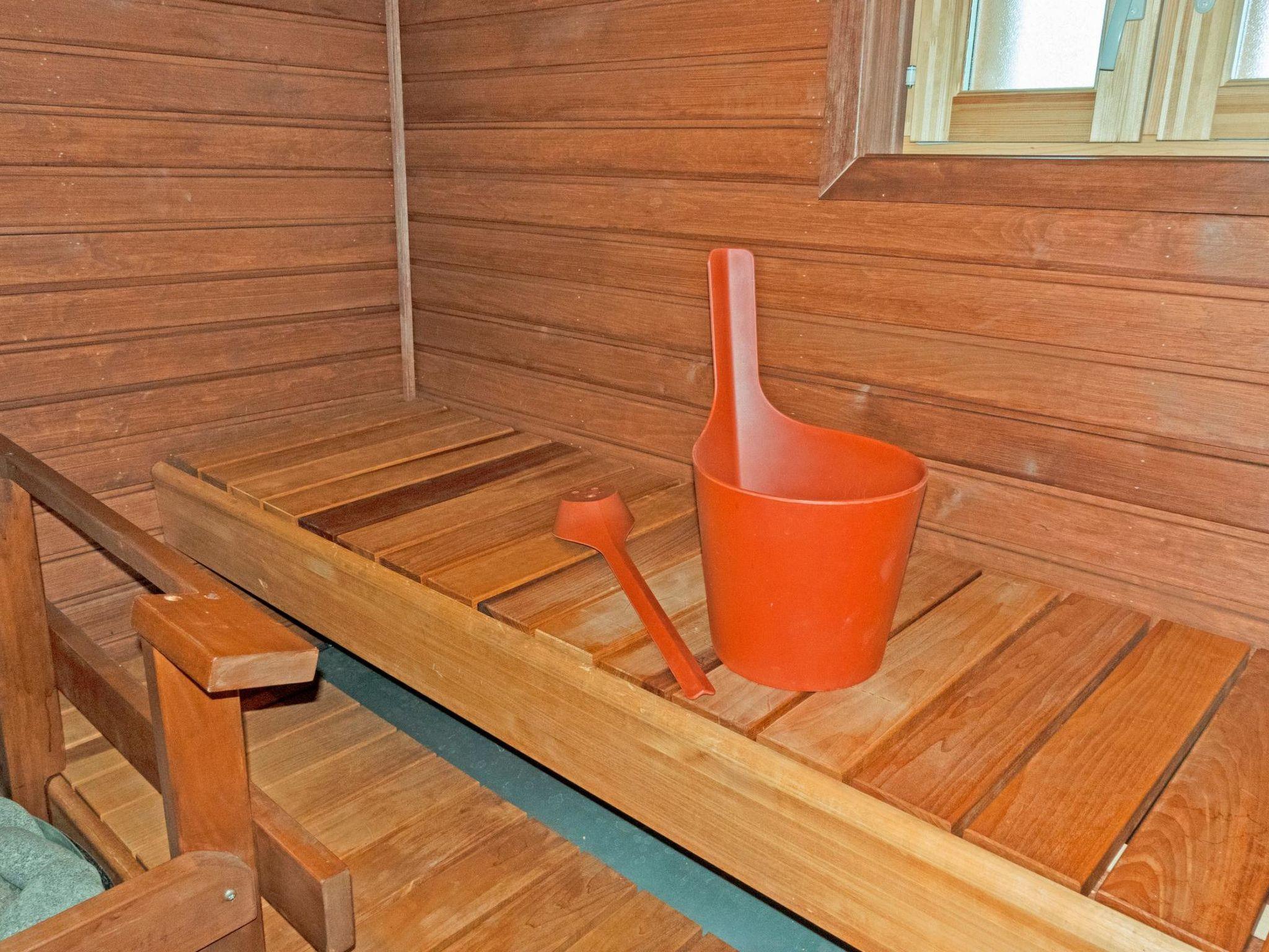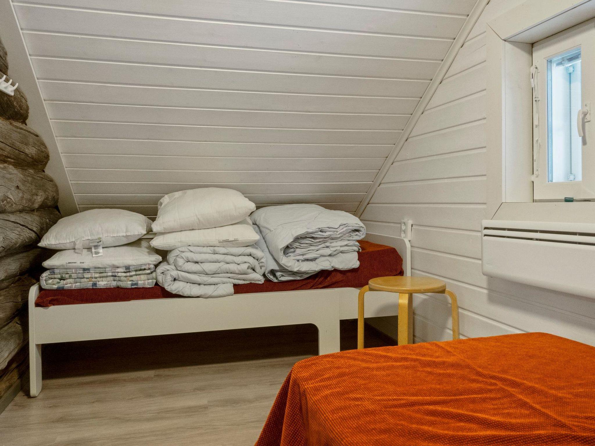 Kelo log-built cabin, facilities on three floors, built in 2022. The middle floor is the entrance floor and has living room / kitchen. The room height in the middle floor is lower than normal, 190 cm. Access to balcony and open terrace from the middle floor. On the upper floor, there are two beds and an additional bedroom with 2 beds. The upper floor has a sloping ceiling. The length of the another bed located in the bedroom can be adjusted. In the picture, the length is 170 cm. The bed can also be placed in some another location on the upper floor, then the bed can be extended to normal length. WC also on the upper floor. Access to the uppermost balcony from the upper floor. On the ground floor, there is sauna, washroom/WC and fireplace room (sofa bed as an alternative bed; the maximum number of people is 4).