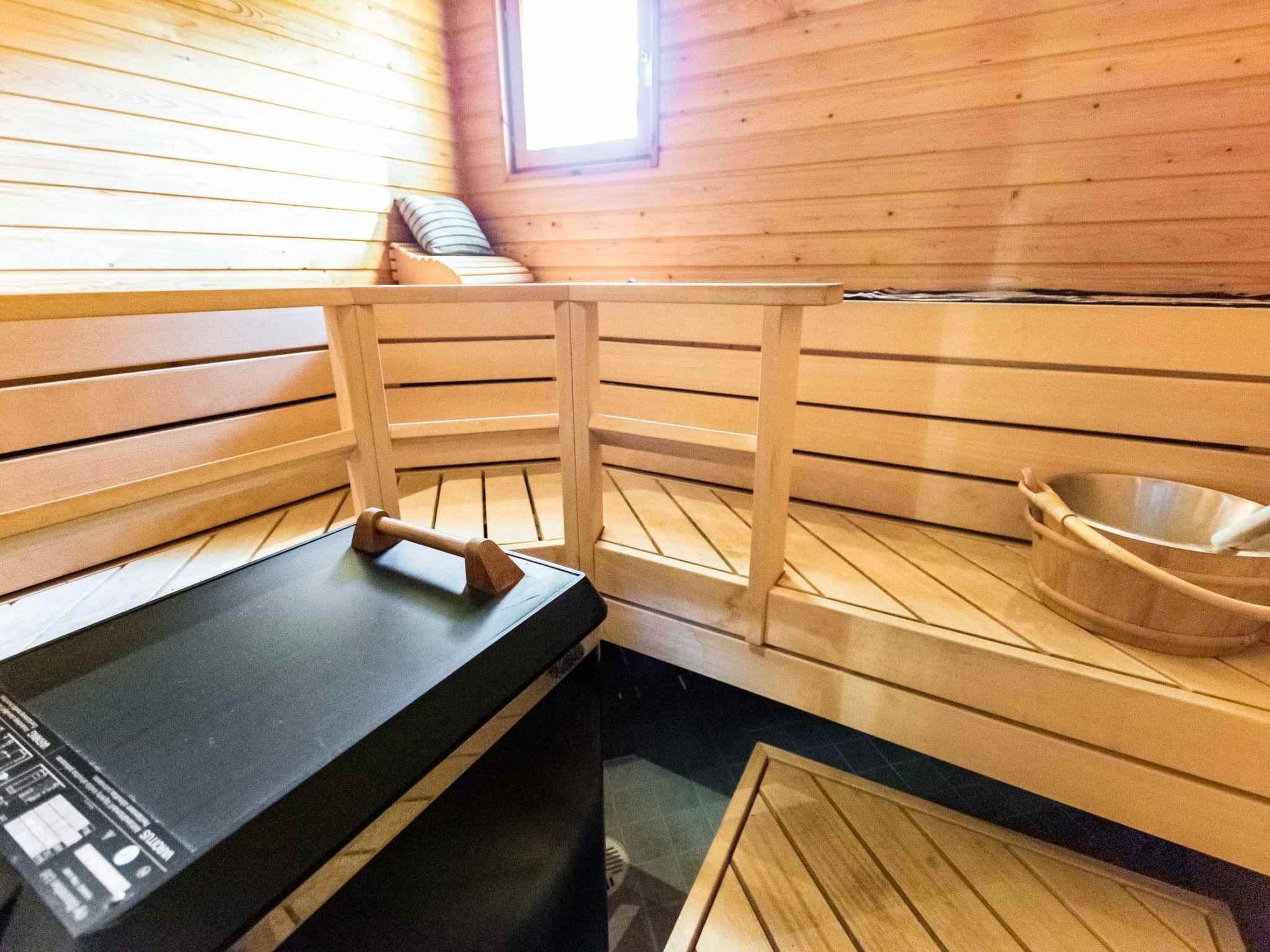 Log-built sauna building 25 m²: wood-heated sauna, TV lounge, 140 wide sofa bed and 2 mattresses, sleeping loft with 120 cm wide bed, separate WC, fridge, dishwasher.