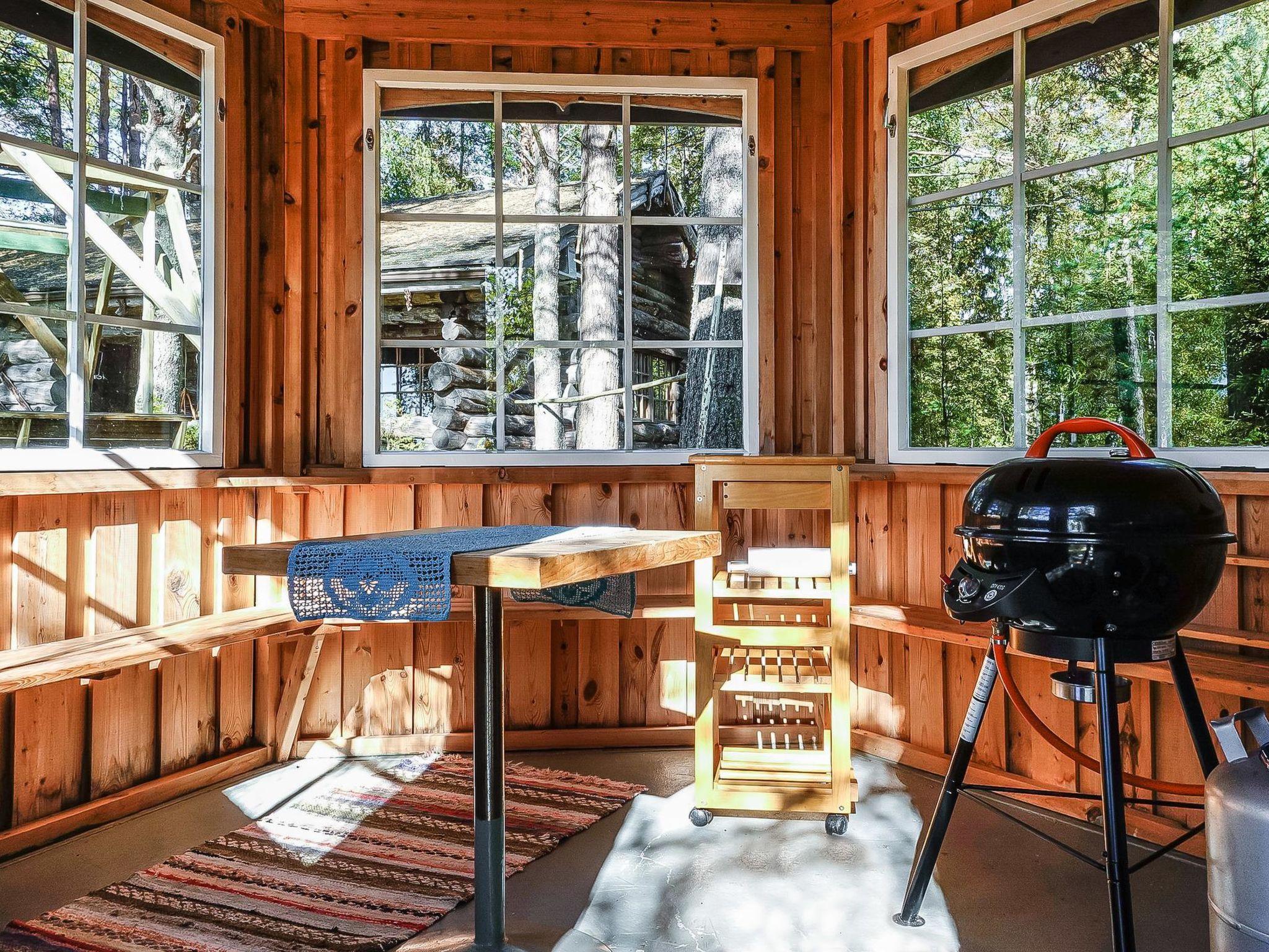 On sandy shore there is a barbeque hut and wooden patio with furniture in summer.