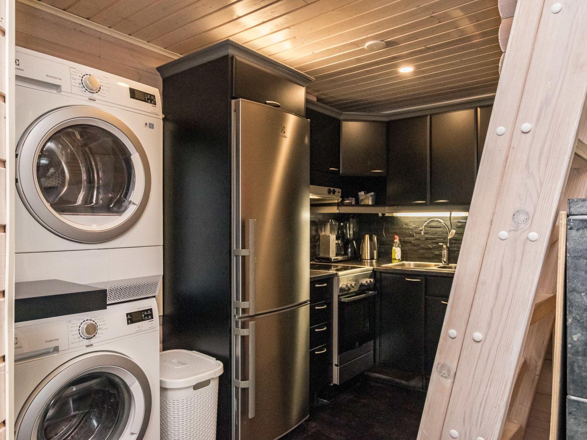 Hand carved log cabin 1950, totally renovated and inner side paneled 2014. Combined kitchen-living room, downstairs alcove (5 m ², no window) with double bed, upstairs loft with 2 single beds, steep and narrow stairs to the loft, sauna, toilet and shower cubicle in the washroom. Fine, large covered terrace 50 m². Tumble-dryer and air source heat pump.
