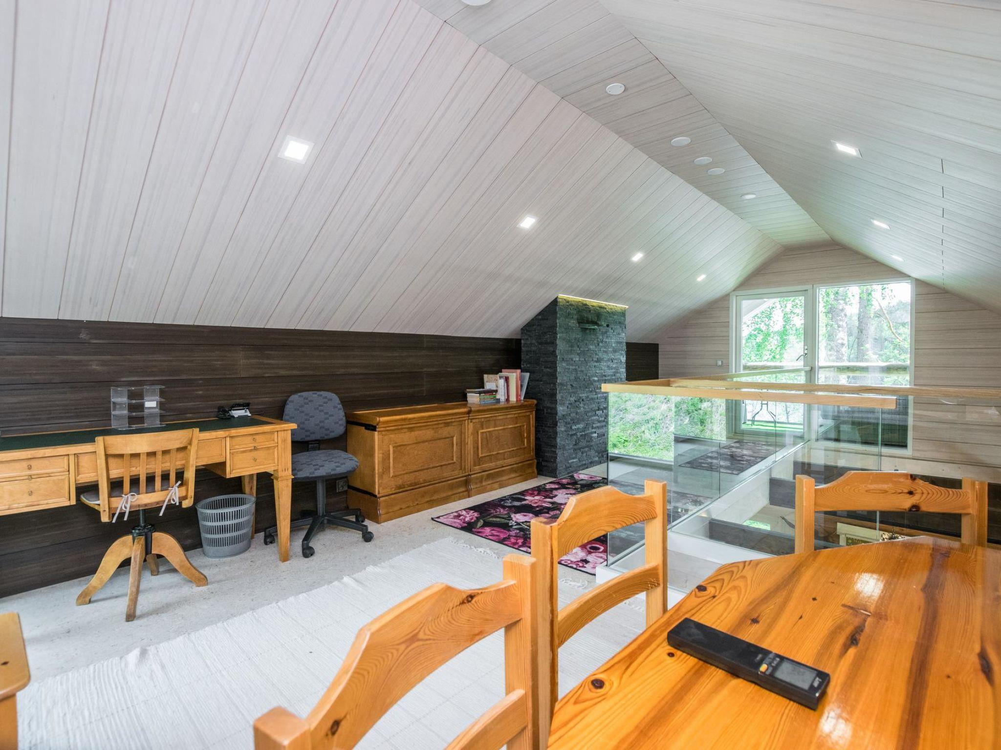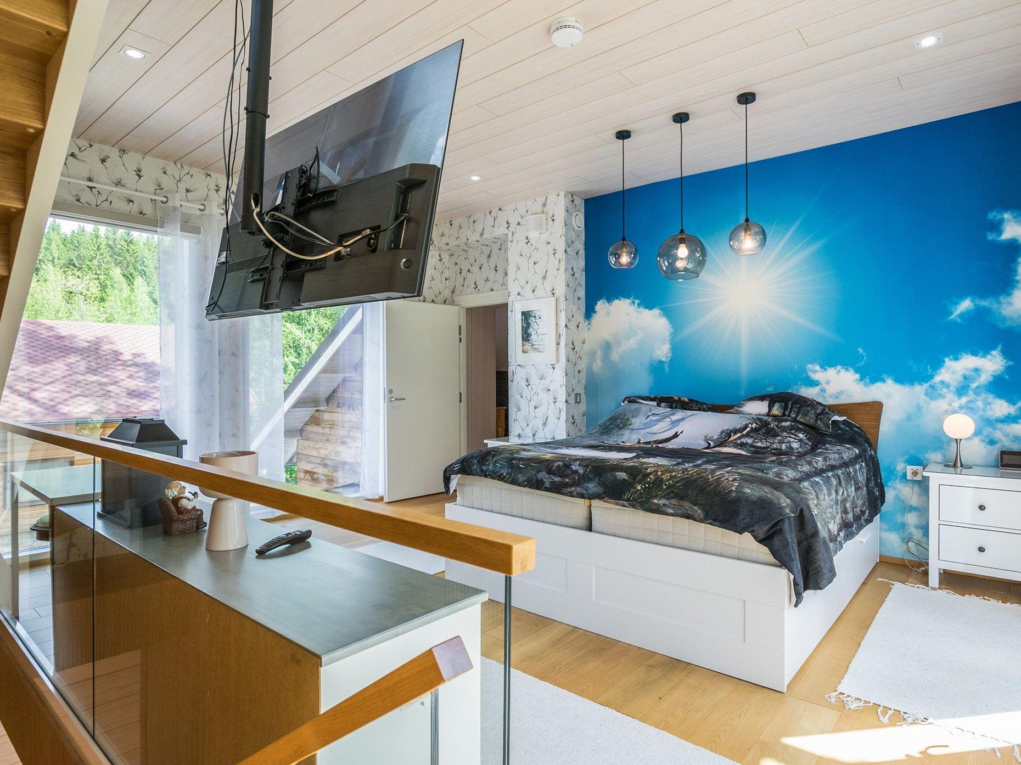 On the upper floor: a hall with a remote workstation, a sofa bed for two as an alternative sleeping place, balcony. Bedroom of 20 m² with a double bed, smart TV, electric curtains, individual room temperature control, glass balcony. The upper floor hall can be accessed from ground floor either via steep stairs or gentler stairs through the upper floor bedroom.