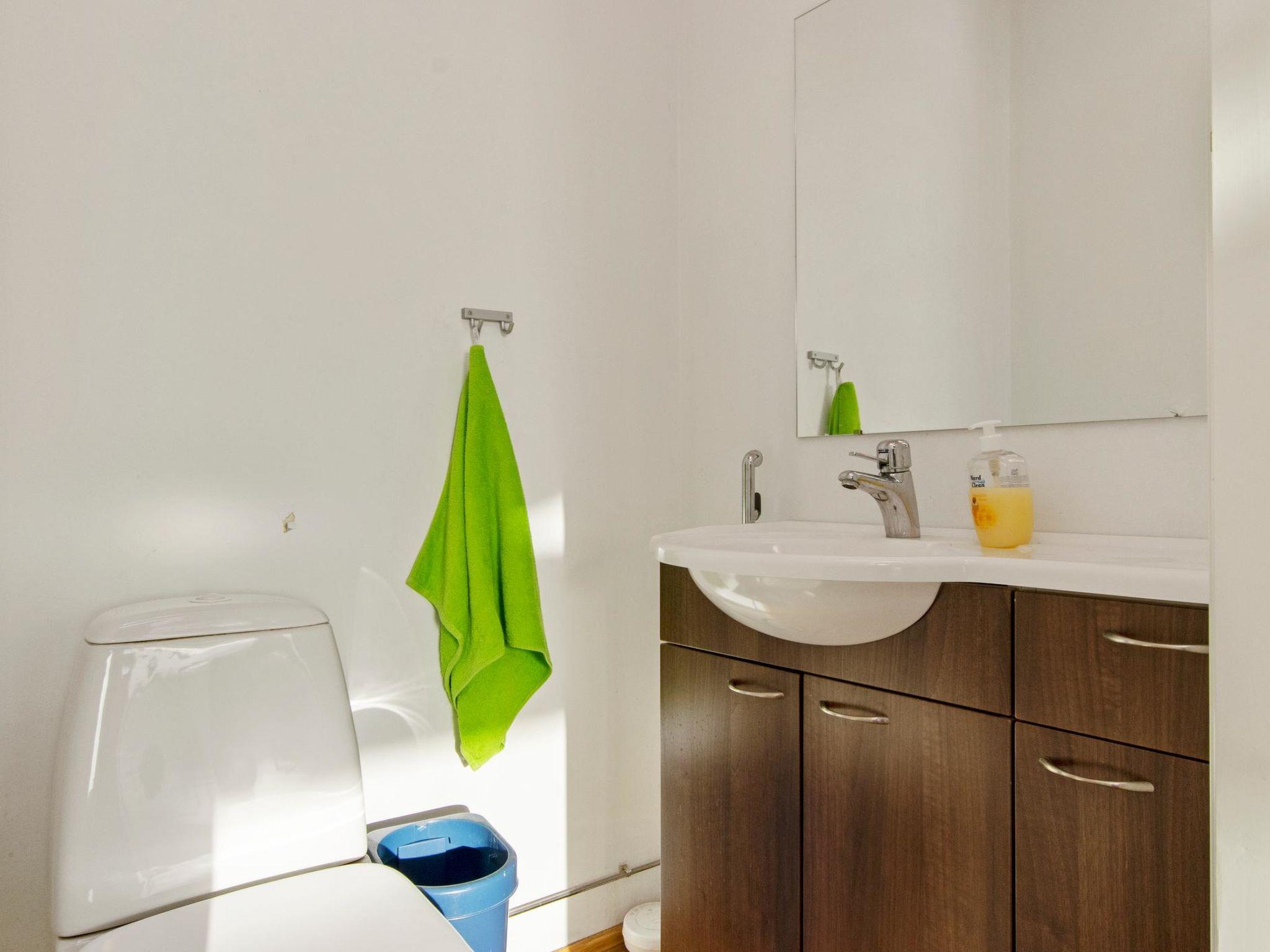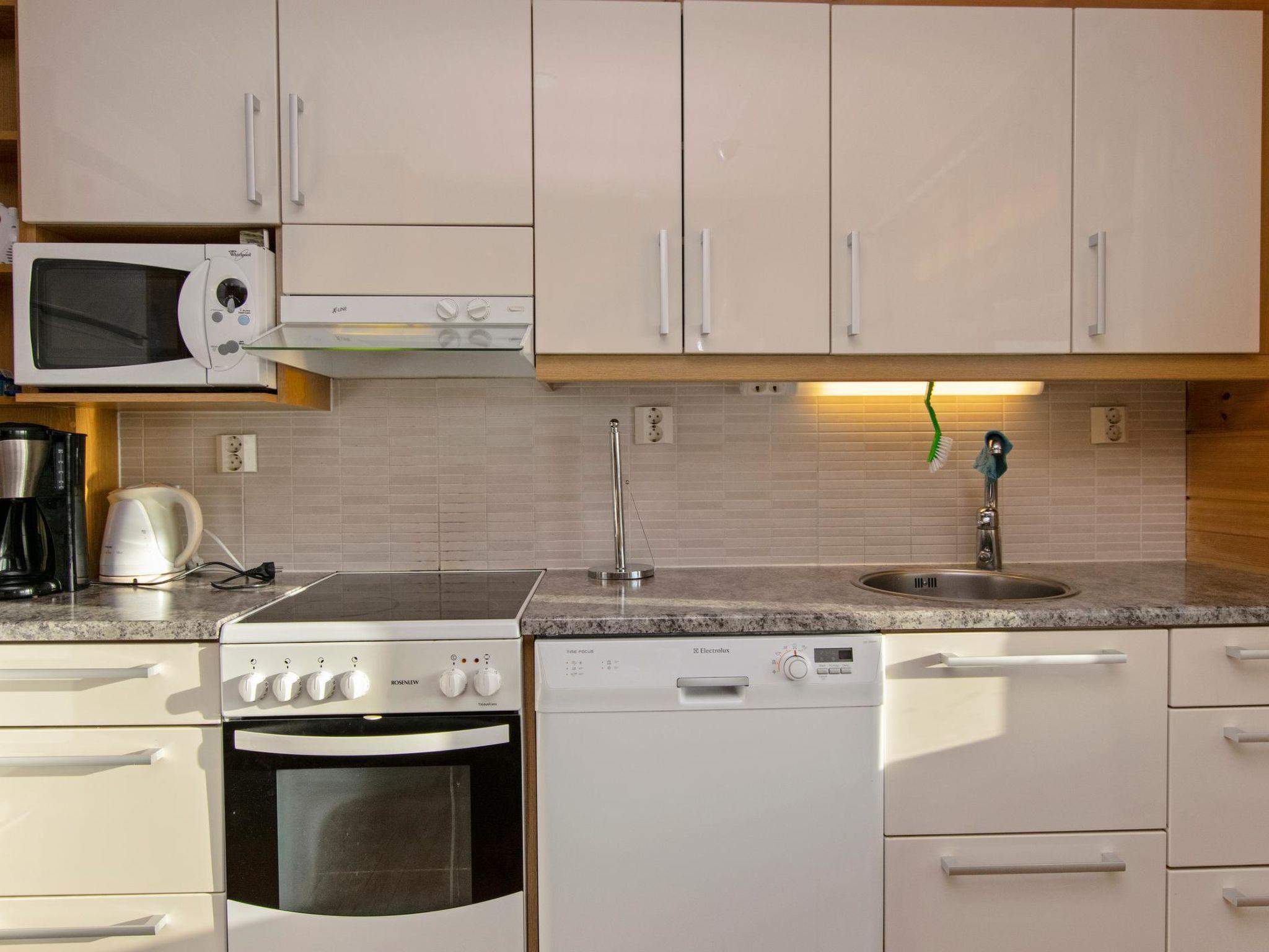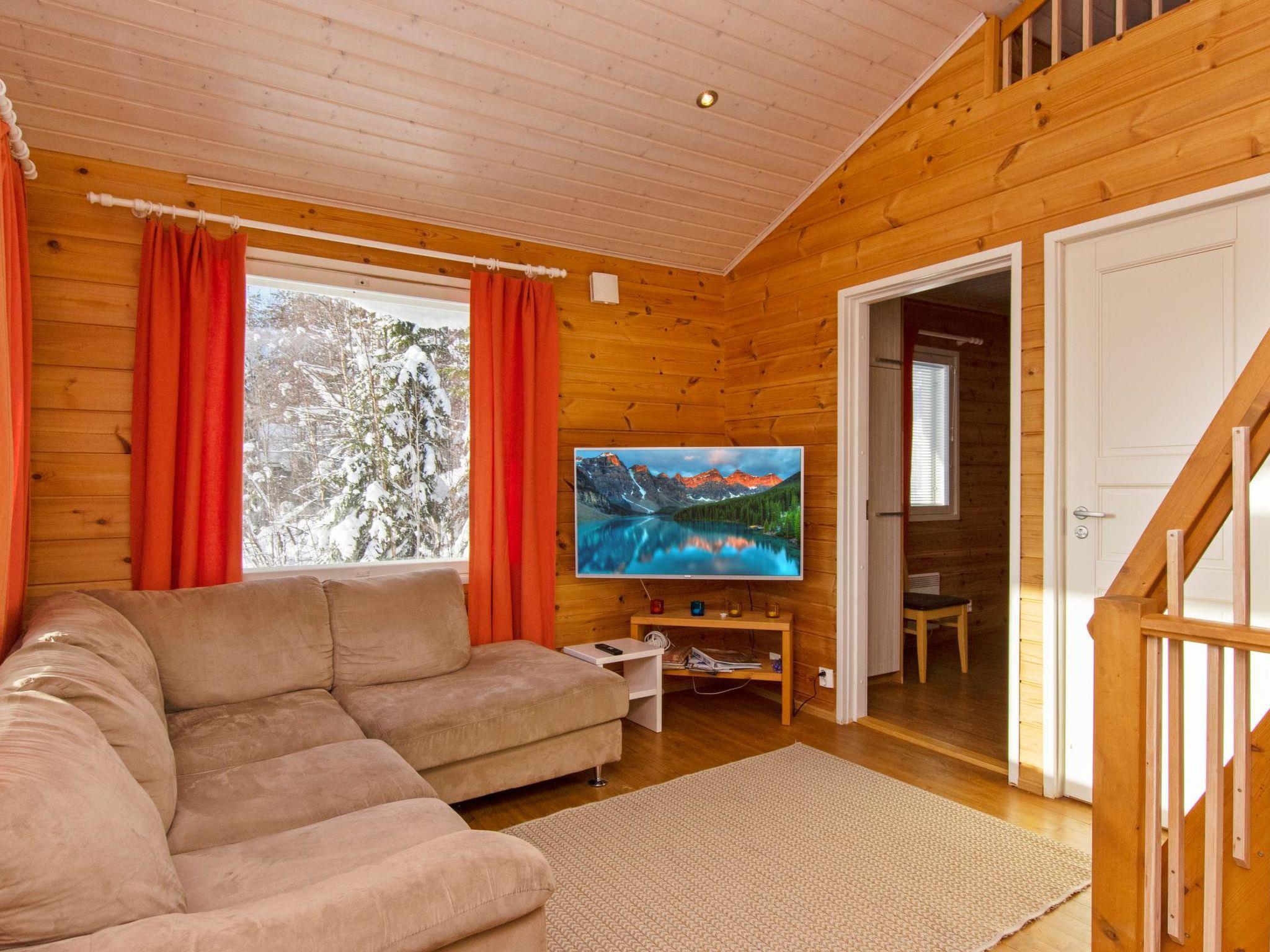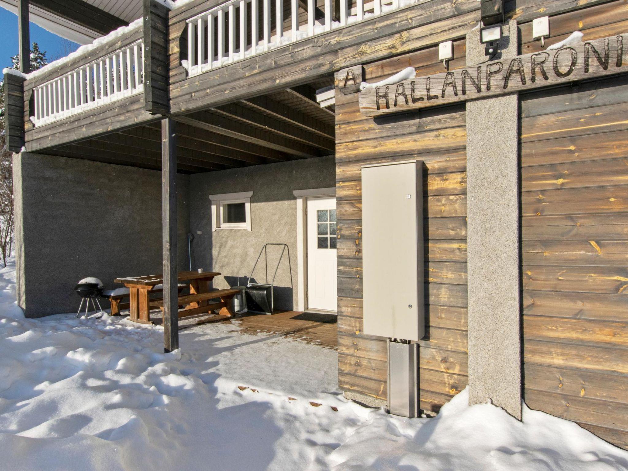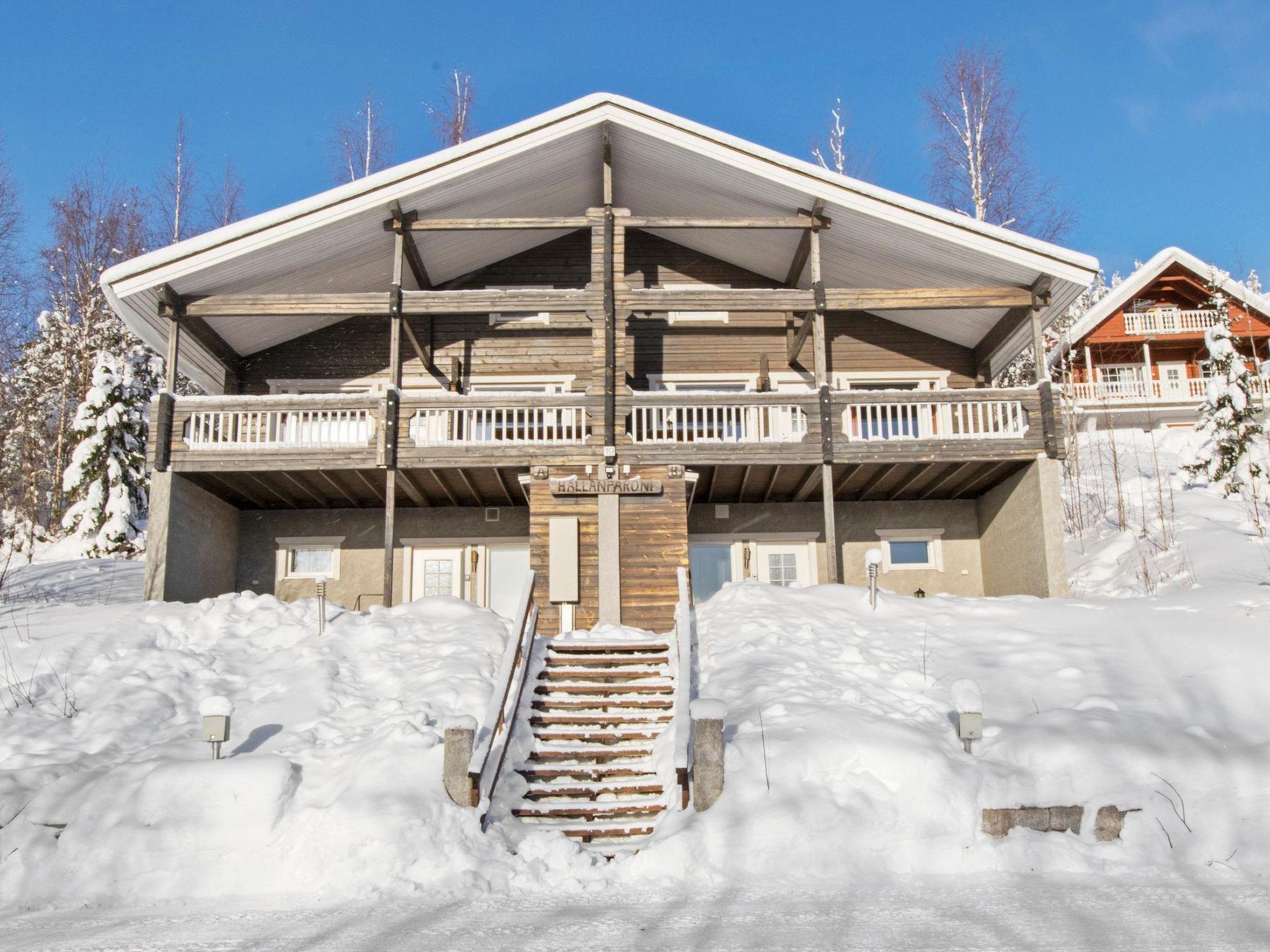 An apartment in a semi-detached house located in the Ukkohalla tourism centre, 68 m² + loft 23 m², built in 2007, premises on 3 floors (steep stairs), kitchen, 2 bedrooms, loft, sauna, shower room/toilet, separate toilet, room with a fireplace including a sofa-bed, storage, balcony, terrace, fireplace and firewood.