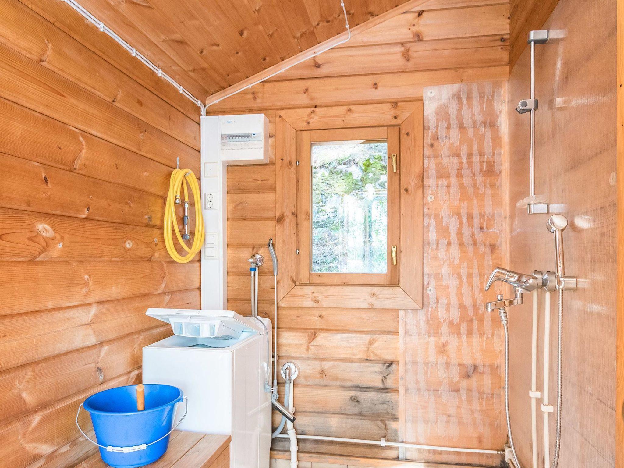 Lakeside sauna: dressing room with shower and washing machine, wood-burning sauna stove.