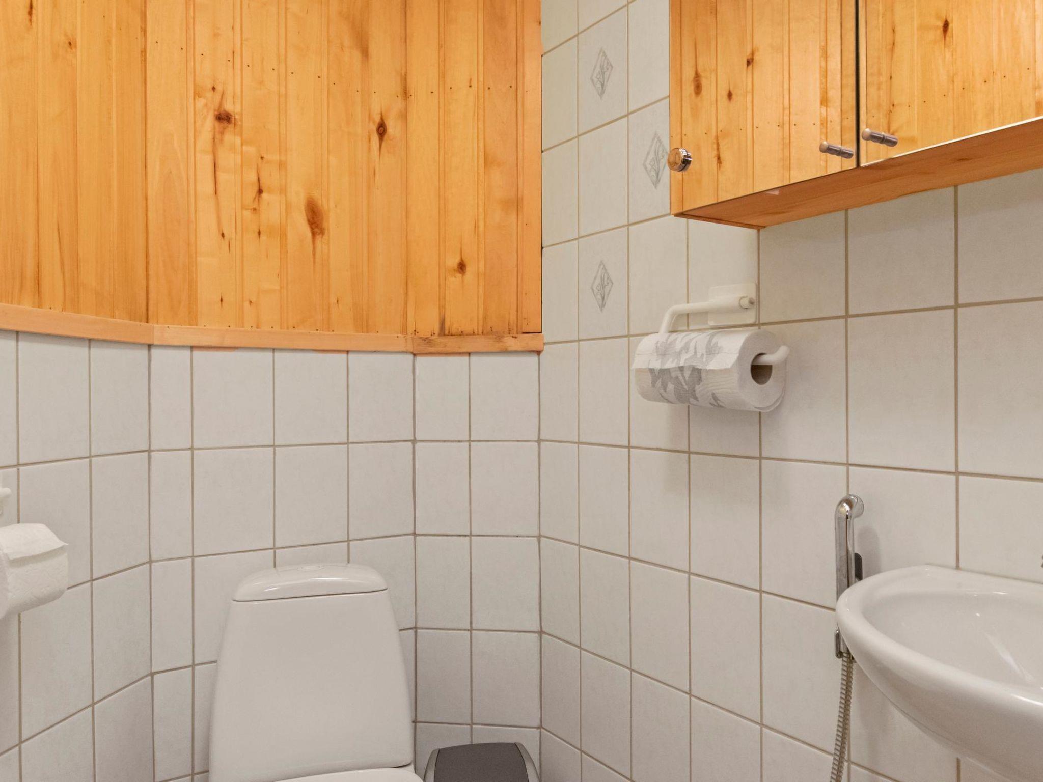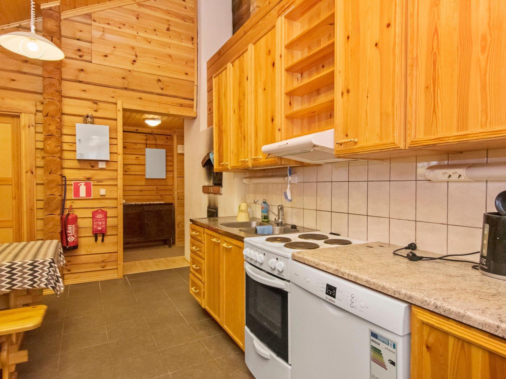 Log cabin 2001, large living area (40 m²), kitchen, two bedrooms (8 m²), two beds in both, washroom with WC and shower, large covered balcony.