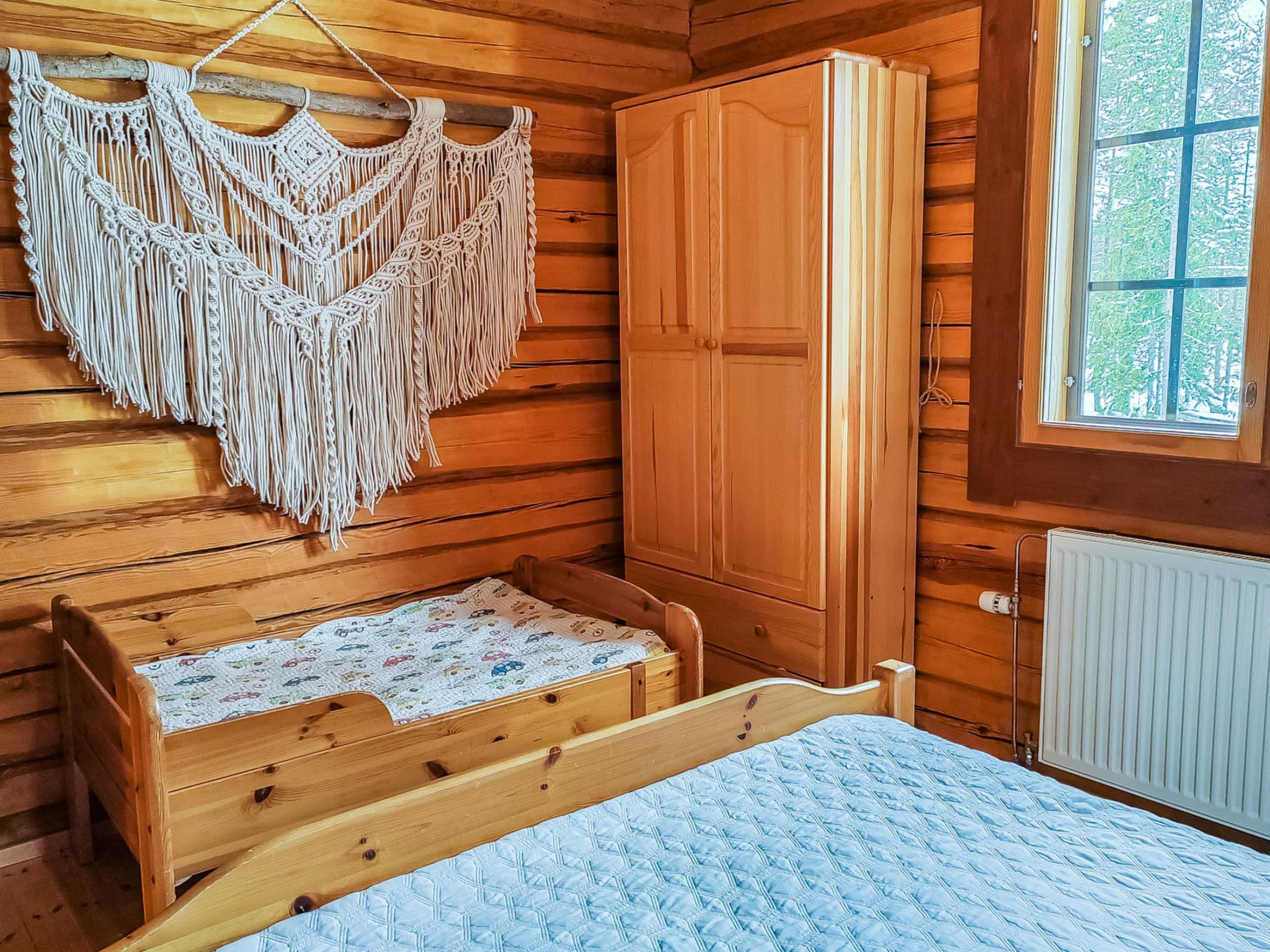 46 km from Jyväskylä, lake Kivijärvi 35 m, two piers, two rowing boats and canoe. Log cabin, built in 2012, living room with two sofa beds (bed sizes are 140 x 190 cm when opened), living room / kitchen, washroom with WC, bedroom 1: double bed and extendable cot, bedroom 2: two beds, loft with 4 beds.