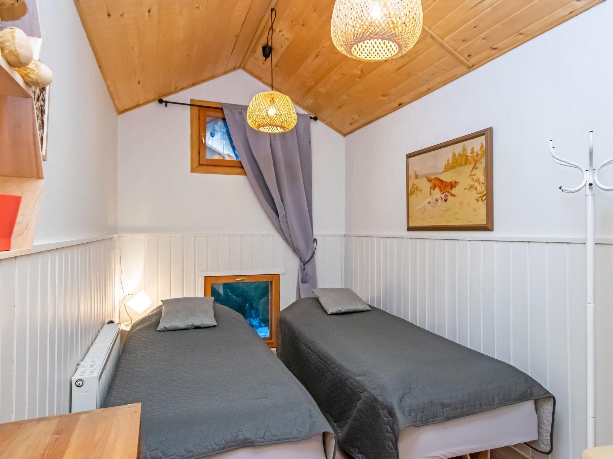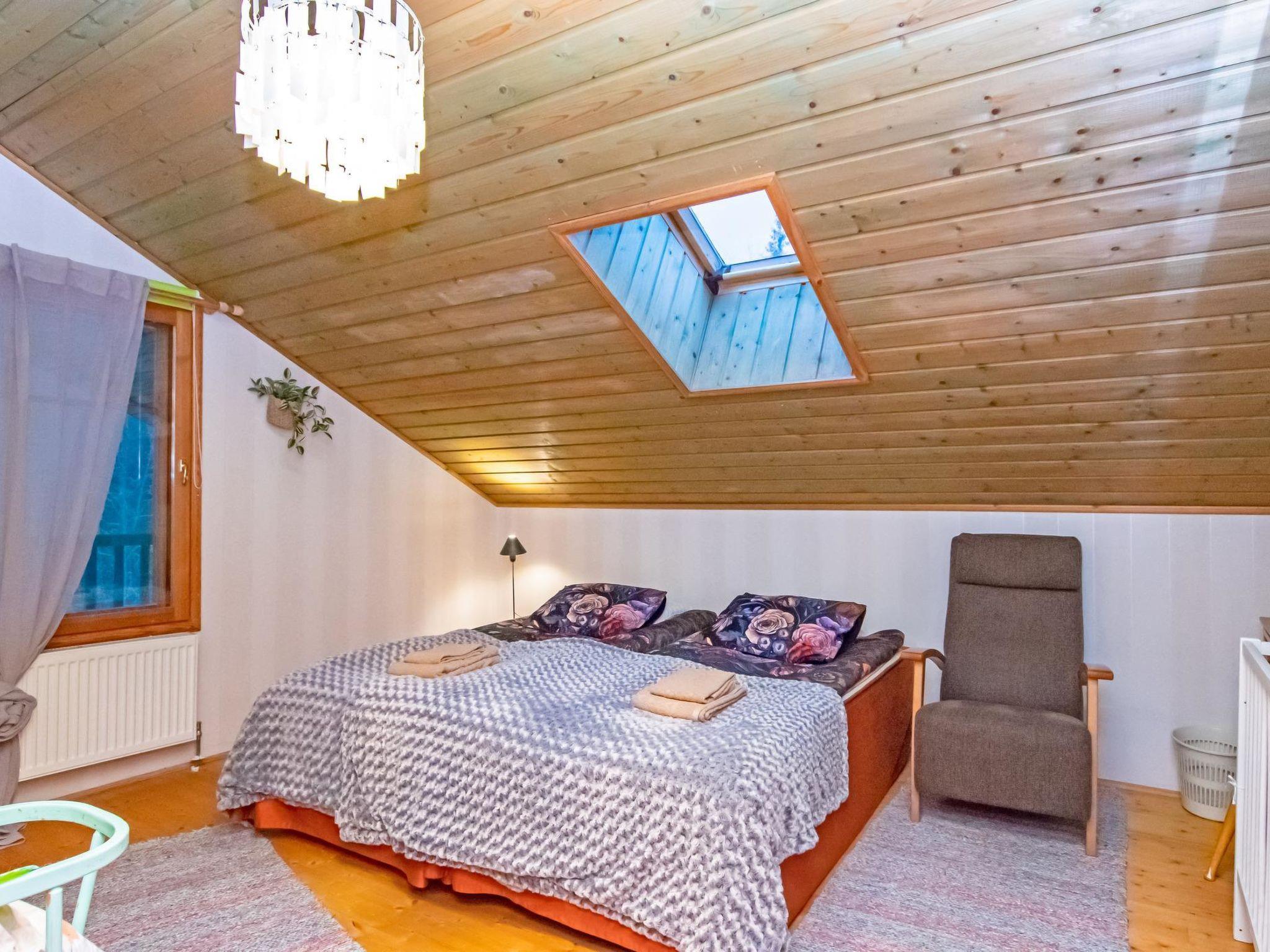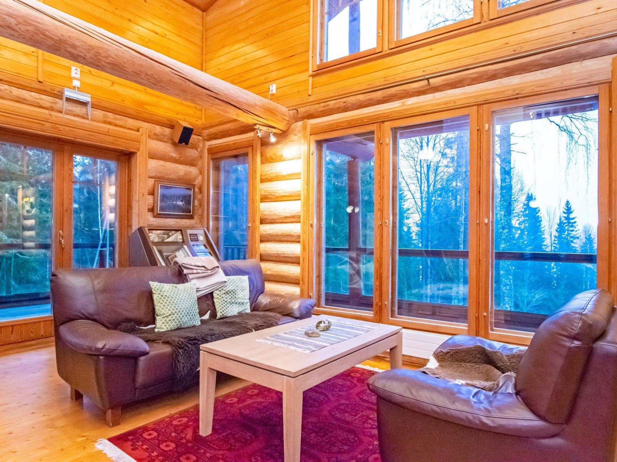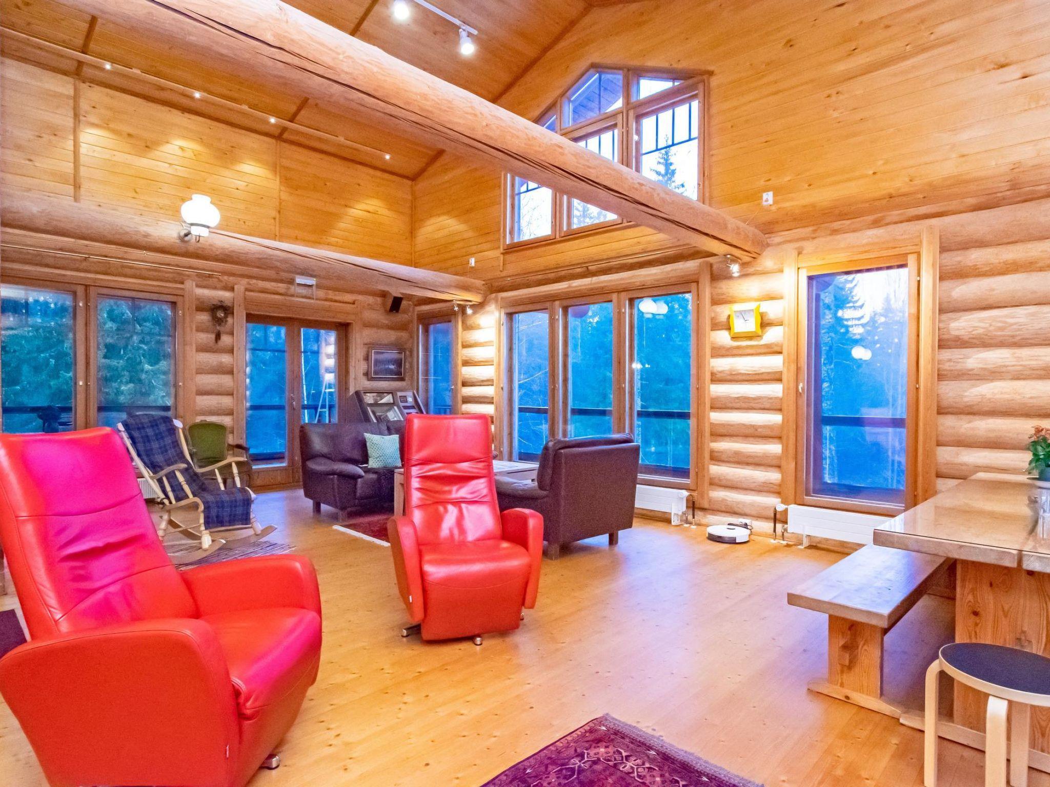 This three-story log villa, handcrafted from logs in 2000, offers a well-designed layout. The main floor features a spacious living room, kitchen, a bedroom with a sofa bed for two, a bathroom with a WC and shower, a utility room, and a balcony.