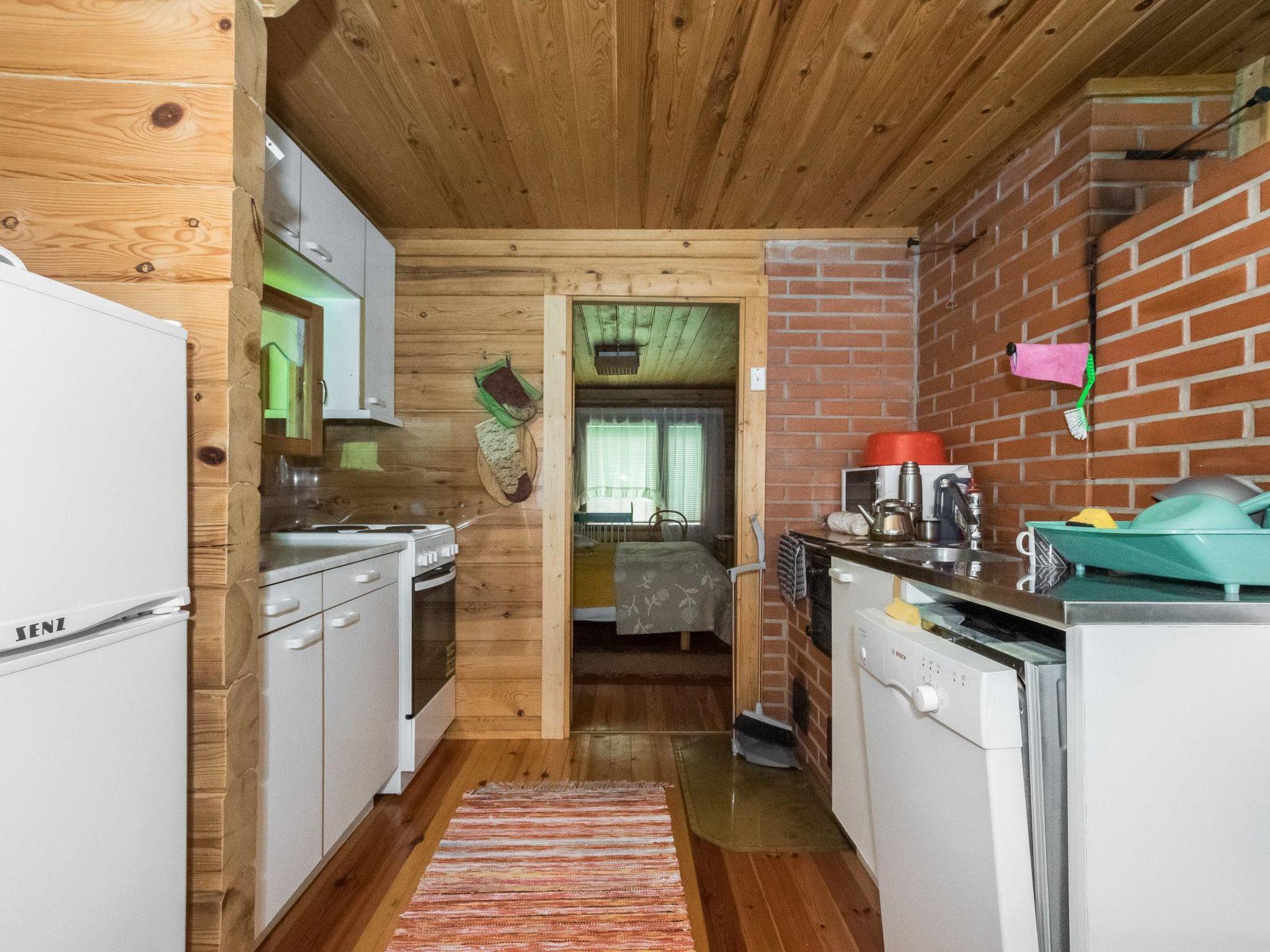 60 km north of Kuopio, L. Onkivesi 15 m (length 35 km, width ab. 5 km), shallow, hard sand bottom, boat. Log cottage 1998, renovated 2010, living room/kitchen with convertible sofa/double bed (as alternative beds), bedroom with 2 beds, low loft (15 m²) with 1 bed and 3 mattresses (on top of stairs hatch), toilet, entry. Washroom with shower cabinet, sauna and roofed terrace. Access to sauna and washroom through porch.