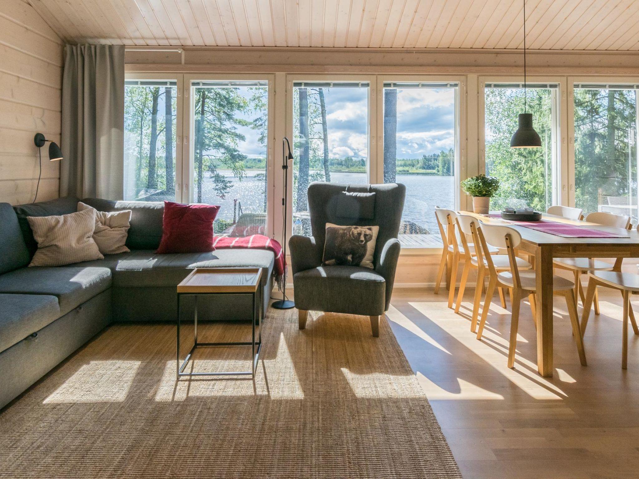 Wooden villa 2016, large kitchen-living room (sofa bed), bedroom 2 beds, bedroom 2 beds, bedroom with one bed and sofa bed. Washroom (2 showers), sauna with views of the lake (wood stove), separate toilet. Extensive partly covered terrace spaces.