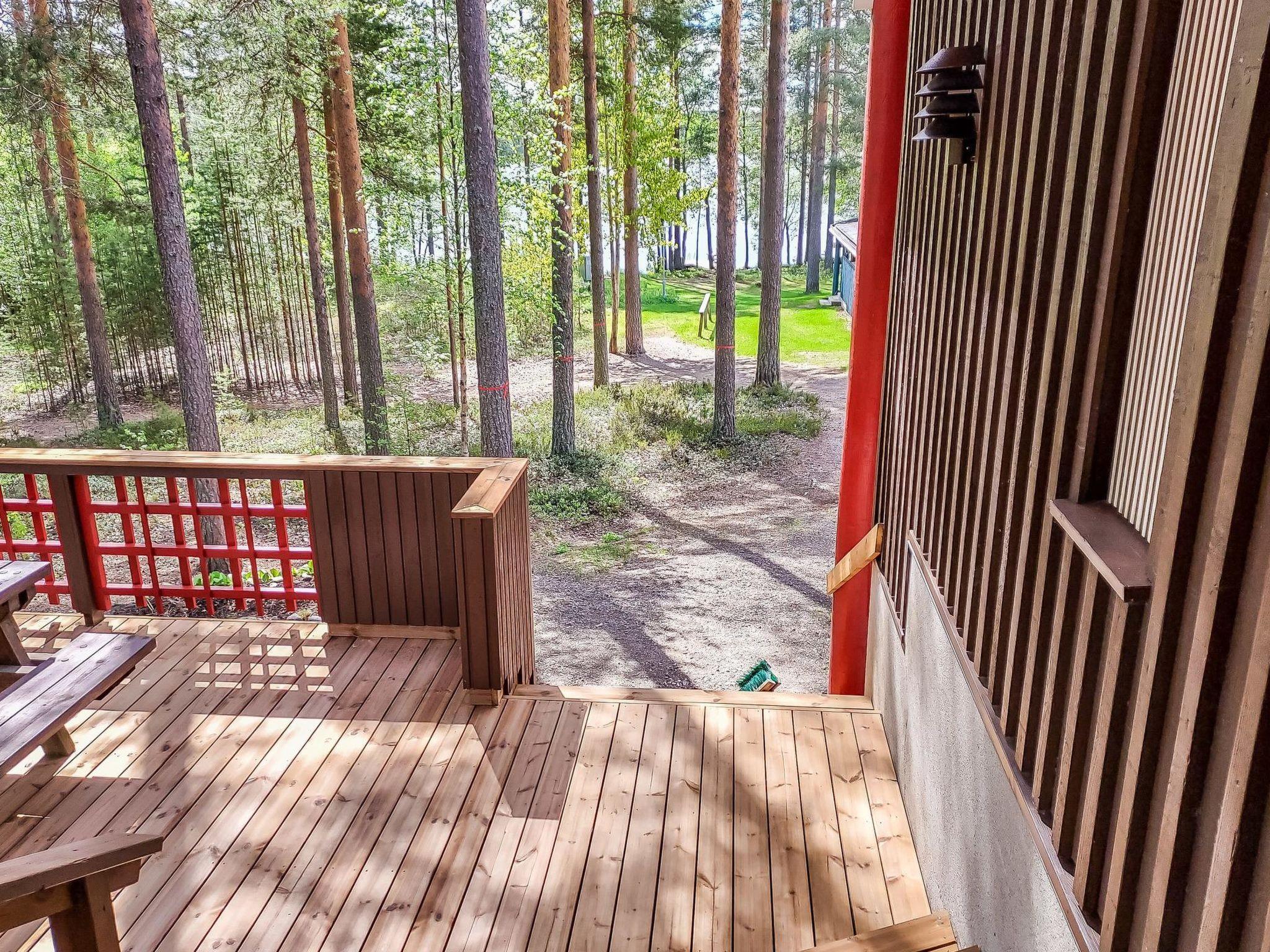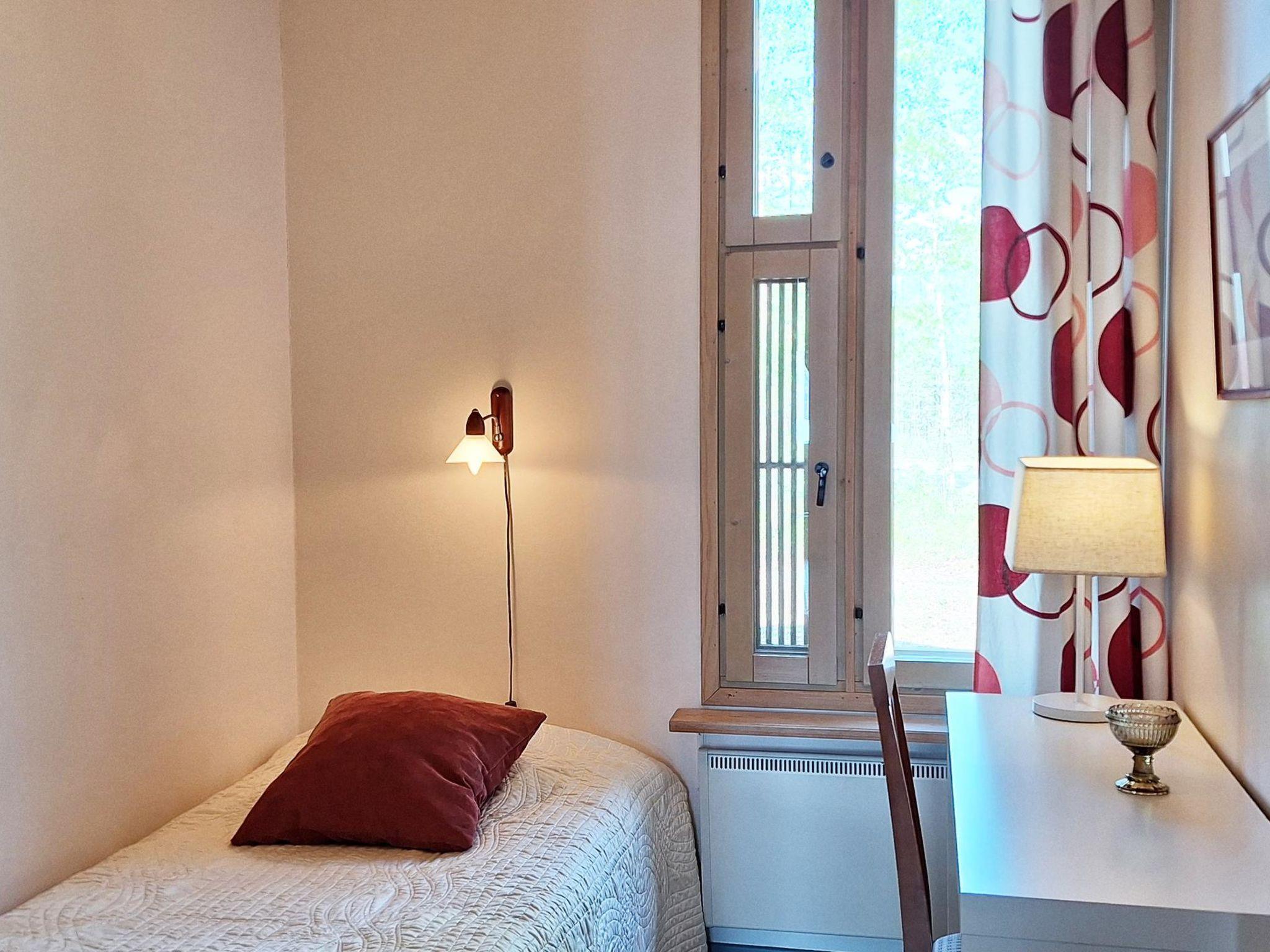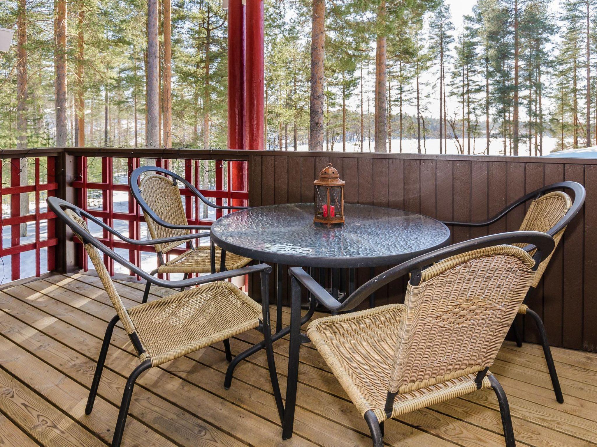77 km north of Joensuu, Pond Käränkälampi 20 m (length 2 km, width 1,5 km), common beach with shallow hard sand bottom, jetty. Wooden/concrete flat 1990, kitchen-living room, bedroom with double bed, bedroom with 1 bed, bedrooms with double bed (140 cm), sleeping gallery with two beds, dressing room, washroom, sauna (elec. stove), veranda and balcony.