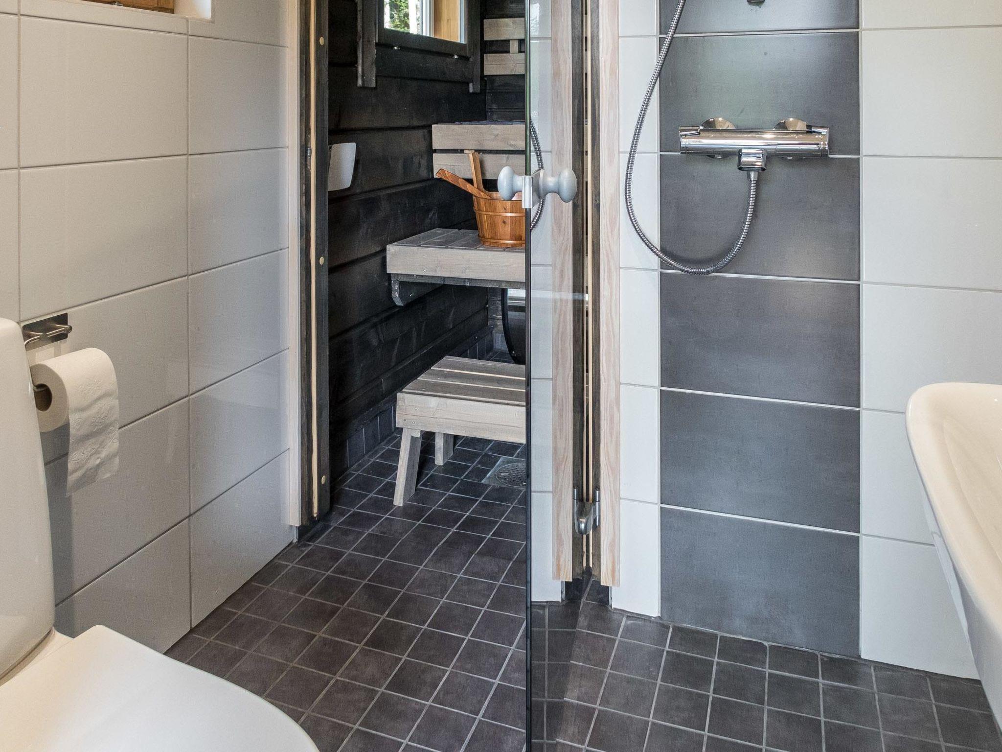 The living area of the cabin is 59 m², including the loft. Living room/kitchen, dining group for 5, heat storing fireplace. On the ground floor, bedroom with double bed, 3 x 80 cm wide beds in the loft. Washroom/WC, wood-burning sauna stove in the sauna.