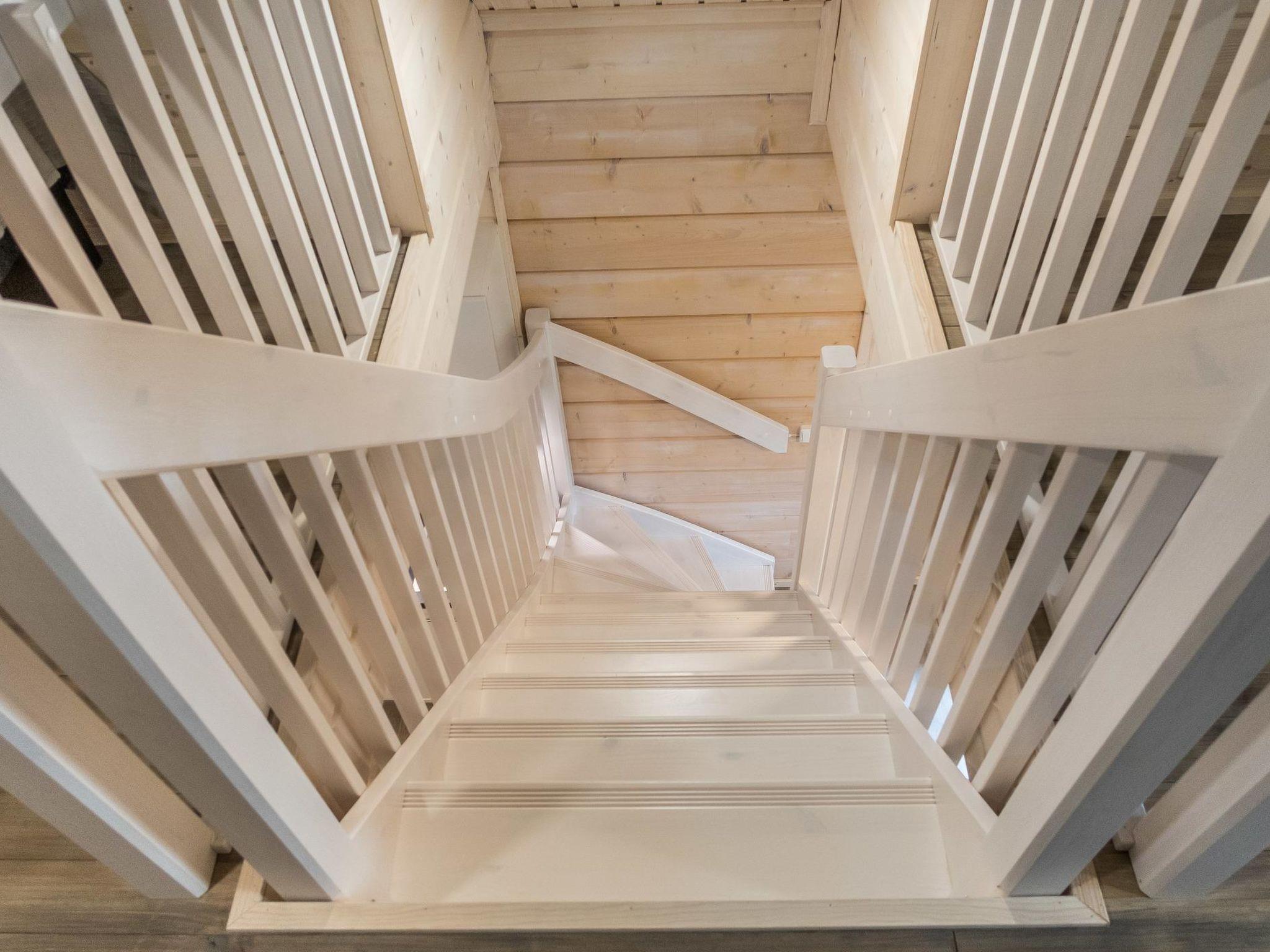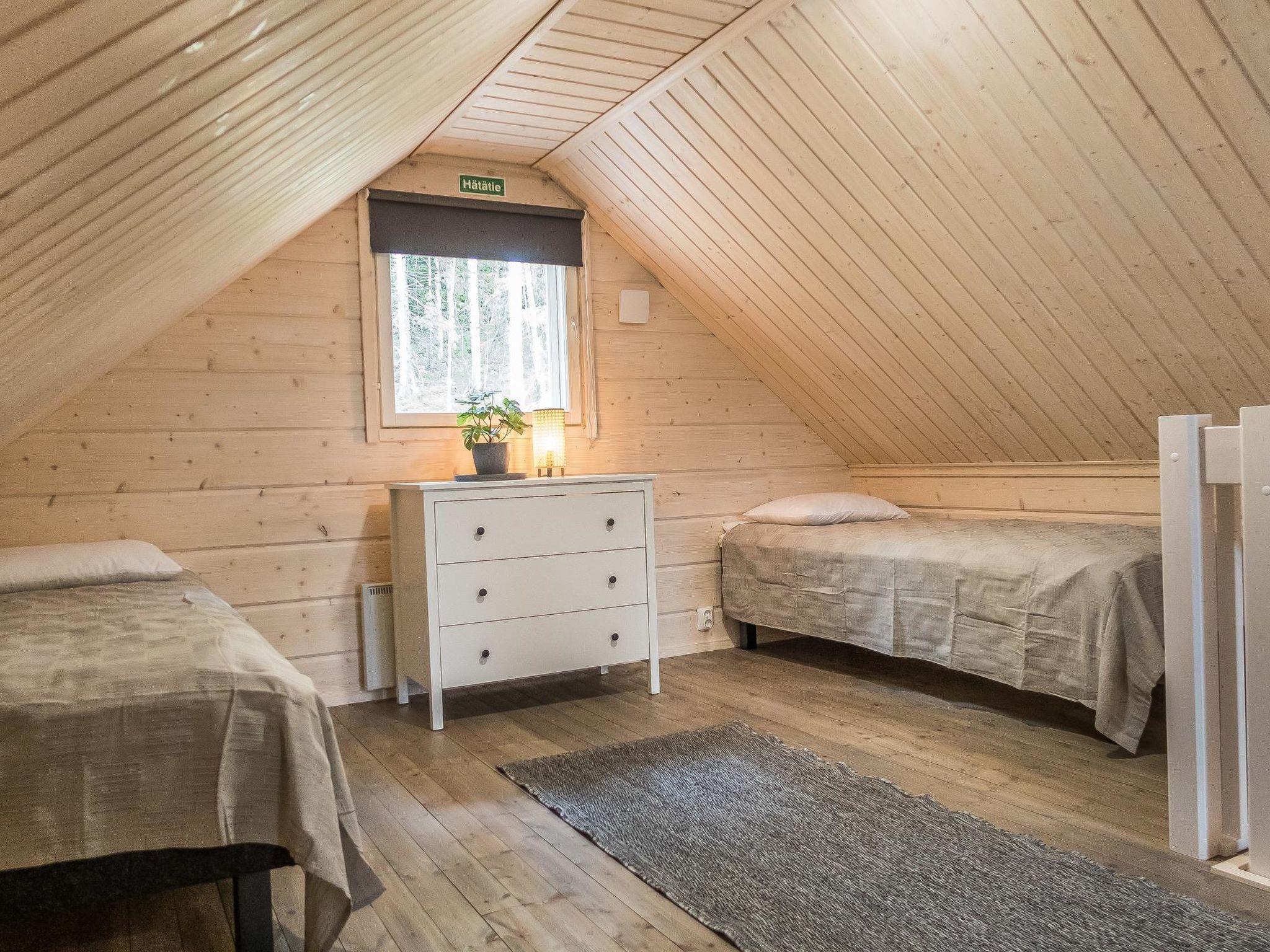 The living area of the cabin is 59 m², including the loft. Living room/kitchen, dining group for 5, heat storing fireplace. On the ground floor, bedroom with double bed, 3 x 80 cm wide beds in the loft. Washroom/WC, wood-burning sauna stove in the sauna.
