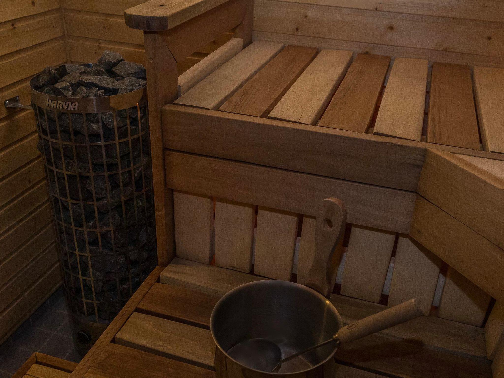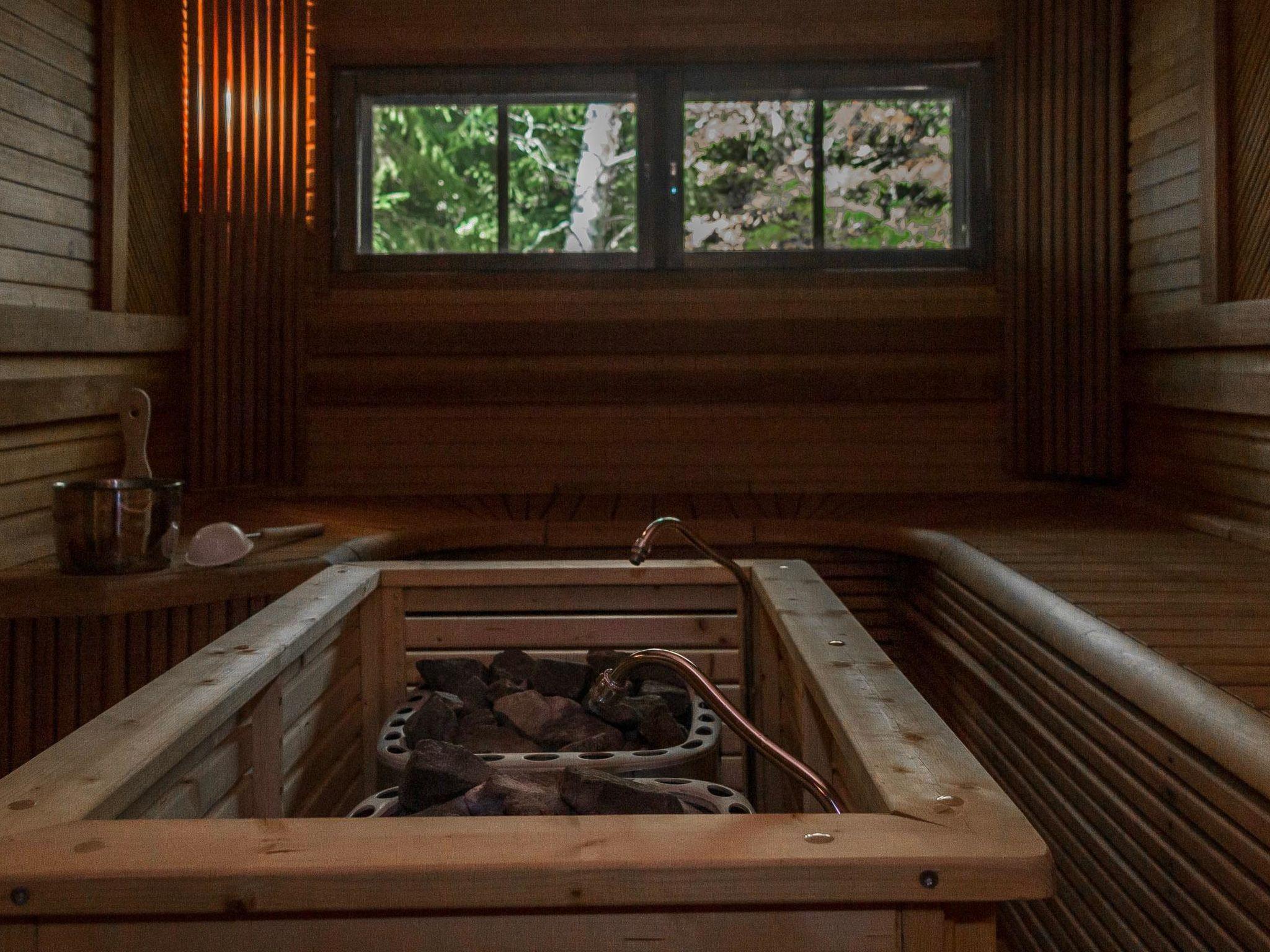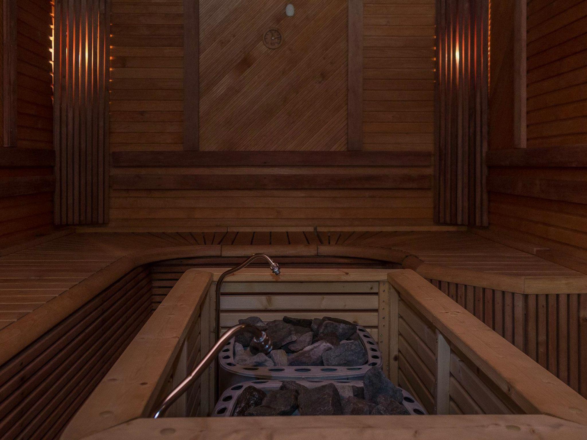 Separate sauna section with room with fireplace (gas fire), washroom (4 showers) and large sauna (electric stove). Outside the sauna section is a large hot tub which is included in the rent. There is a porch round the entire chalet and all the separate buildings are under the same roof. In the front of the villa there is also a glass pavilion with infrared heating. Please note that it is forbidden to stay/walk on the lid of the outdoor hot tub. If the cover breaks during the reservation, the customer will be charged afterwards min. 500 euros.