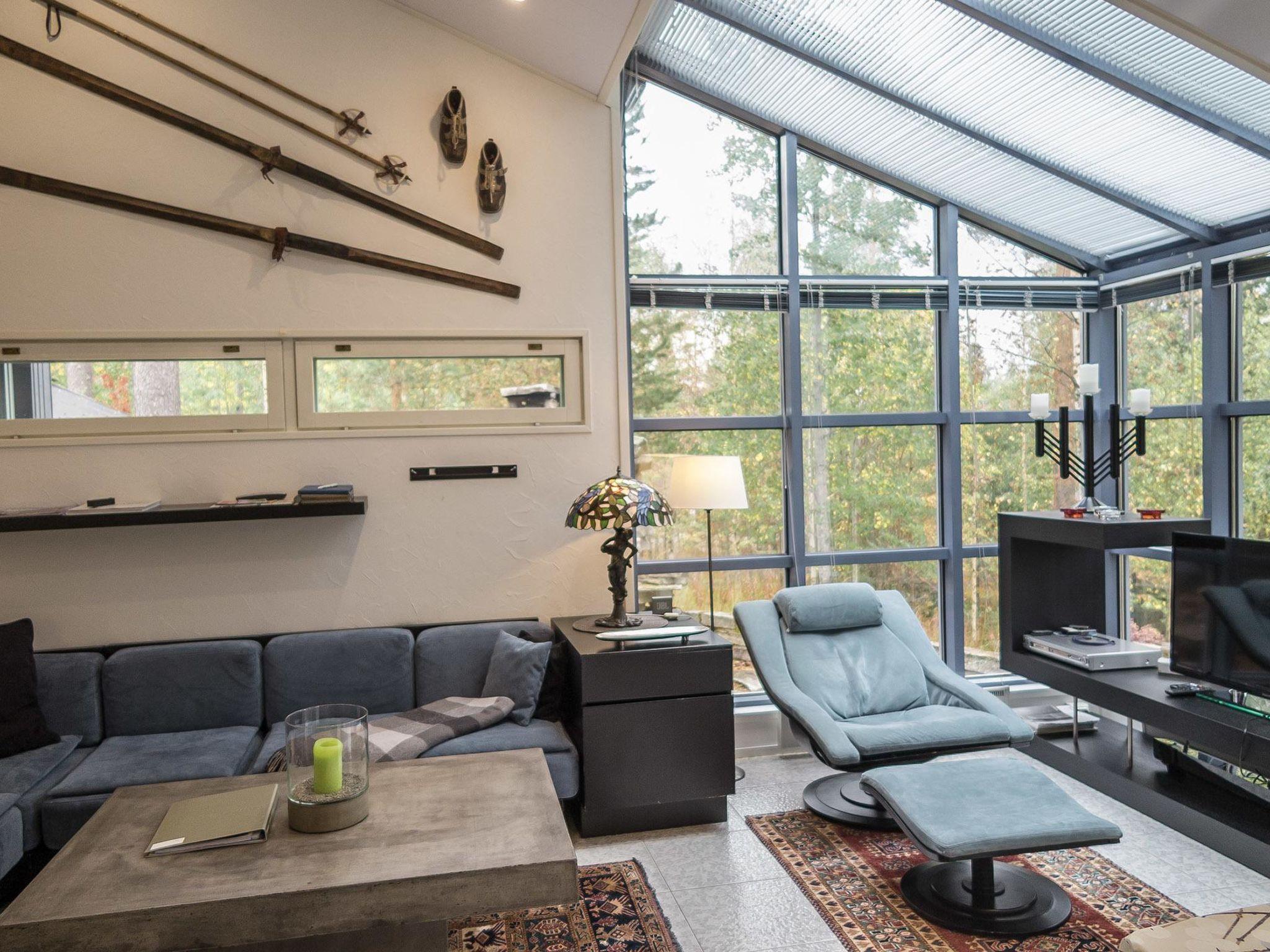 65 km north-east of Kuopio, L.Syväri 400 m, shared shore 1.5 km, no boat. Wood/stone Atelje 4 chalet in heart of Tahkovuori Ski Centre, living room/kitchen, bedroom double bed, upstairs bedroom double bed and small bedroom 2 beds (access via large bedroom), washroom, sauna (electric stove), 2 porches. Cottage yard has permanent grill facility.