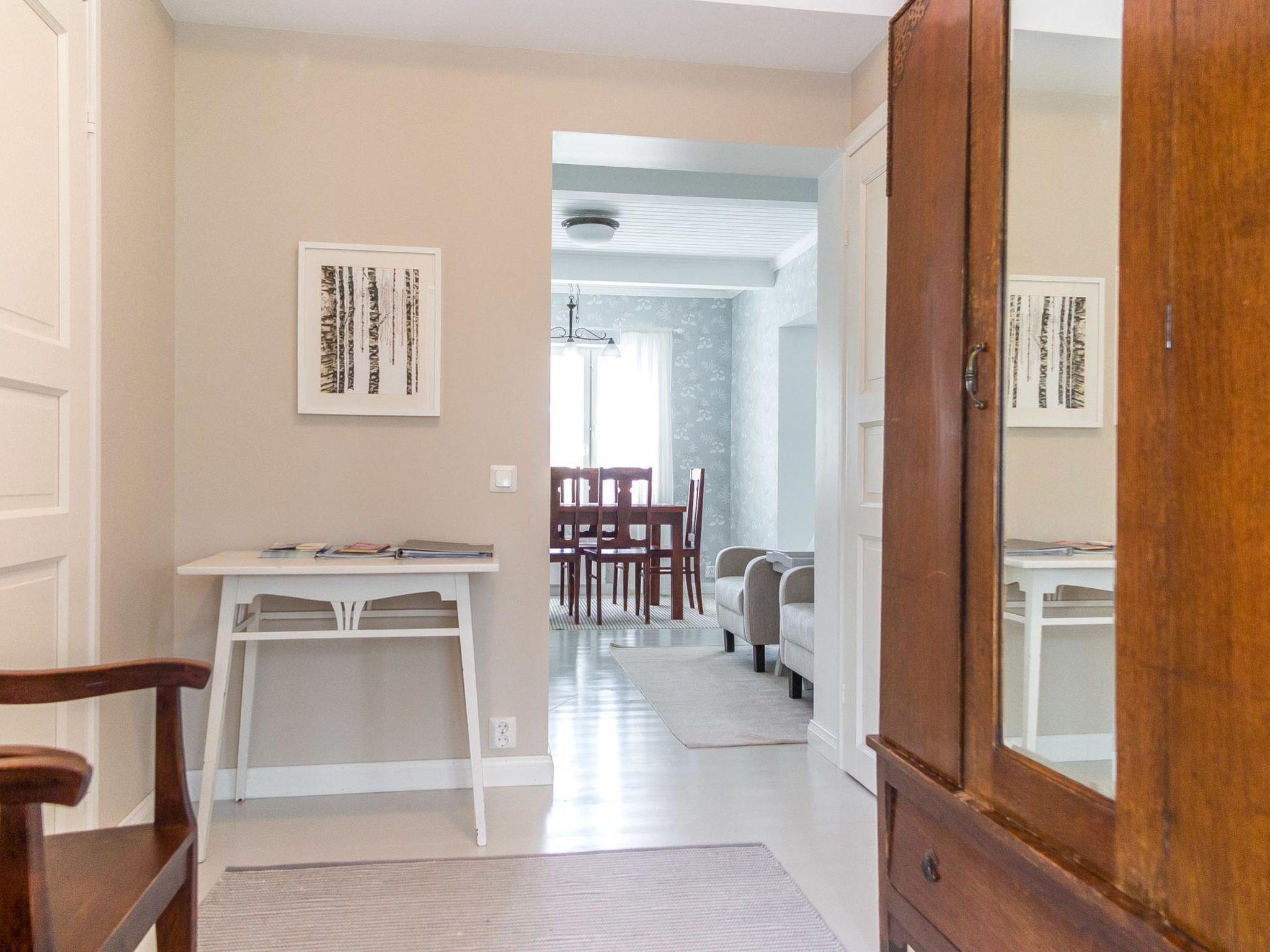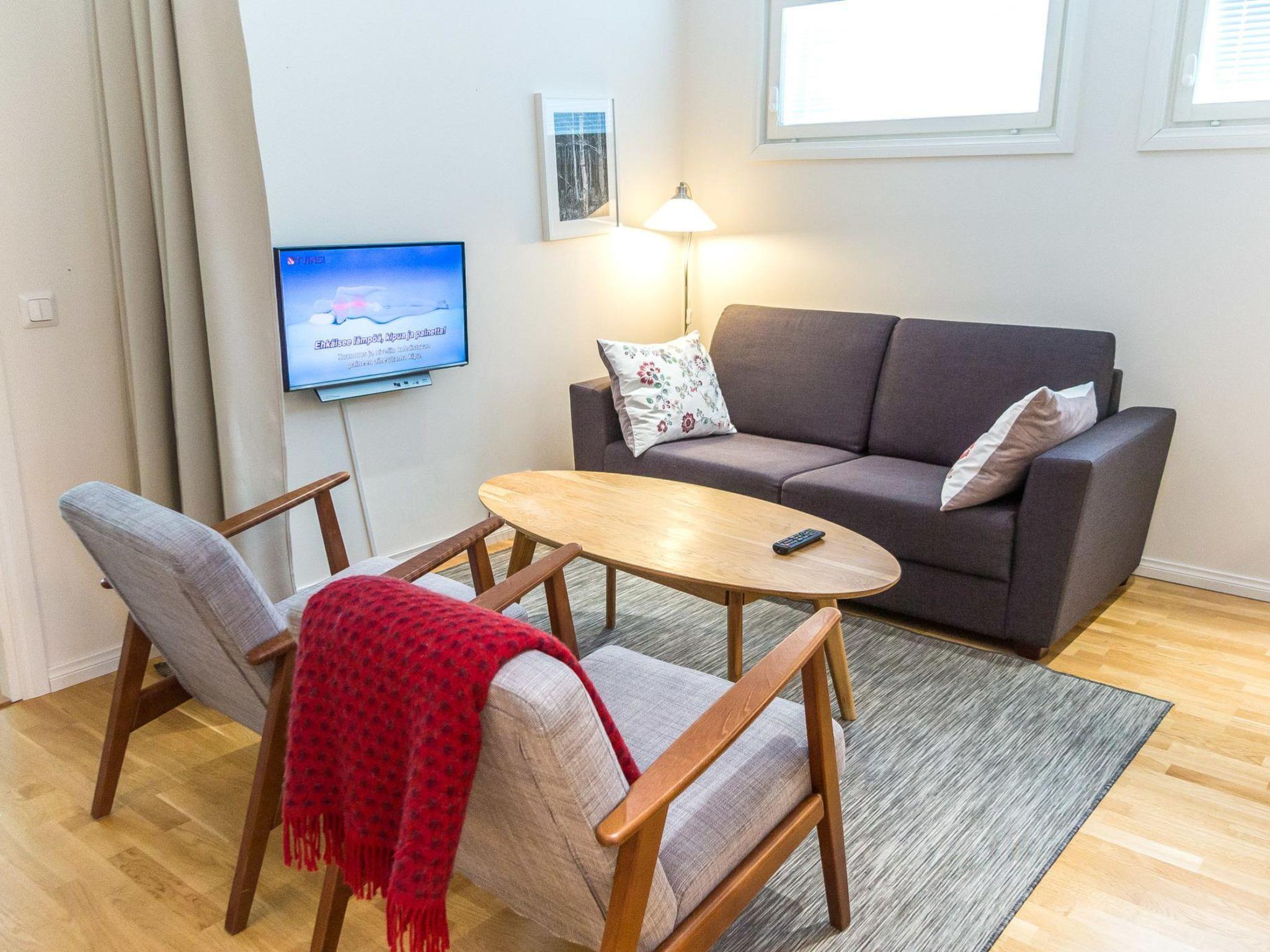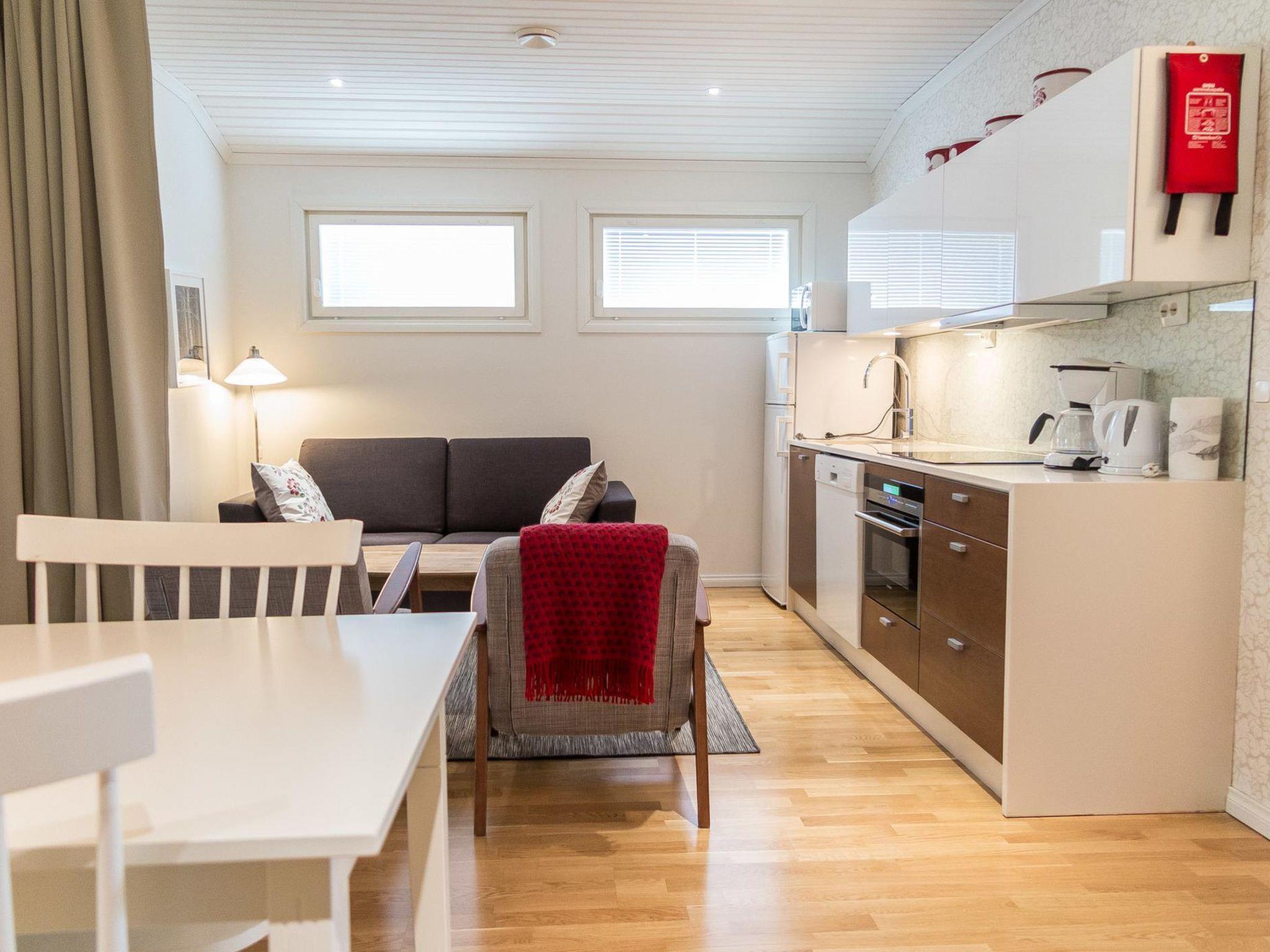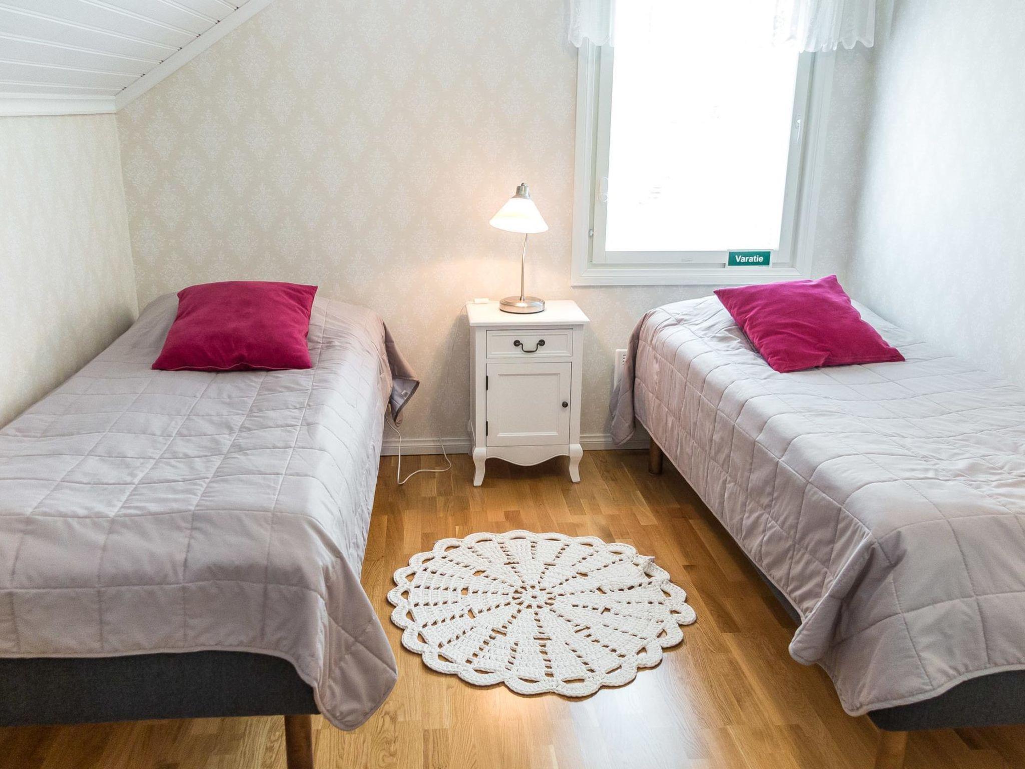 Upstairs: 1 bed room with double bed and child bed (75 cm x 190 cm) and 2 bed rooms with 2 separate beds. WC, shower and lounge area with kitchen and sofa-bed (140 cm) for 2 persons. Upstairs there is also dishwahser, fridge/freezer, electric stove, microwave oven and TV. In house mechanical ventilation.