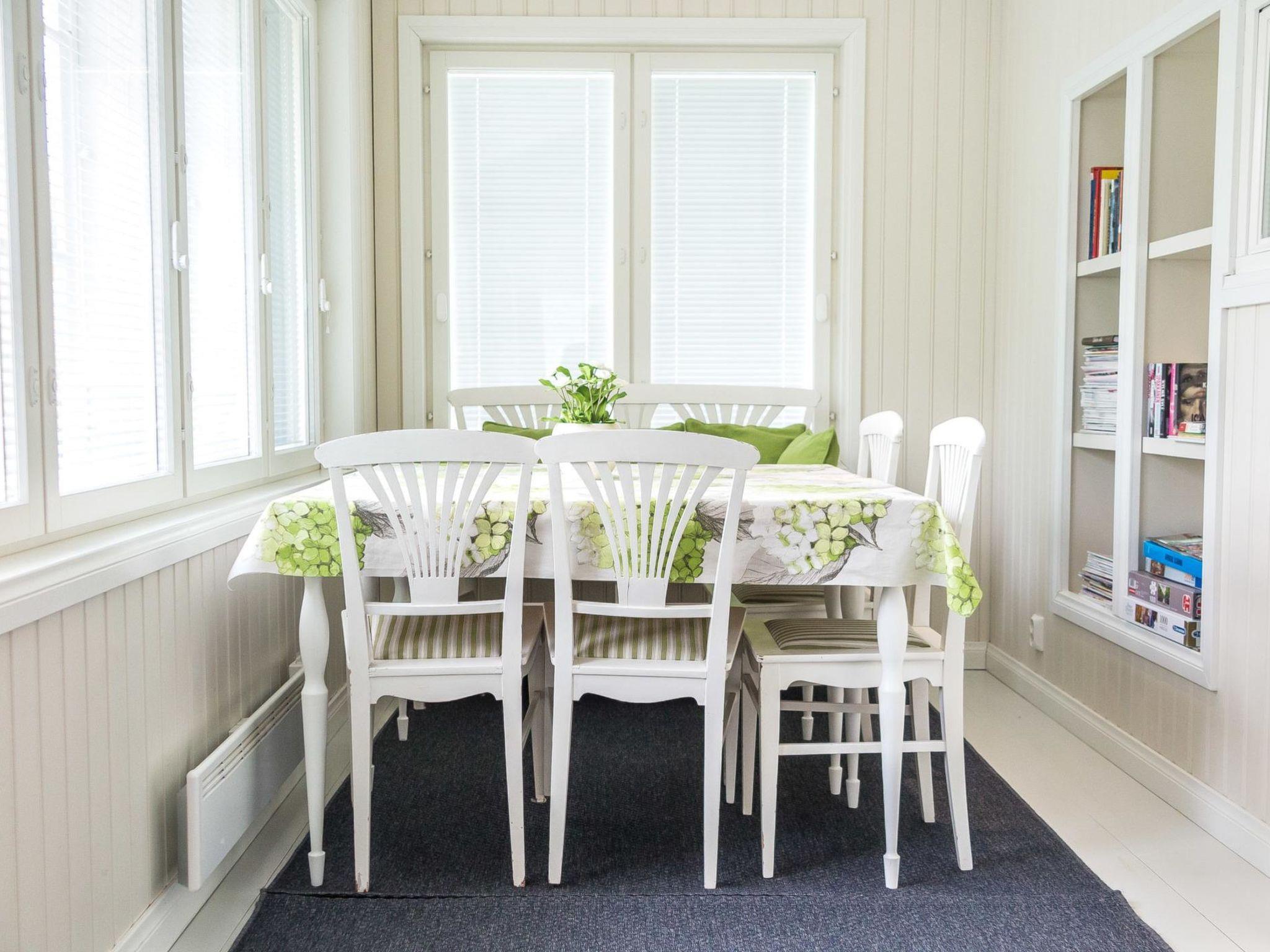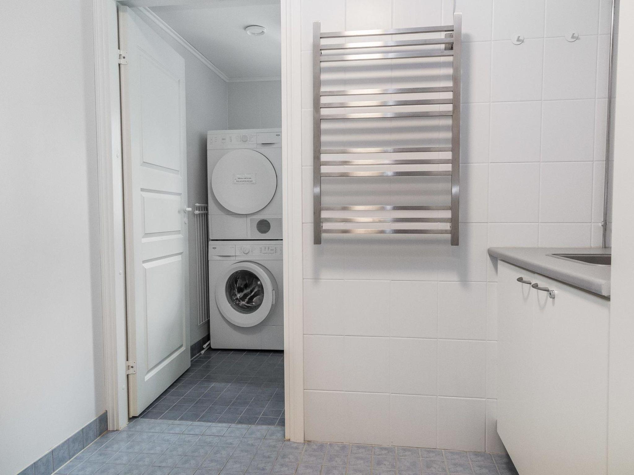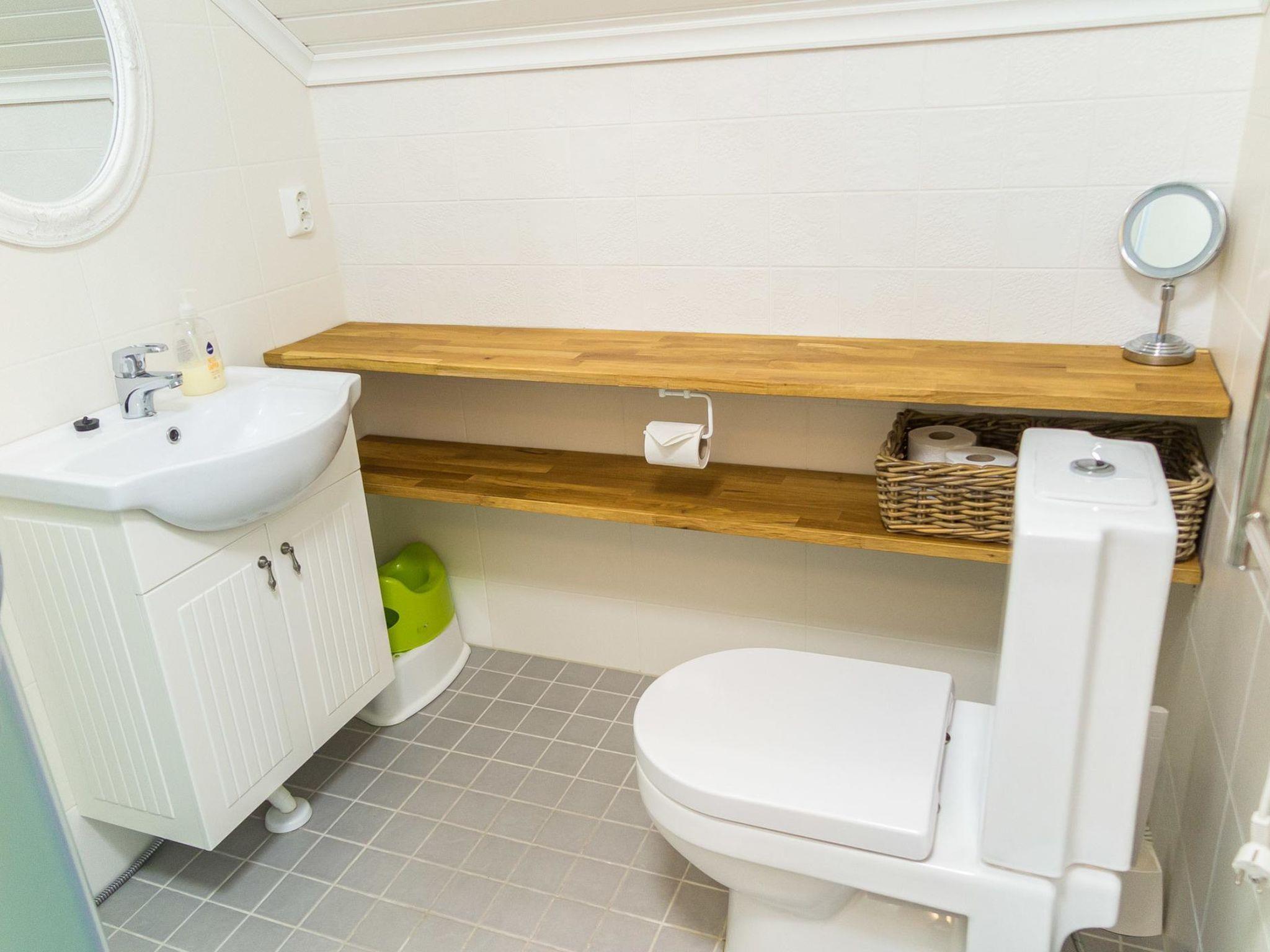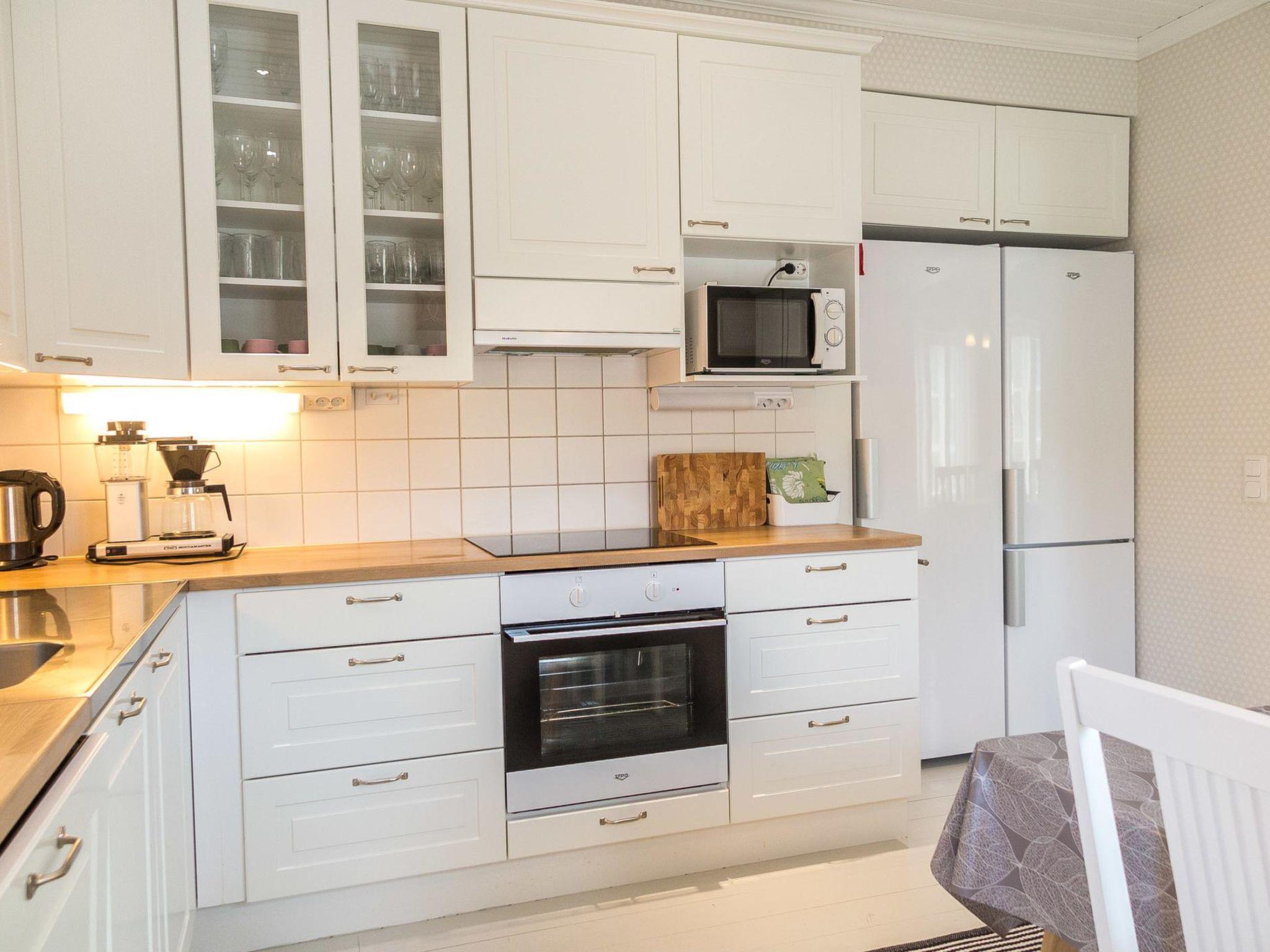 Downstairs: kitchen, dining area and living room, possibility to made 2 extra bed in sofa-bed (140 cm). Covered veranda, utility room (washmachine and tumble-dryer), washroom, sauna (electric stove) and 2 toilets. In dining room is wooden warming oven.
