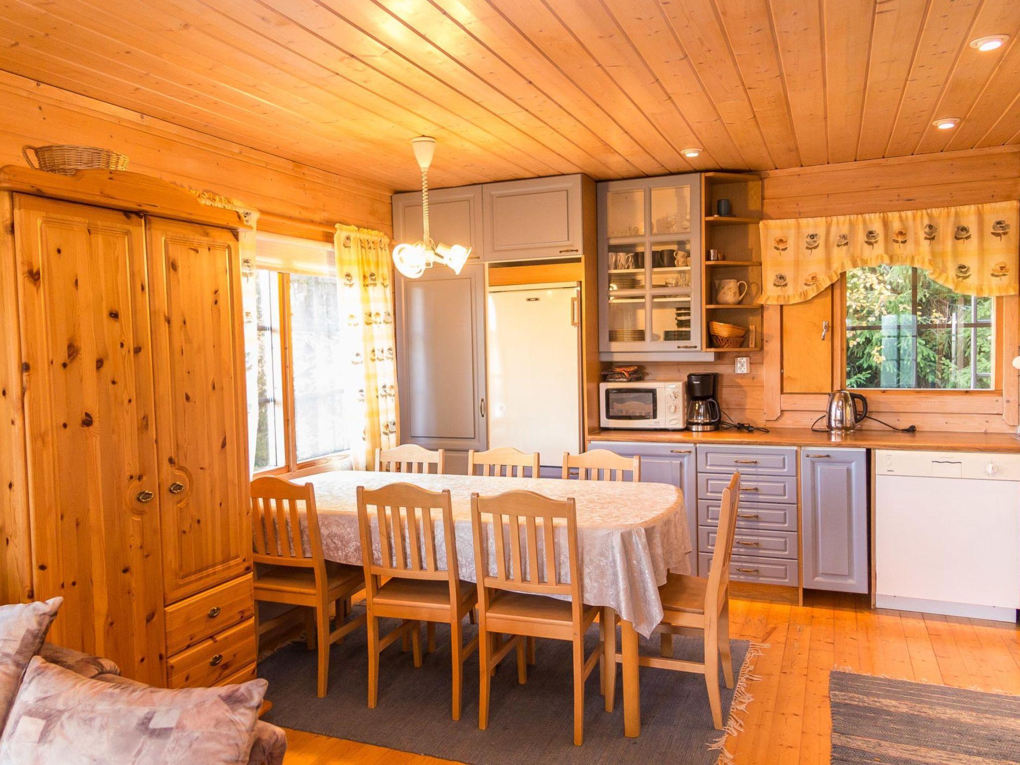 Log cabin, which is built in 2000, has two floors; in the ground floor kitchen, washroom, sauna (wood-burning stove), hall, terrace. Upstairs 2 bedrooms with double beds (140 cm wide) + 1 bed in each, balcony. Rather steep stairs to the upper floor.