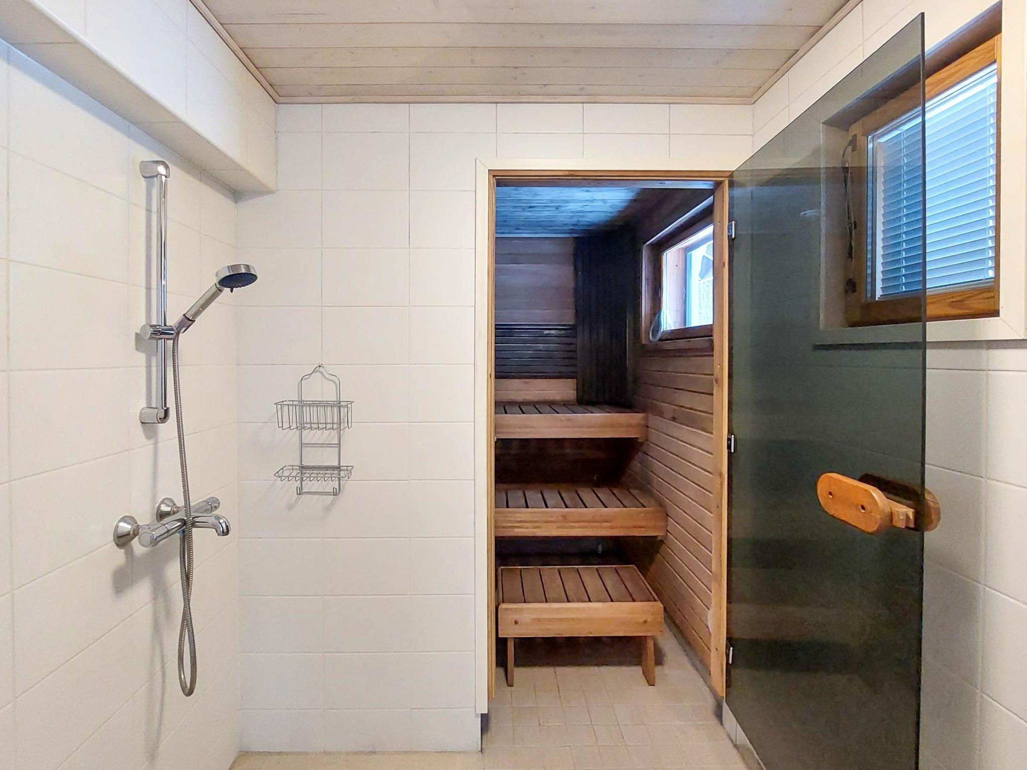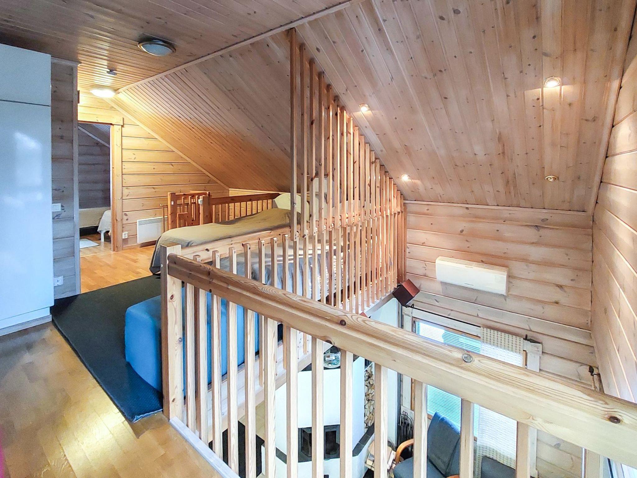 Semidetached log home from 2007, living room/kitchen, bedroom with double bed, washing room (2 showers), dressing room, WC, sauna (electric stove) terrace, upstairs bedroom with 2 beds, hall with 2 beds, TV and WC. A shared washing machine is located in the basement floor, access from outside.