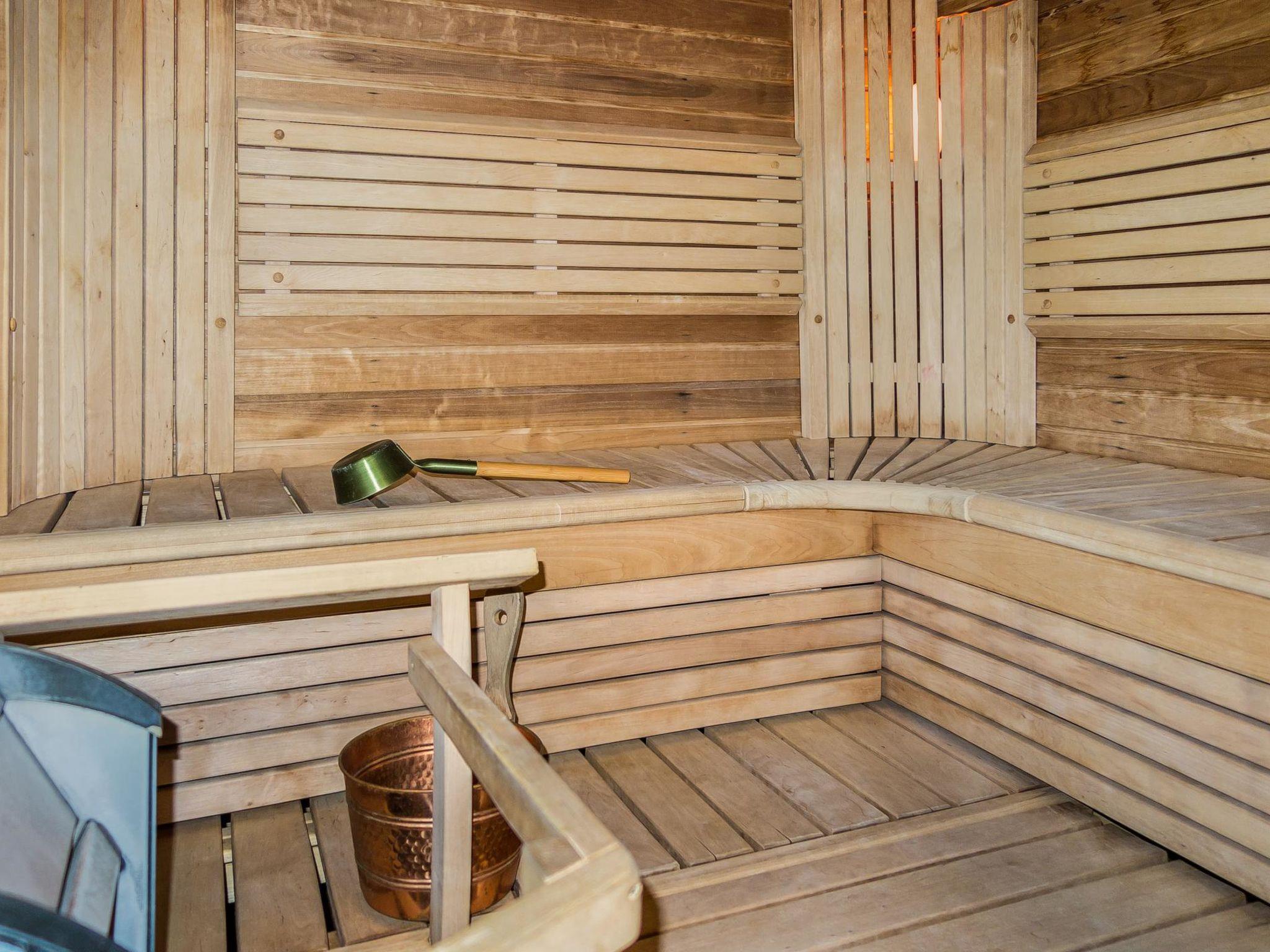 Semidetached log home from 2007, living room/kitchen with sofa-bed for 1 person, bedroom with double bed, washing room, dressing room, WC, sauna (electric stove) terrace, upstairs bedroom with 2 separate beds +1 child bed, hall with 2 beds, TV and WC. A shared washing machine is located in the basement floor, access from outside.