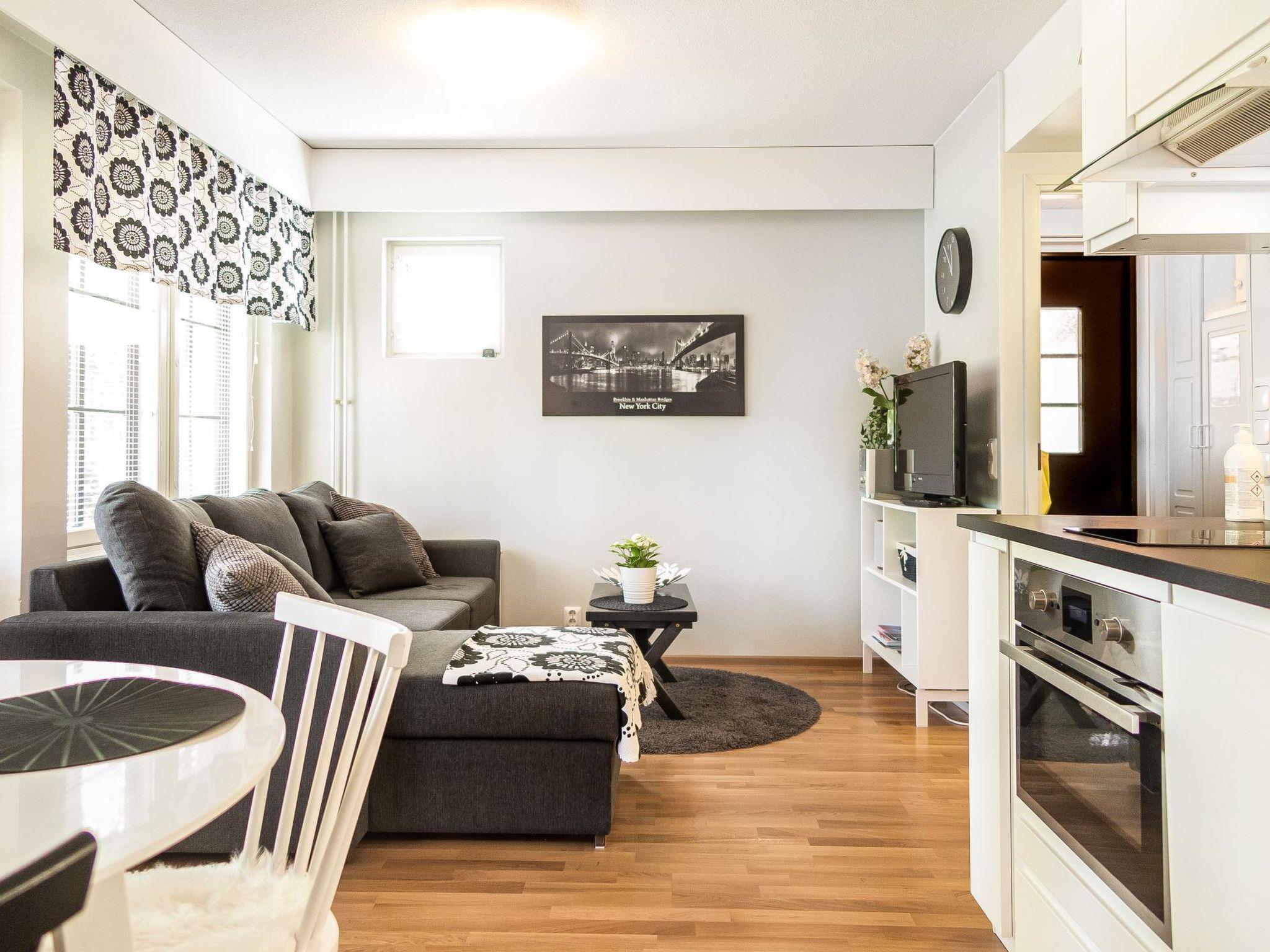 The apartment was renovated in 2018, a kitchenette with a double sofa bed (width 140 cm), a bedroom with a double bed (160 cm wide), a washroom with a toilet, a sauna (electric stove), and a large glass terrace. The specialty is the electric oven, which also works as a microwave.