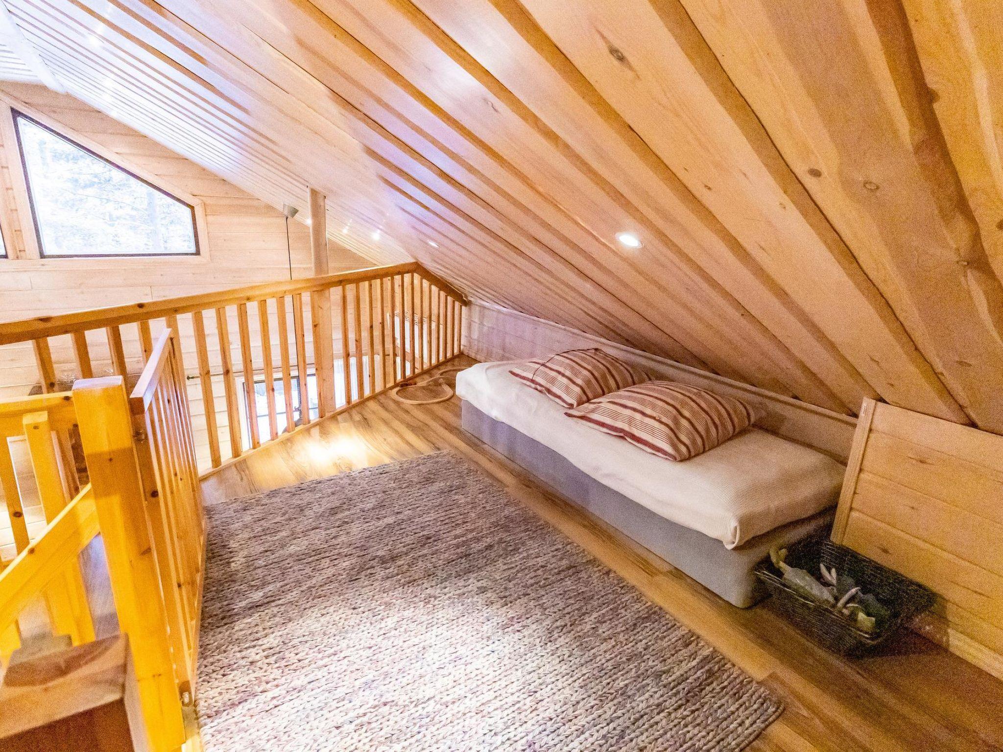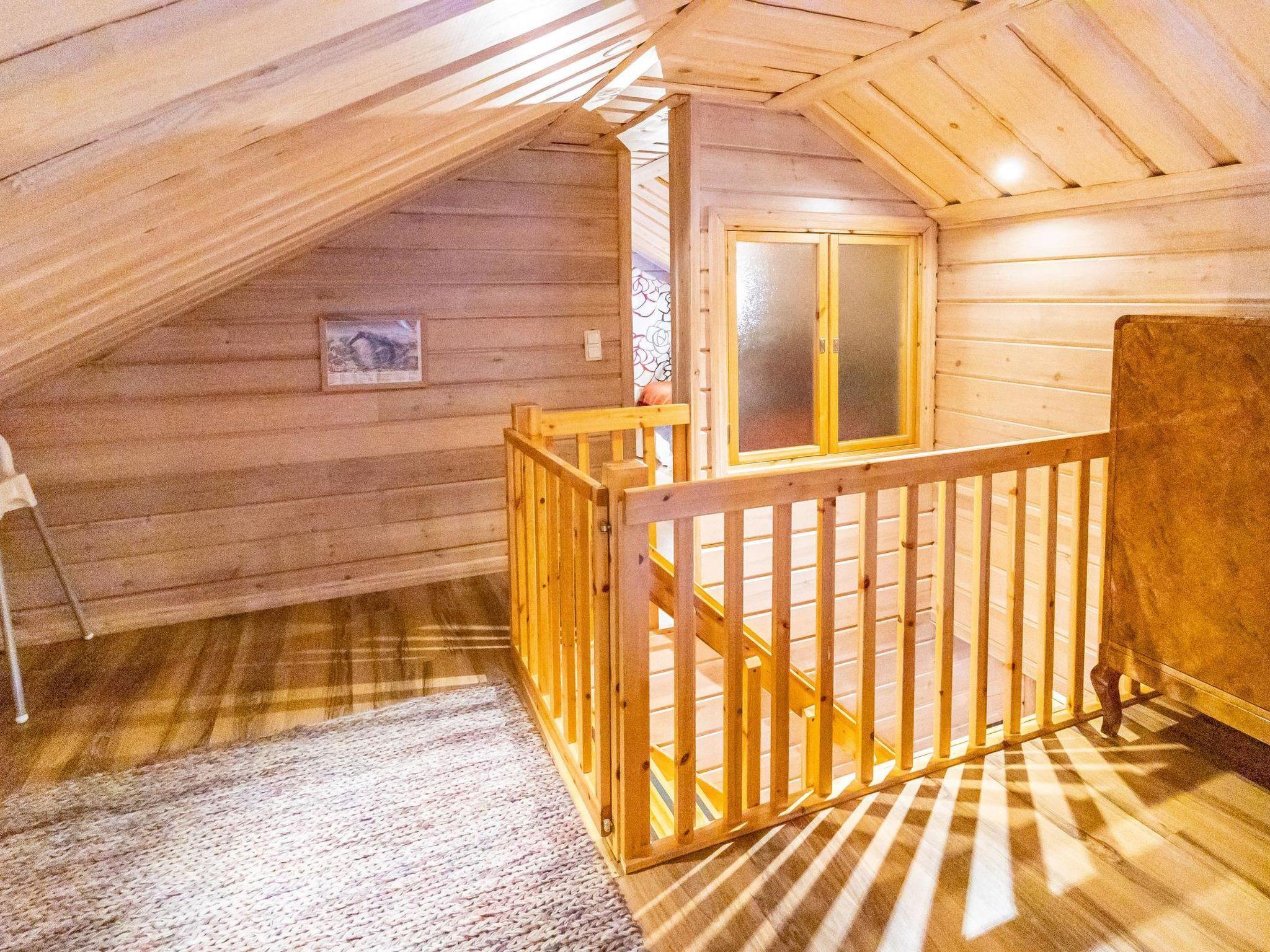 51 km north from Kemijärvi. Log cottage built in 2006, with living room/kitchen, bedroom with double bed, bedroom with two single beds, dressing room, washroom, sauna (electric stove) and toilet. Upstairs sleeping loft with two single beds and two mattresses. Open balcony, open porch and separate barbecue shelter. Children's equipment included: baby cot, highchair, potty and a gate for stairs.