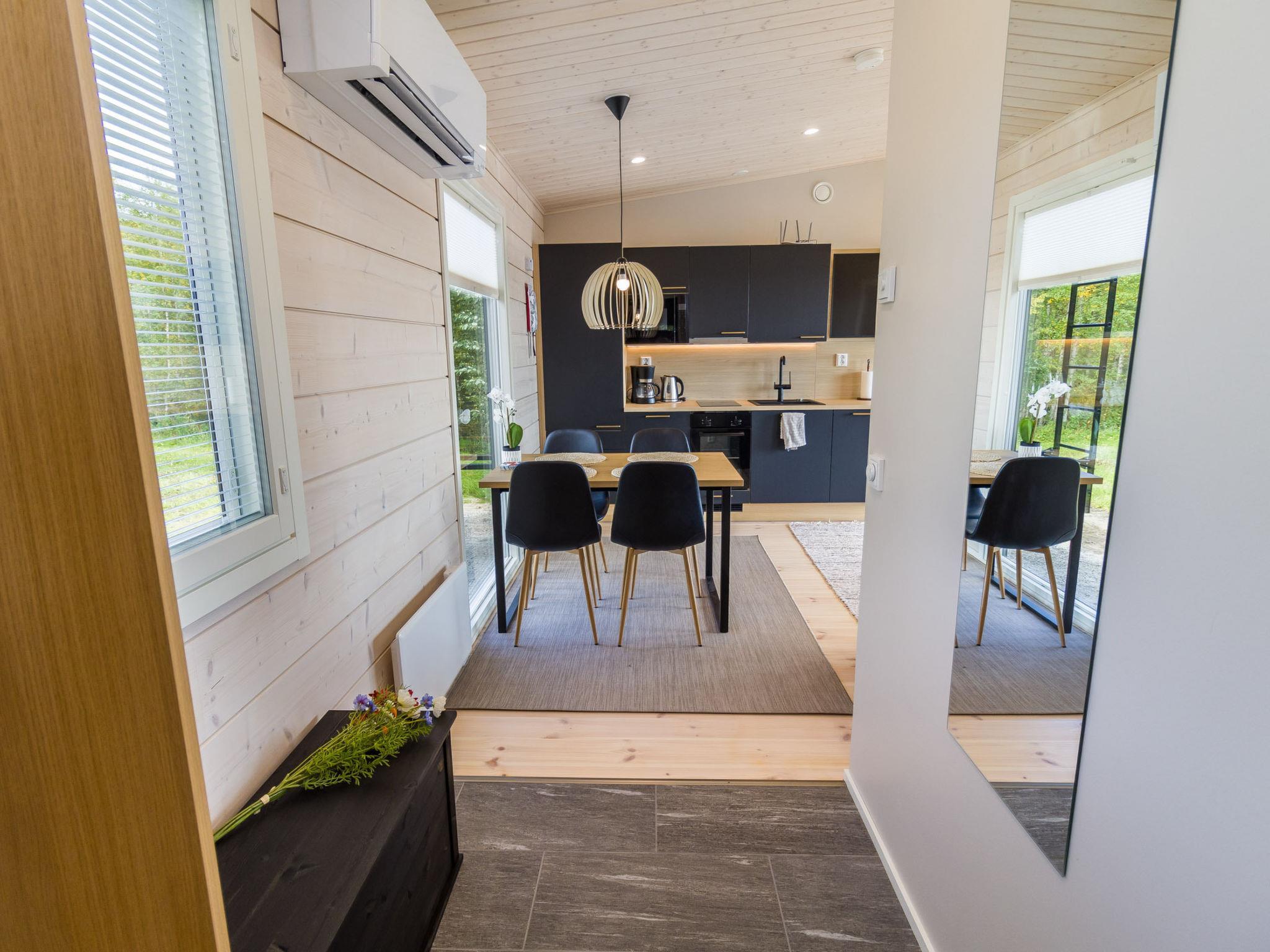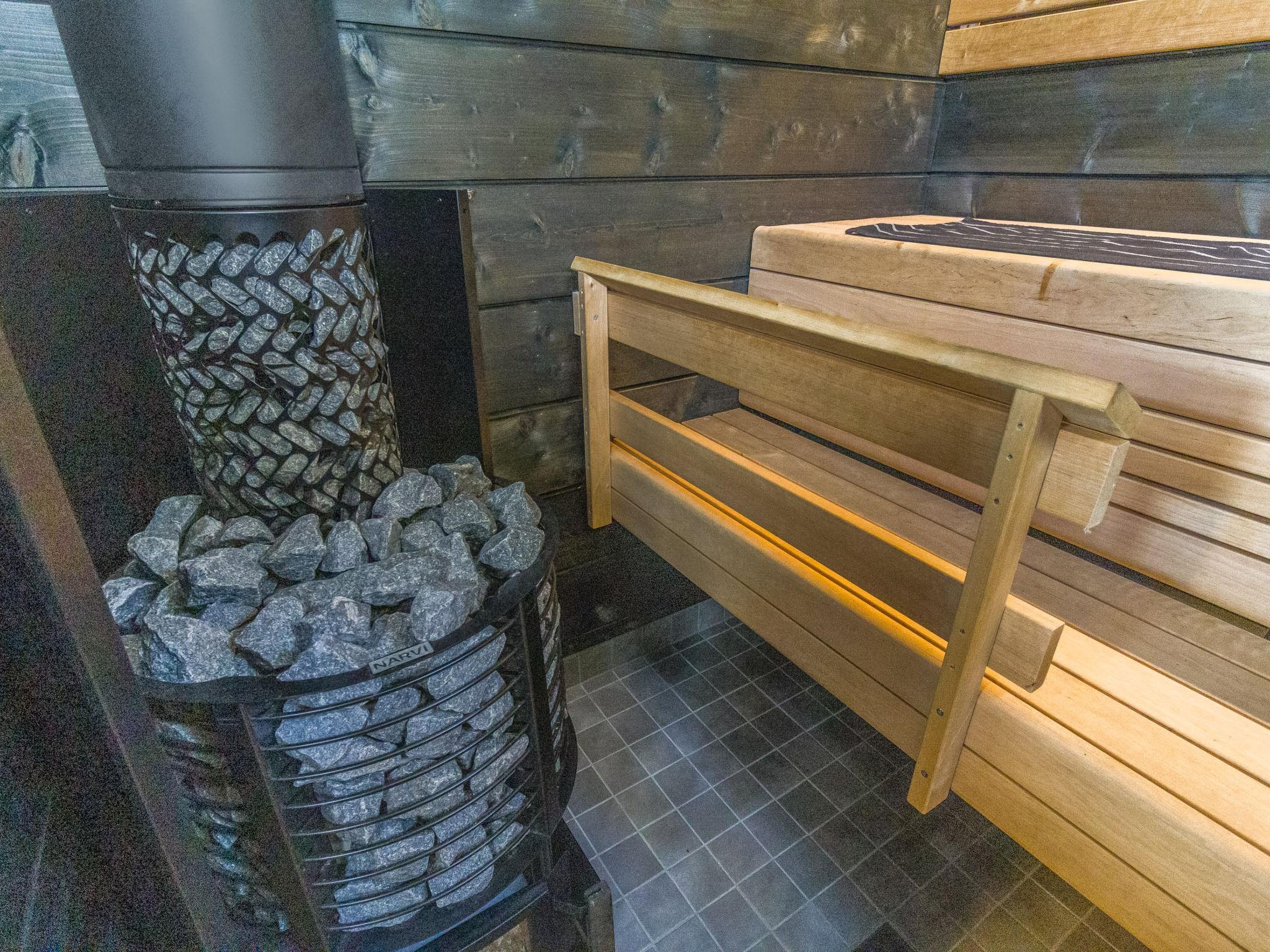 A living room/kitchen provides a cozy setting for cooking and dining, while the wood-heated sauna adds a relaxing touch to your holiday. The tranquil location, private beach, and modern facilities ensure a comfortable and enjoyable stay year-round.