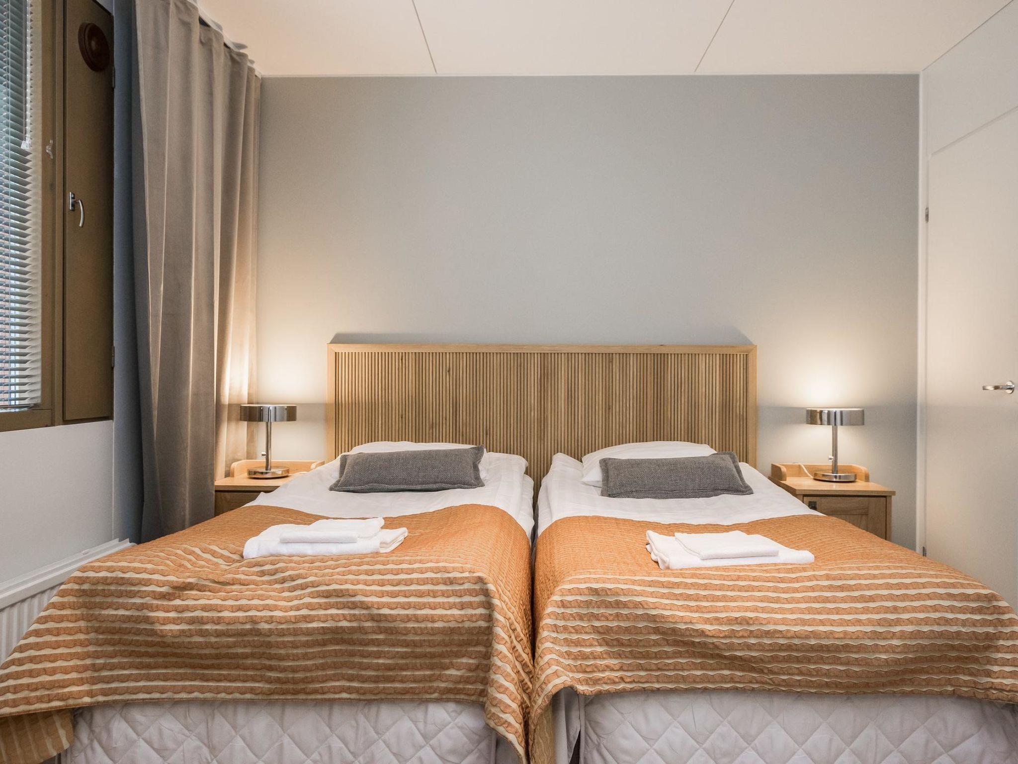 Apartment in wood-built row house, house is built in 1980 and renovated in 2022. Apartment has kitchen, living room, 2 bedrooms with 2 beds in each, washroom with shower, WC and terrace.