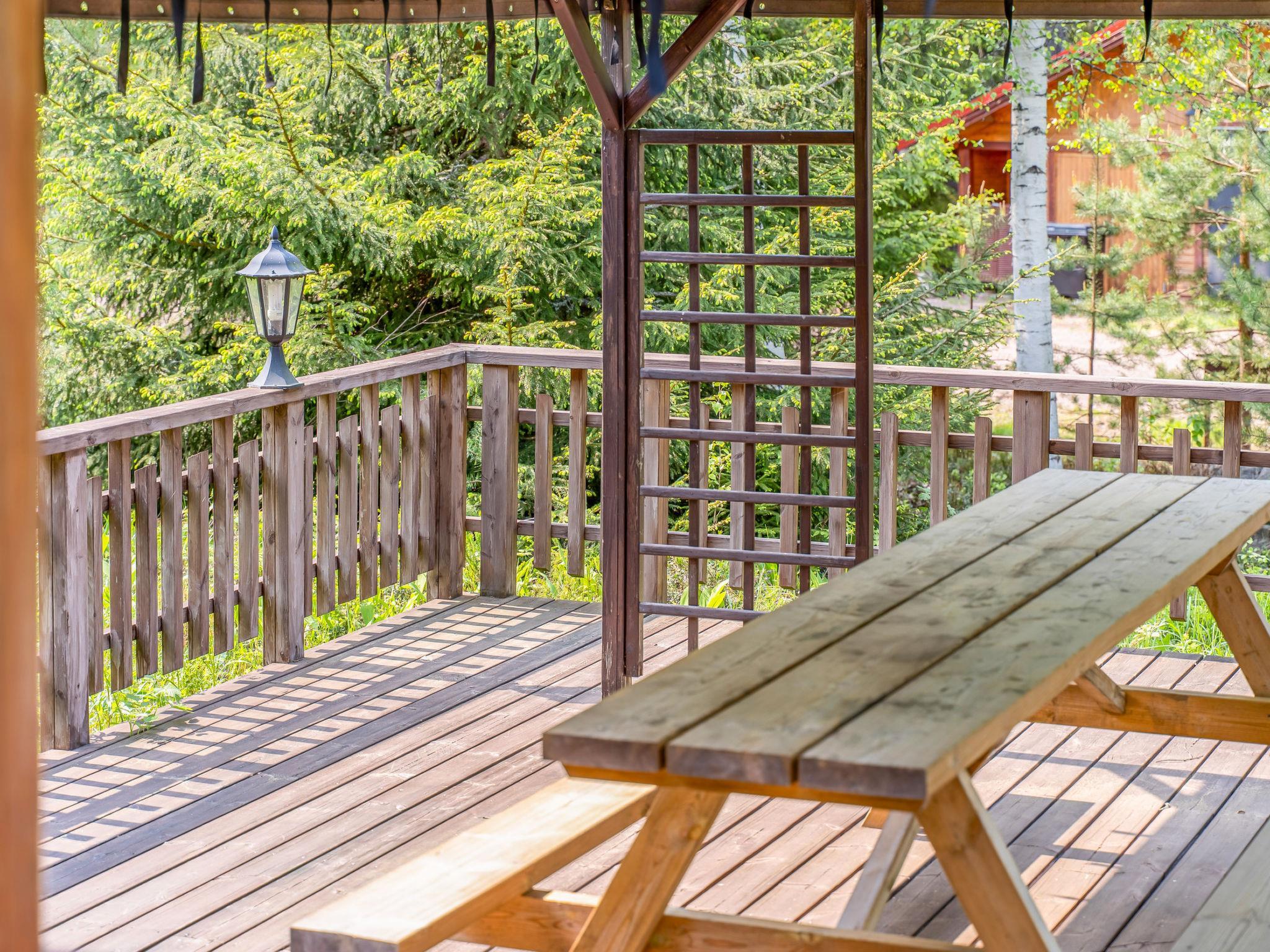 The year-round lakeside sauna has a wood-burning stove, washing water from the heater tank. There is an outdoor hot tub on the sauna terrace for free use.