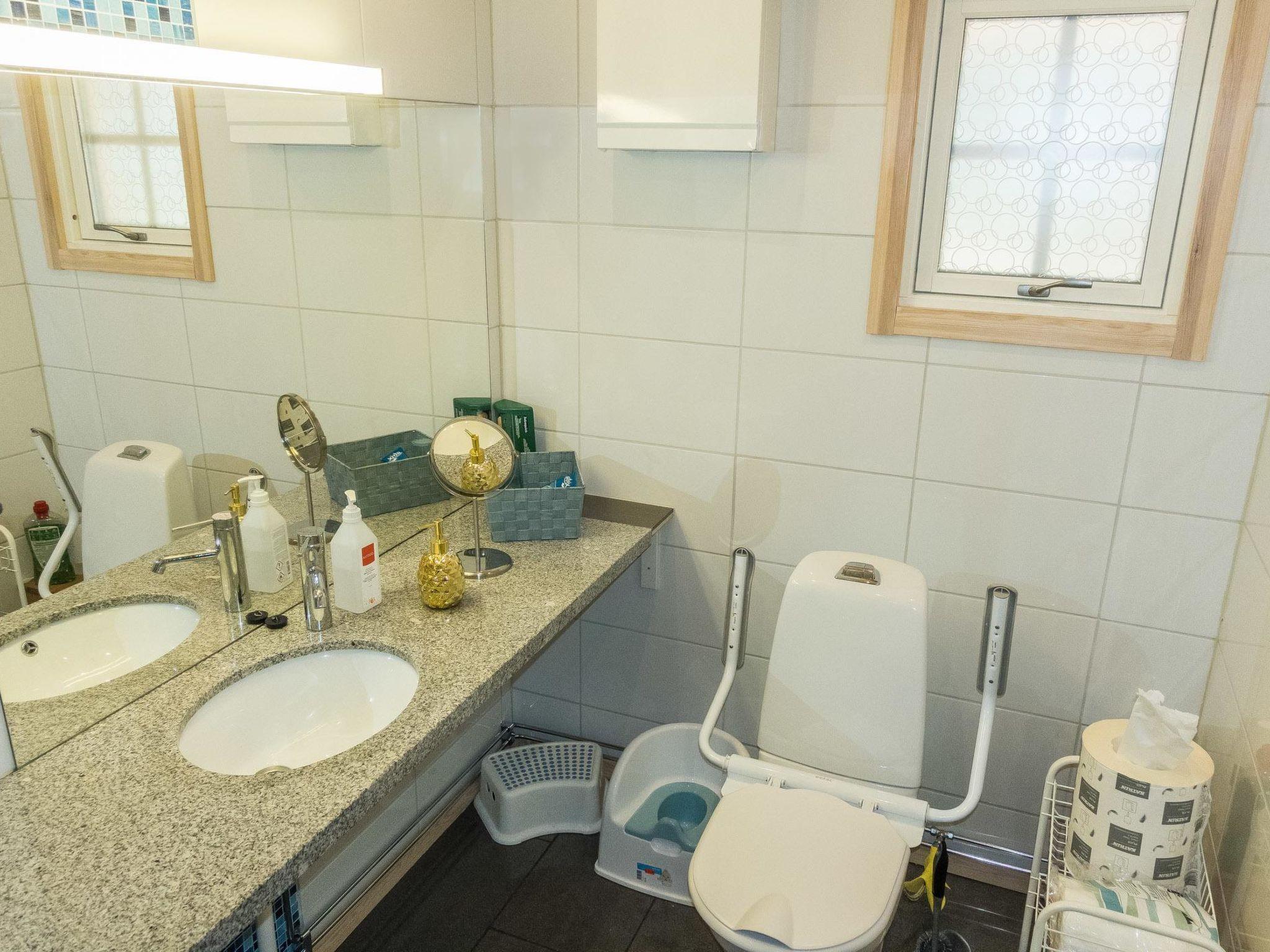 Living room/kitchen, two bedrooms, both with double bed, living area with spreadable sofa, sauna, washroom/WC, separate WC, and covered terrace.